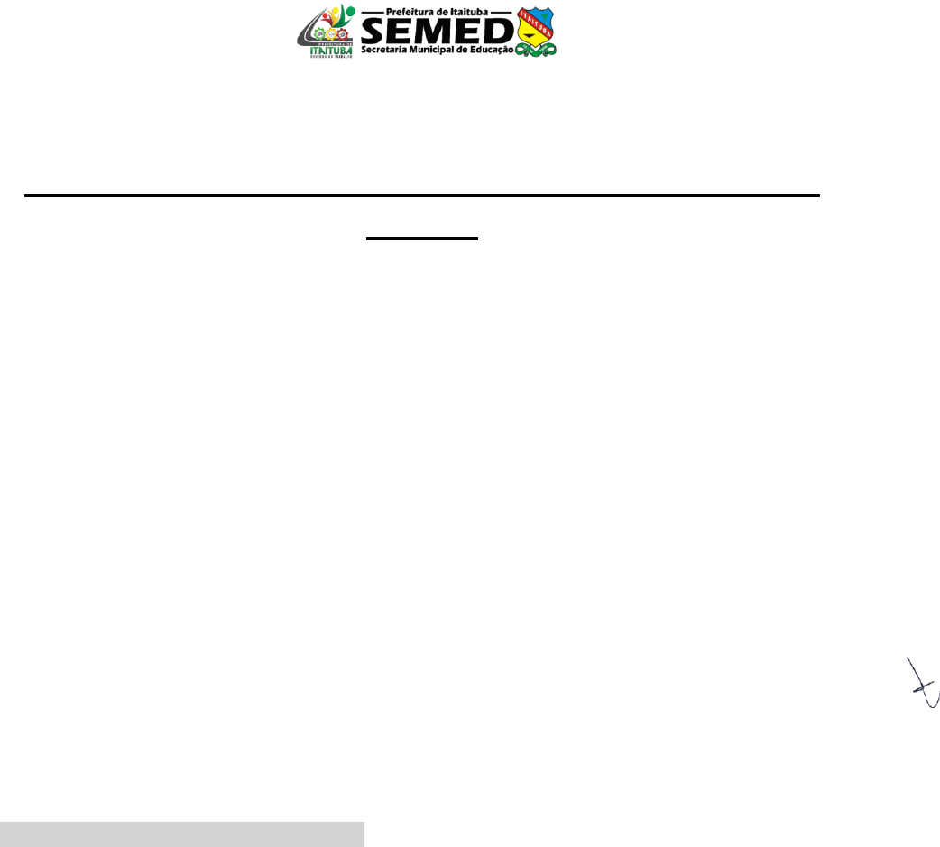 Prefeitura Municipal de Itaituba SECRETARIA MUNICIPAL DE EDUCAÇÃO – SEMED 1 3º PROCESSO SELETIVO SIMPLIFICADO DA EDUCAÇÃO PARA CADASTRO DE RESERVA EDIT AL GA B/S EM ED N° 023/2022 O MUNICÍPIO DE ITAITUBA, por intermédio da SECRETARIA MUNICIPAL DE EDUCAÇÃO – SEMED, no uso de suas atribuições legais e, considerando a necessidade de assegurar a continuidade do serviço público, na forma da Lei Municipal nº 2.485/2012 – Plano de Cargos, Carreira e Remuneração dos Trabalhadores da Educação Pública do Município de Itaituba, tendo em vista o disposto na Lei Municipal nº 2.869/2014, sobre a contratação por tempo determinado, bem como a Portaria de Lotação Nº 002/2022– GAB/SEMED, Emenda Modificativa/CMI de 10 de março de 2022, Lei Municipal N° 3.720/2022, Lei Municipal N° 3.721/2022, Lei Municipal N° 3.734/2022, divulga a realização do 3º Processo Seletivo Simplificado da Educação Para Cadastro de Reserva para selecionar candidatos à contratação por prazo determinado em funções temporárias para atender as necessidades da Secretaria Municipal de Educação de Itaituba – PA, estabelecidas neste Edital. 1. DAS DISPOSIÇÕES PRELIMINARES Os candidatos classificados por este Edital desenvolverão atividades vinculadas à SEMED, visando à manutenção do ensino regular aos alunos desta municipalidade, conforme a necessidade. A vigência dos contratos estará em conformidade com a finalização das atividades escolares definidas pelo Calendário Escolar 2022 e Portaria de Lotação Nº 002/2022– GAB/SEMED, podendo ser prorrogada e rescindida a critério da Administração Pública. O 3º Processo Seletivo Simplificado da Educação Para Cadastro de Reserva será regido por este Edital, seus Anexos, eventuais retificações e/ou aditamentos, bem como pelos diplomas legais citados em seu preâmbulo, e será executado através da Comissão instituída pela PORTARIA GAB/SEMED nº 003/2022. Este Edital contém as cláusulas e condições que regem o 3º Processo Seletivo Simplificado da Educação Para Cadastro de Reserva, e o candidato ao se inscrever, declara aceitação de todas as normas e condições previstas no mesmo. Prefeitura Municipal de Itaituba SECRETARIA MUNICIPAL DE EDUCAÇÃO – SEMED 2 O presente Edital estará disponível no Portal da Prefeitura de Itaituba https://www.itaituba.pa.gov.br e na Página do Facebook da Secretaria Municipal de Educação https://www.facebook.com/100008116277615, sendo de inteira responsabilidade do candidato sua obtenção, devendo observar os requisitos e prazos nele previstos. Os cargos, área de atuação, número de vagas, carga horária, sálario base e valor da hora-aula serão disponibilizados conforme planilhas no item 6. Os candidatos selecionados para cadastro de reserva serão convocados de acordo com a disponibilidade e necessida de que forem surgindo a critério da secretaria municipal de educação. Entende-se por CADASTRO DE RESERVA, as vagas que surgirem ou forem criadas no prazo de validade do Processo Seletivo Simplificado, condicionado à disponibilidade orçamentária e à necessidade da Secretaria Municipal de Educação de Itaituba. O Processo Seletivo Simplificado de que trata este Edital será realizado mediante as seguintes etapas: Inscrição, Análise Documental, Período Recursal, Divulgação da Classificação Final da Análise Documental e Convocação para Triagem Documental. O CANDIDATO SERÁ RESPONSÁVEL por qualquer erro ou omissão das informações prestadas no momento da inscrição. Não será cobrada taxa de inscrição. É de inteira responsabilidade do candidato, acompanhar a publicação de todos os atos, editais e comunicados referentes a este Processo Seletivo Simplificado no endereço eletrônico https://www.itaituba.pa.gov.br e na Página do Facebook da Secretaria Municipal de Educação https://www.facebook.com/100008116277615 A classificação preliminar e final dos candidatos dar-se-á através da pontuação maior para menor, para fins de contratação não serão convocados candidatos com pontuação zero (0). A classificação dos candidatos neste Processo Seletivo Simplificado não implica obrigatoriedade na sua contratação, caracterizando mera expectativa de convocação e contratação, ficando reservada à Secretaria Municipal de Educação a prerrogativa de proceder às contratações em número que atenda ao interesse e as necessidades da Administração Pública, obedecendo rigorosamente à pontuação da classificação final em ordem decrescente, invalidando o resultado com nota igual a zero. https://www.itaituba.pa.gov.br/ https://www.facebook.com/100008116277615 https://www.itaituba.pa.gov.br/ https://www.facebook.com/100008116277615 Prefeitura Municipal de Itaituba SECRETARIA MUNICIPAL DE EDUCAÇÃO – SEMED 3 Os candidatos classificados e contratados obedecerão às normas disciplinares contidas na Lei Municipal nº 2.300/2012(RJU) e alterações posteriores. Fica ciente o candidato classificado e contratado que deverá exercer suas atividades funcionais nos termos da legislação vigente, bem como cumprir as normas e critérios estabelecidos por esta municipalidade, estipulados de acordo com a necessidade dos serviços. O candidato que não atender ao prazo da Convocação para Triagem Documental, reservará à Secretaria Municipal de Educação o direito de convocar o próximo classificado. Os candidatos estarão sujeitos ao cumprimento do horário de trabalho, determinado pela Secretaria Municipal de Educação, na Instituição Escolar a que estiver vinculado, conforme a Portaria nº 002/2022 – GAB/SEMED que dispõe sobre os procedimentos para o processo de lotação do ano letivo de 2022 nas Escolas Públicas da Rede Municipal de Ensino, e, na impossibilidade de cumprimento do horário, o mesmo será automaticamente eliminado. 2. DAS ESCOLAS QUE COMPÕEM OS POLOS DA ÁREA RURAL 2.1. As escolas que compõem os Polos da Área Rural est