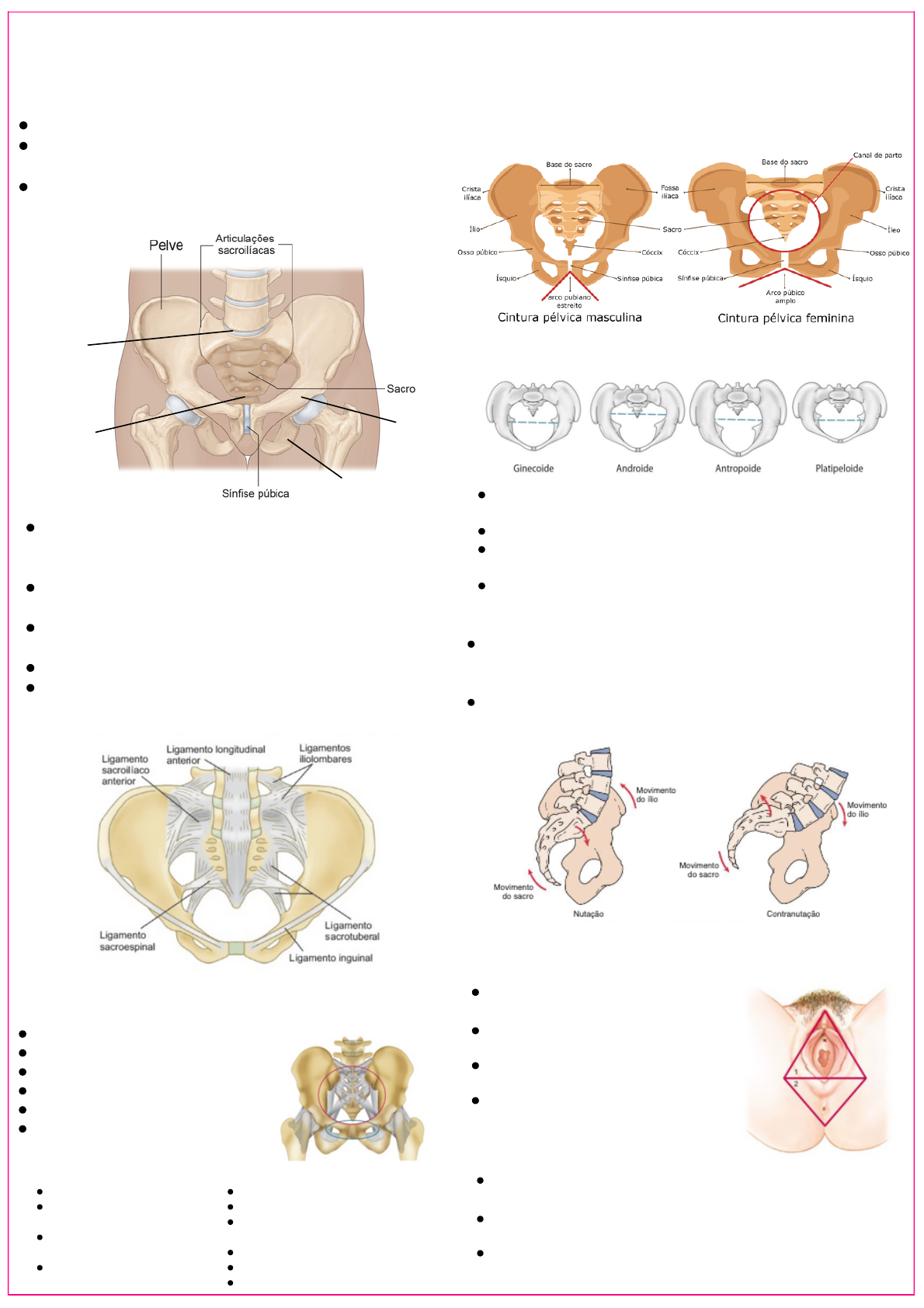 Articulação Lombossacral Articulação Sacrococcígea Ílio Púbis Isquio ANATOMIA: PELVE Região que confluem o tronco e o MMII; A estabilidade lombopélvica depende da integridade do sistema osteoligamentar, muscular e do sistema nervoso; Formada lateralmente pelos ilíacos, posteriormente pelo sacro e cóccix e anteriormente pela sínfise púbica. @fisio.stephanebispo Tem como principal função receber o peso corporal transmitido pela coluna vertebral e transferi-lo aos membros inferiores; Suas articulações são as sacroilíacas, posteriormente, e a sínfise púbica, anteriormente; As 4 partes da pelve óssea são unidos por ligamentos densos, e em 4 articulações; 2 articulações sinoviais: articulações sacroilíacas; 2 articulações cartilaginosas secundárias: sínfise púbica e a articulação sacrococcígea. Ligamento sacroilíaco interósseo; Ligamento sacroilíaco anterior; Ligamento iliolombar; Ligamento sacrotuberal; Ligamento sacroespinal; Ligamento Inguinal. Ligamentos da Pelve Pode ser dividida em pelve maior e pelve menor: Conhecida como pelve falsa; Parte da cavidade abdominal propriamente dita; Situada entre as fossas ilíacas, acima da borda da pelve; Nessa região encontramos as vísceras abdominais. Pelve maior: Conhecida como pelve verdadeira; Pelve obstétrica; Situada abaixo do plano oblíquo da borda da pelve; É a cavidade pélvica; Contém as vísceras pélvicas; Fechada pelo assoalho pélvico. Pelve menor: Pelve Masculina e Feminina Ginecóide: comum no sexo feminino, 43% das mulheres. Tipo mais espaçoso em termos obstétricos; Andróide: comum no sexo feminino, amplo diâmetro transverso; Antropóide: comum no sexo masculino, 23% - sexo feminino, diâmetro AP maior que o transverso; Platipelóide: Raro em ambos sexos. Tipos de Pelve Movimentos da Pelve A amplitude de movimento da pelve é limitada, sendo considerada entre 1 e 3 graus. Entre esses movimentos pélvicos, dois são conhecidos como NUTAÇÃO E CONTRANUTAÇÃO; Durante o período expulsivo no parto vaginal, acontece o movimento de nutação da pelve. PERÍNEO A contração do períneo resulta em um movimento crânio-frontal, elevando os órgãos pélvicos e fechando o hiato urogenital; Faz parte do sistema de sustentação da bexiga, do útero e do reto, e participa da função reprodutiva e sexual; Esses músculos também são responsáveis pela estabilidade da articulação sacro-ilíaca e do tronco. Área de superfície externa / um compartimento raso do corpo; Situa-se abaixo da cavidade pélvica, separado pelo diafragma da pelve; Região onde está situado os órgãos genitais e o ânus; É dividido em dois triângulos desiguais, por uma linha imaginária transversal que une as extremidades anteriores das tuberosidades isquiáticas; 4 ANATOMIA: PELVE @fisio.stephanebispo Assoalho Pélvico Única musculatura transversal do corpo humano que suporta carga Suporte dos órgãos abd. E pélvicos; Manutenção da continência urinária e fecal; Auxílio no aumento da pressão intra-abdominal, na respiração e na estabilização do tronco; Consiste nos tecidos que atravessam a abertura da pelve óssea e proporcionam sustentação ás vísceras pélvicas e abdominais; Tecido conectivo fibromuscular Sustenta o colo da bexiga e a uretra, e a sua inserção posterior da vagina impede que o reto faça o prolapso para a frente; Contém os nervos autonômicos para o útero e a bexiga; O assoalho é composto por 3 camadas: 1ª Camada: é a fáscia endopélvica: Os ligamentos endopélvicos estão orientados no sentido vertical e suspensos pelos órgãos pélvicos que são sustentados pela 2ªcamada, o diafragma pélvico. Aparelho de sustentação da primeira camada Isquiocavernoso; Bulboesponjoso; Tranverso superficial do períneo; Esfíncter externo do anus; Os músculos do espaço superficial do períneo são: Aparelho de sustentação: Terceira camada – Diafragma Pélvico Inervação do MAP A estimulação neural dos 2 diafragmas e dos mm. Esfíncteres externos é suprida somaticamente pelo N. pudendo, origem–medula espinhal, nível S2-S4; Os músculos esfíncteres internos ficam sob controle autonômico; O N. simpático – origem na medula T11-T12, é responsável pelas fases de armazenamento e fechamento da bexiga; O N. parassimpático é responsável pelo esvaziamento e abertura da bexiga; Segundo Tanzberger: “é simpático ser continente, é parassimpático ser mijão”; A continência requer que o músculo detrusor fique relaxado – enquanto o esfíncter se contrai; Durante a micção, o esfíncter precisa relaxar e o músculo detrusor se contrair; A continência e a micção também são reguladas pelo tronco cerebral, hipotálamo e córtex; Defecação e a manutenção da continência de fezes são regulados por mecanismos parassimpáticos sacrais, simpáticos toracolombares e somatomotores; A defecação é sustentada por controle voluntário e pressão intra-abdominal, tensionamento dos mm. Abdominais e atividade do diafragma pulmonar; VULVA Formada por: Órgãos genitais externos (monte púbico, lábios maiores e menores, clitóris, vestíbulo vaginal, bulbos do vestíbulo e glândulas vestibulares maiores e menores) Serve como tecido sensitivo e erétil durante a excitação sexual, apresenta a função de orientar o fluxo urinário; Barreira para evitar a entrada de corpo/material estranho nos órgãos genitais internos e nos órgãos do sistema urinário. 5
