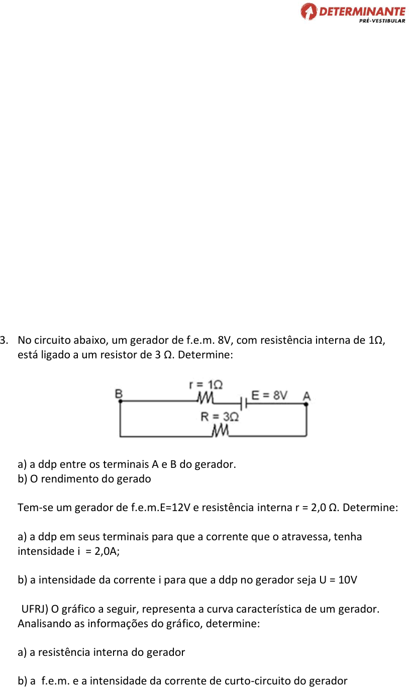 Lista de Exercícios – Geradores e Receptores 1. (UEPR) Um gerador funcionará em regime de potência útil máxima, quando sua resistência interna for igual: a) à resistência equivalente do circuito que ele alimenta; b) à metade da resistência equivalente do circuito que ele alimenta; c) ao dobro da resistência equivalente do circuito que ele alimenta; d) ao quádruplo da resistência equivalente do circuito que ele alimenta; e) à quarta parte da resistência equivalente do circuito que ele alimenta. 2. (EPUSP) Um motor, atravessado por corrente i = 10A, transforma a potência elétrica P = 80W em potência mecânica. A força contra-eletromotriz do motor: a) depende da resistência interna do motor; b) é 8,0V; c) depende do rendimento do motor; d) depende da rotação do motor; e) n.d.a 3. No circuito abaixo, um gerador de f.e.m. 8V, com resistência interna de 1Ω, está ligado a um resistor de 3 Ω. Determine: a) a ddp entre os terminais A e B do gerador. b) O rendimento do gerador 4. Tem-se um gerador de f.e.m.E=12V e resistência interna r = 2,0 Ω. Determine: a) a ddp em seus terminais para que a corrente que o atravessa, tenha intensidade i = 2,0A; b) a intensidade da corrente i para que a ddp no gerador seja U = 10V 5. (UFRJ) O gráfico a seguir, representa a curva característica de um gerador. Analisando as informações do gráfico, determine: a) a resistência interna do gerador b) a f.e.m. e a intensidade da corrente de curto-circuito do gerador. 6. Quando os terminais de uma pilha elétrica são ligados por um fio de resistência desprezível, passa por ele uma corrente de 20 A. Medindo a ddp entre os terminais da pilha, quando ela está em circuito aberto, obtém-se 1,0V. Determine f.e.m. E e a resistência interna r da pilha. 7. ESAL-MG) Um motor elétrico (receptor), de resistência interna 10Ω, está ligado a uma tomada de 200V, recebendo uma potência de 1.600W. Calcule: a) A potência elétrica dissipada internamente b) a força contra-eletromotriz do motor c) o rendimento do motor 8. (AFA) Um gerador fornece a um motor uma ddp de 440V. O motor tem resistência interna de 25 ohms e é percorrido por uma corrente elétrica de 400mA. A força contra-eletromotriz do motor, em volts, é igual a a) 375 b) 400 c) 415 d) 430 e) 200 9. (UEL-PR) No gráfico a seguir estão representadas as curvas características de um gerador e de um receptor. A f.e.m. do gerador e a resistência interna do receptor valem, respectivamente: a) 10 V e 0,1 ohm b) 10 V e 1 ohm c) 20 V e 0,1 ohm d) 40 V e 1 ohm e) 40 V e 0,1 ohm 10. (PUC – SP) No circuito da figura abaixo, a diferença de potencial Va - Vb, com a chave K aberta, e posteriormente fechada, tem valores, em volts, aproximadamente iguais a: a) 35 e 15 b) 20 e 17 c) 20 e 20 d) 5 e 5 e) 0 e 5 11. (UNESP-SP) O esquema a seguir representa duas pilhas ligadas em paralelo, com as resistências internas indicadas: a) Qual o valor da corrente que circula pelas pilhas? b) Qual é o valor da diferença de potencial entre os pontos A e B? c) Qual das duas pilhas está se “descarregando” 12. (UFCE-CE) No circuito abaixo, determine a diferença de potencial nos terminais do resistor de 2Ω. 13. (UFPE-PE) Calcule o potencial elétrico no ponto A, em volts, considerando que as baterias têm resistências internas desprezíveis e que o potencial no ponto B é igual a 15 volts. GABARITO 1 – A / 2 – B / 3a – U = E – ri = 6V ; 3b – 75% / 4a – 8V ; 4b – 1 A / 5a – R = 8 ohms ; 5b – icc = 10 A e f.e.m = 80 V / 6 – f.e.m = 1 V ; r = 0,05 ohms / 7a – 640 W ; 7b – 120 V; 7c – 60% / 8 – D / 9 – D / 10 – B / 11a – 0,05 A ; 11b – Vab = 2 V ; 11c – pilha da direita / 12 – 2 V / 13 – Va = 5 V.