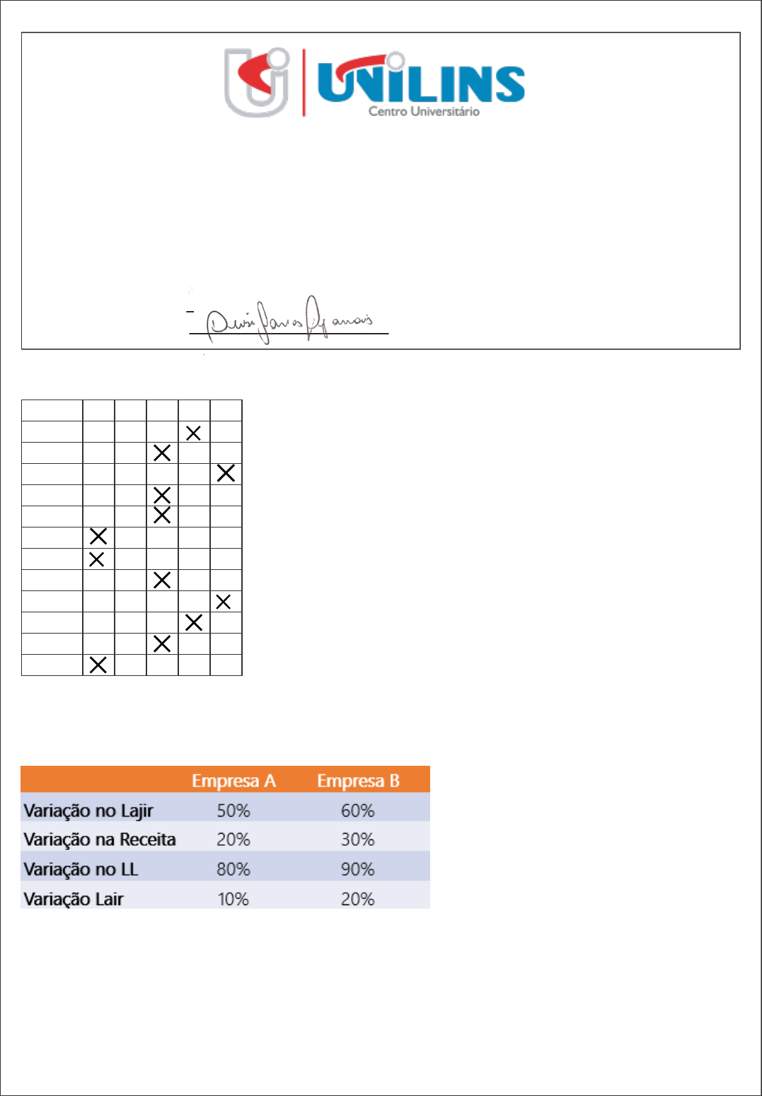 Requisição: 4499994 Matricula: 659196 Data: 03/05/2022 19:12 Página: 1/6 Prova presencial regular Curso: 24 MESES - TECNOLOGIA EM GESTÃO FINANCEIRA - UNILINS EAD Módulo: 6 Grupo: 201 Município: SÃO PAULO - SP Disciplina(s): 100991 - PLANEJAMENTO E CONTROLE FINANCEIRO Nome: 659196 - DEISE FARIAS DEGARRAIS Data: ___/___/_________ Assinatura do aluno: ________________________________________________________ Preencha o gabarito abaixo com X na coluna correta. Atente para a coluna de numeração e das alternativas. Questões A B C D E 1 2 3 4 5 6 7 8 9 10 11 12 1 ) Considere as empresas A e B, na tabela a seguir, e informe qual delas é mais alavancada. A ) A empresa A é mais alavancada no GAF e no GAC. B ) A empresa A é mais alavancada no GAO e no GAF. C ) A empresa B é mais alavancada no GAO e o GAF. 04 05 2022 Requisição: 4499994 Matricula: 659196 Data: 03/05/2022 19:12 Página: 2/6 D ) A empresa A é mais alavancada no GAO, no GAF e no GAC. E ) A empresa B é mais alavancada no GAO, no GAF e no GAC. 2 ) A determinação do fluxo de caixa incremental envolve três etapas: o cálculo do lucro líquido adicional; o cálculo das economias de imposto de renda, decorrentes da depreciação; e a soma do lucro líquido adicional com as economias proporcionadas pela depreciação adicional. Assim, de que forma obtemos o lucro líquido adicional? A ) Somando o lucro líquido estimado com o novo investimento com o lucro líquido estimado sem o novo investimento. B ) Multiplicando a alíquota do imposto de renda pela depreciação. C ) Subtraindo o lucro líquido estimado com o novo investimento do lucro líquido estimado sem o novo investimento. D ) Multiplicando o lucro pela depreciação. E ) Somando o lucro com a depreciação. 3 ) A destinação do lucro por parte da empresa pode tornar-se uma tarefa difícil de se planejar na medida em que ela encontra dois atores de interesses opostos. Quem são esses atores? A ) O longo prazo e o curto prazo B ) O acionista e a empresa C ) O médio e o longo prazo D ) O capital próprio e o capital de terceiros E ) O risco e o retorno 4 ) Se uma empresa compra sua matéria-prima no dia 2, inicia sua fabricação no dia 4, termina a produção no dia 7 e vende seu produto no dia 12, podemos afirmar que o número de dias para o estoque de produtos Requisição: 4499994 Matricula: 659196 Data: 03/05/2022 19:12 Página: 3/6 em processo é de quantos dias? A ) 2 dias B ) 10 dias C ) 3 dias D ) 6 dias E ) 8 dias 5 ) O ponto de equilíbrio operacional múltiplo (PEOM) difere dos demais pontos de equilíbrio (PE) sob qual perspectiva fundamental? A ) O PEOM leva em conta a depreciação e os demais PE não. B ) O PEOM leva em conta o lucro-meta e os demais PE não. C ) O PEOM leva em conta vários produtos e os demais PE apenas um. D ) O PEOM leva em conta as despesas financeiras e os demais PE não. E ) O PEOM leva em conta os custos indiretos e os demais PE não. 6 ) O orçamento operacional consiste em quantificar tudo o que será necessário para que o processo de produção tenha êxito em um determinado período de tempo. Para isso, identificamos nove etapas desse processo, uma delas é o orçamento da mão de obra direta (na quarta etapa). De que forma podemos calcular esse orçamento de mão de obra direta? A ) Multiplicando a quantidade da produção pelo o tempo de mão de obra vezes o valor da mão de obra por unidade. B ) Multiplicando a quantidade de vendas pelo tempo de mão de obra vezes o valor da mão de obra por unidade. C ) Diminuindo a quantidade da produção do valor da mão de obra menos o tempo de mão de obra por unidade. D ) Requisição: 4499994 Matricula: 659196 Data: 03/05/2022 19:12 Página: 4/6 Somando a quantidade da produção com o valor da mão de obra direta e o tempo de mão de obra por uma unidade. E ) Multiplicando o valor dos estoques pelo tempo de mão de obra vezes o valor da mão de obra por unidade. 7 ) A alavancagem é uma expressão utilizada na física para representar uma força aplicada a um objeto, multiplicando a força aplicada utilizando-se de um ponto de apoio. Para as ciências sociais aplicadas, implica determinar o resultado dos lucros em relação a uma variação nas vendas por exemplo. Nesses termos, podemos encontrar três tipos de alavancagem: operacional, financeira e total. Quais são as variáveis envolvidas na alavancagem operacional? A ) Receita de vendas, custo fixo e Lajir. B ) Receita de vendas, custo variável e Lajir. C ) Custo variável, custo fixo e Lair. D ) Custo variável, custo fixo e Lajir. E ) Receita de vendas, custo fixo e Lair. 8 ) A abordagem do fluxo de caixa marginal para a administração dos valores a receber oferece a rentabilidade resultante de uma mudança na política de crédito. Lucro operacional da situação proposta: R$ 100.000 Lucro operacional da situação atual: R$ 80.000 Investimento marginal: R$ 80.000 Dessa forma, encontre a rentabilidade da empresa, de acordo com as informações expostas anteriormente. A ) 35% B ) 40% C ) 25% D ) 30% E ) 20% Requisição: 4499994 Matricula: 659196 Data: 03/05/2022 19:12 Página: 5/6 9 ) Para elaborar o orçamento flexível são necessárias três etapas: na primeira, identificar a quantidade real de produção no período considerado; na segunda, calcular o orçamento flexível para receitas com base no preço de venda orçado e na quantidade real de produção; e na terceira etapa, calcular o orçamento flexível para os custos. De que forma orçamos os custos nesta etapa? A ) Com base nas informações orçadas e reais. B ) Com base somente nas informações orçadas. C ) Com base somente nas informações reais. D ) Com base somente nas informações do orçamento operacional. E ) Com base somente nas informações do orçamento estático. 10 ) Para a tomada de decisão de um novo investimento, três técnicas são amplamente empregadas: o payback, o Valor Presente Líquido e a Taxa Interna de Retorno. Em que consi