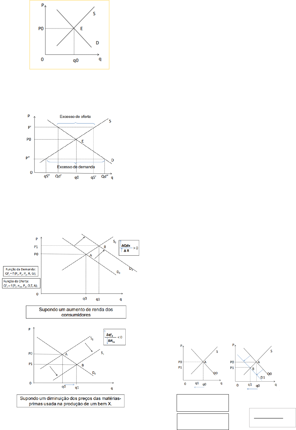 Equilíbrio de Mercado O preço em uma economia de mercado é determinado tanto pela demanda como pela oferta. Tendência ao nível de equilíbrio Lei da oferta e da demanda Mudança no ponto de equilíbrio Bem x seja normal – Ponto A, em virtude de deslocamento da demanda. Exemplo 1: Dados D = 22 - 3p (função demanda) e S = 10 + 1p (função oferta): a) Determine o preço de equilíbrio e a respectiva quantidade. D = S 22 - 3p = 10 + 1p -3p -1p = 10 -22 (-1) P = 12/4 = 3 D = 22 -3 (3) = 13 S = 10 + 1(3) = 13 b) Se o preço for R$ 4,00, existe excesso de oferta ou de demanda? Qual a magnitude desse excesso? D = 22 -3 (4) = 10 = qd S = 10 + 1(4) = 14 = qS Portanto, qS > qd, existe um excesso de oferta de 4 Exemplo 2: Dados qdx = 2 – 0,2 (Px) + 0,03 (R) e qSx = 2 + 0,1 (Px) e supondo a renda R = 100, pede-se: a) Preço e quantidade de equilíbrio do bem x. qdx = qSx 2 – 0,2 (Px) + 0,03 (R) = 2 + 0,1(pX) - 0,2Px - 0,1 Px = 2 - 2 -3 - Px = - 3/0,3 (-1) Px = 10 qdx = 2 – 0,2 (10) + 0,03 (100) qdx = 3 qSx = 2 + 0,1(10) qSx = 3 b) Supondo um aumento de 20% da renda, determinar o novo preço e a quantidade de equilíbrio do bem x. qdx = qSx 2 - 0,2px + 0,03 (R) = 2 + 0,1px - 0,2px – 0,1px = 2 - 2 -0,03 (120) (-1) 0,3px = 3,6 Px = 12 Exemplo 3: Explique e ilustre graficamente o que ocorre com o equilíbrio de mercado, nos seguintes casos: a) Aumento do preço de um bem complementar; Função da Demanda: QdI = f (PI, PS, PC, R, G) Função da Oferta: QSi = f (Pi, m, Pn, O, T) Qdx = f (Py): d manteiga P pão < 0 b) Diminuição do preço de um bem substituto, no consumo; c) Diminuição na renda dos consumidores, de um bem inferior; d) Diminuição no custo da mão-de-obra. Qd = Qs 5.000 – 120P = 1.000 + 80p -120P – 80P = 1.000 – 5.000 (-1) P = 4.000/200 = 20 5.500 – 132P = 1.000 + 80P -132P -80P = 1.000 -5.500 (-1) P = 4.500 / 212 = 21,2 120 x 10% = 12 d margarina P manteiga > 0 d carne2° R < 0 x S m < 0