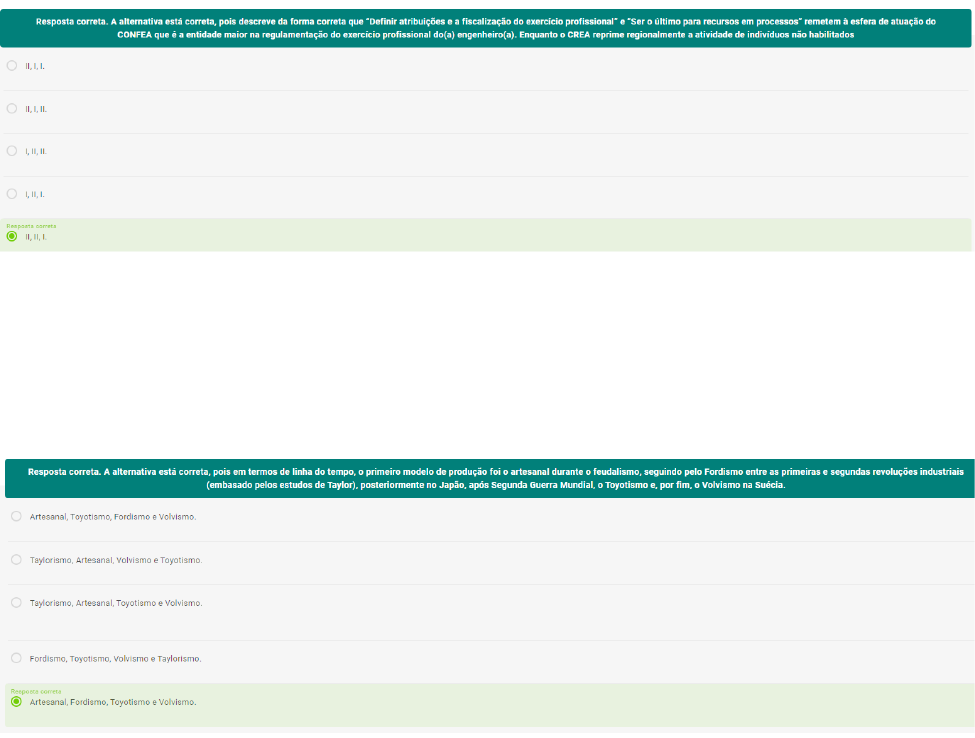 Engenharia e Inovação 1 - O Sistema CREA e CONFEA são as principais referências no que diz respeito a regimentos, leis, códigos e afins para o exercício profissional do(a) engenheiro(a). Possuem objetivos e funções diferentes, porém complementares. Considerando o trecho apresentado, associe os objetivos do Crea e do Confea com sua respectiva descrição, conforme listado a seguir, da forma correta. I - Crea. II - Confea. ( ) Definir atribuições e a fiscalização do exercício profissional. ( ) Ser o último para recursos em processos. ( ) Reprimir a atividade de indivíduos não habilitados. A partir das relações feitas anteriormente, assinale a alternativa que apresenta a sequência correta. 2 - Os sistemas produtivos ao longo da história extrapolam meros apanhados de ferramentas. Esses sistemas foram filosofias ou modelos operacionais que impactaram vários nichos produtivos e sociedades. O desenvolvimento de novas formas de processar produtos e serviços embasaram as revoluções industriais. Assinale a alternativa que apresenta a sequência cronológica correta da criação dos principais modelos produtivos. 3 - Leia o trecho a seguir. “[...] O toyotismo é um estágio superior de racionalização do trabalho, que não rompe, a rigor, com a lógica do taylorismo e fordismo (é por isso que alguns autores, como Aglieta e Palloix, o denominam de “neofordismo”). Entretanto, no campo da gestão da força de trabalho, o toyotismo realiza um salto qualitativo na captura da subjetividade do trabalho pelo capital [...]” (ALVES, 2003, p. 4). ALVES, G. Toyotismo, novas qualificações e empregabilidade: mundialização do capital e a educação dos trabalhadores no século XXI. Revista Educação, Maceió, v. 10, n.16, p. 1-15, 2003. No que diz respeito ao Toyotismo e a relação como trabalhador, analise as afirmativas a seguir e assinale V para a(s) verdadeira(s) e F para a(s) falsa(s). I. ( ) O Toyotismo diferentemente do Fordismo estimulava a qualificação do trabalhador. II. ( ) O Toyotismo diferentemente do Fordismo usava da divisão do trabalho nas tarefas. III. ( ) O Toyotismo diferentemente do Fordismo admitia e criava os meios para o emprego vitalício. IV. ( ) O Toyotismo diferentemente do Fordismo estimulava a promoção clara e transparente do trabalhador. Assinale a alternativa que apresenta a sequência correta das afirmativas. 4 - Segundo Martin e Schinzinger (1988), a engenharia é a área profissional mais representativa quantitativamente, a qual influencia a sociedade em muitas áreas do cotidiano da população. Por exemplo, o ato e atividade de um cirurgião afeta um paciente de cada vez; enquanto o juízo/parecer de um profissional de engenharia pode influenciar milhares de vidas de uma só vez. Segundo esse pressuposto, o fato do(a) engenheiro(a) atuar de forma ética tem impacto direto para toda a sociedade. MARTIN, M.; SCHINZINGER, R. Engineering Ethics. McGraw-Hill: New York, 1988. Neste contexto, analise as asserções e suas relações. I. O trabalhar com ética não afeta o desempenho técnico do serviço prestado. Pois: II. O Código de Ética Profissional do CONFEA descreve direitos e deveres relacionados à prática profissional. A seguir, assinale a alternativa correta. 5 - O Fordismo foi de fato o primeiro sistema fabril que revolucionou economias e sociedades, sendo responsável inclusive pelo surgimento do conceito de produção e consumo em massa. Esse sistema se baseou em alguns pressupostos de organização dos trabalhadores e seus respectivos postos de trabalhos e tarefas. Neste sentido, assinale a alternativa que apresenta o conceito desenvolvido nos estudos de Taylor e aplicado no fordismo. 7 - Leia o trecho a seguir. “[...] A profissão de engenheiro foi regulamentada no Brasil pelo Decreto Federal nº. 23.569/1933, que “Regula o exercício das profissões de engenheiro, de arquiteto e de agrimensor”. Neste Decreto estavam previstas as seguintes modalidades: engenharia civil; arquiteto ou engenheiro-arquiteto; engenharia industrial; engenharia mecânica eletricista; engenharia eletricista; engenharia de minas; agrimensor - engenharia agrônoma; e geografia. Através desse decreto foram criados os Conselhos Regionais de Engenharia e Arquitetura (CREA) [...]”. DALLABONA, C. A.; SCHIEFLER, F.; MARCOS, F. O.; WALENIA, P. S. Novo Sistema de Habilitação Profissional das Engenharias no Brasil: Histórico e Características. LACCEI International Latin American and Caribbean Conference for Engineering and Technology, México, 2007. Sobre o exercício regulamentado do(a) profissional de engenharia, analise as afirmativas a seguir e assinale V para a(s) verdadeira(s) e F para a(s) falsa(s). I. ( ) O exercício da Arquitetura e Urbanismo atualmente é separada em um diferente conselho de classe. II. ( ) CONFEA ou Conselho Federal de Engenharia e Agronomia, possui diferenciação regional. III. ( ) O primeiro decreto federal que regulamenta o exercício da profissão de engenheiro data de 1933. IV. ( ) O CONFEA não pode versar sobre a ética profissional no exercício do engenheiro(a). Assinale a alternativa que apresenta a sequência correta. 7 - Leia o trecho a seguir. “[...] Abrange um conjunto de tecnologias de ponta ligadas à internet com objetivo de tornar os sistemas de produção mais flexíveis e colaborativos. Nessa abordagem, as máquinas usam auto-otimização, autoconfiguração e até mesmo inteligência artificial para completar tarefas complexas, a fim de proporcionar eficiências de custo muito superiores e bens ou serviços de melhor qualidade [...]” (SANTOS et al., 2018, p. 112). SANTOS, B. P.; ALBERTO, A.; LIMA, T. D. F. M.; CHARRUA-SANTOS, F. M. B. Indústria 4.0: desafios e oportunidades. Revista Produção e Desenvolvimento, Rio de Janeiro, v. 4, n. 1, p. 111-124, 2018. Assim, assinale a alternativa correta que cita algum princípio fundamental a implementação da Indústria 4.0. 8 - Existiu um longo 