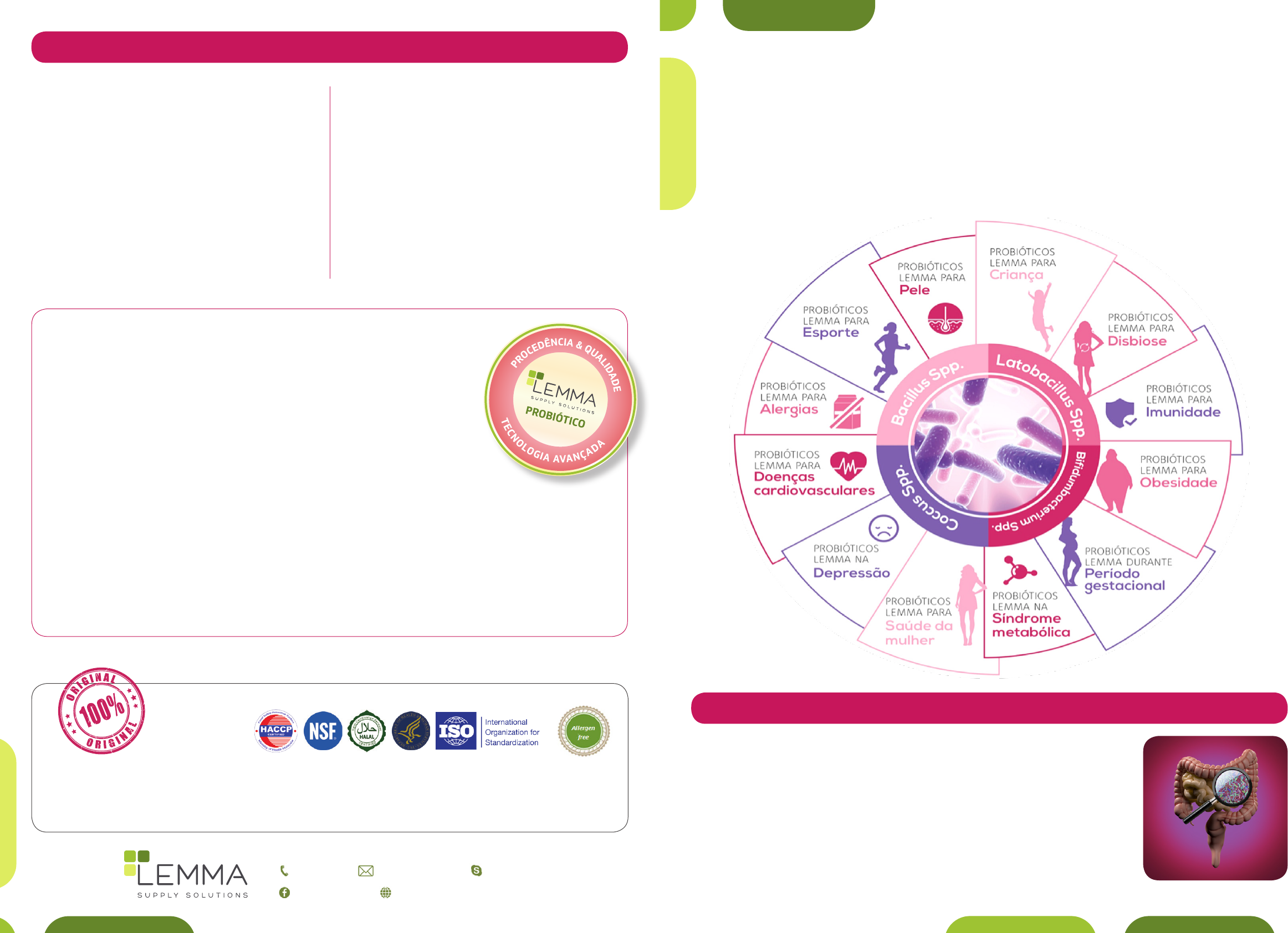 Probióticos LEMMA – Garantia de qualidade e eficácia internacionais (11) 5044-7234 lemma@lemma.com.br lemma.supply www.lemma.com.br /lemma.supply VOCÊ SABIA? Os probióticos LEMMA possuem qualidade assegurada, todos os produtos são importados na embalagem original do fabricante. Assim, garantimos a segurança e eficácia, minimizamos riscos e contaminações, tudo para garantir a saúde do seu paciente. Os probióticos LEMMA são liofilizados, possuem garantia de procedência e inúmeros certificados internacionais de qualidade. Probióticos LEMMA: a melhor e mais segura escolha para seu paciente. SOMENTE Probióticos importados e distribuídos de origem dos fabricantes qualificados pela LEMMA Supply, são consid- erados livres de substâncias alergênicas. Solicite maiores informações. CERTIFICADOS INTERNACIONAIS DE QUALIDADE Probióticos Liofilizados LEMMA SUPPLY Referência e variedade em probióticos com tecnologia de crioproteção patenteada. Probióticos Liofilizados LEMMA Lactobacillus spp. L. acidophilus L. crispatus L. curvatus L. delbrueckii (sub. L. bulgaricus) L. fermentum L. gasseri L. helveticus L. johnsonii L. paracasei L. plantarum L. reuteri L. rhamnosus L. salivarius Bifidobacterium spp. B. adolescentis B. lactis B. bifidum B. breve B. infantis B. longum Coccus spp. Enterococcus faecium Lactococcus lactis Streptococcus thermophillus Levedura Sacharomyces boulardii Bacillus spp. Bacillus clausii Bacillus coagulans (L.sporogenes) Bio-MAMPs Bio-MAMPs B. lactis Bio-MAMPs L. acidophilus Bio-MAMPs L casei Bio-MAMPs L. gasseri Bio-MAMPs L. rhamnosus Bio-MAMPs L. helveticus Bio-MAMPs S. thermophilus Como selecionar probióticos biodisponíveis e estáveis? • O fabricante dos probióticos possui o registro da identidade genética da cepa realizada através de biologia molecular? • Foram realizados testes de resistência aos antibióticos? • Foram realizados testes de alergenicidade? • Foram realizados testes de resistência aos sais biliares? • Foram realizados testes de estabilidade das cepas? • Foram realizados estudos de segurança para uso em humanos? TODOS OS PROBIÓTICOS LEMMA POSSUEM OS PRÉ-REQUISITOS NECESSÁRIOS DE BIODISPONILIDADE E ESTABILIDADE. Identidade gênica dos probióticos Uma cepa probiótica é catalogada pelo gênero, espécie (subespécie) e uma identificação alfanumérica. A identificação dos probióticos é baseada em métodos da biologia molecular de amplificação do gene codificador do RNA ribossomal do gene 16S com posterior sequenciamento gênico. DESSA MANEIRA CADA CEPA É CLASSIFICADA E IDENTIFICADA POR CADA FABRICANTE. ASSIM, É POSSÍVEL OBTER CONTROLE DE QUALIDADE EXTREMAMENTE RIGOROSO DOS PROBIÓTICOS. PROCEDÊNCIA DOS PROBIÓTICOS LEMMA Probióticos são micro-organismos vivos e por se tratar de uma matéria-prima biológica, a procedência das cepas é de EXTREMA IMPORTÂNCIA. A LEMMA, após um longo processo de qualificação, selecionou apenas os melhores fabricantes mundiais de probióticos. Todas as cepas probióticas comercializadas pela LEMMA apresentam certificações internacionais de qualidade. A garantia de qualidade é certificada pelos fabricantes, através de identificação genética dos probióticos pelo meio das mais avançadas tecnologias de biologia molecular. Dessa maneira, os probióticos LEMMA são considerados seguros, eficazes e ainda totalmente livres de substâncias alergênicas. A procedência e qualidade dos probióticos irá consequentemente determinar a eficácia e sucesso do tratamento do seu paciente. A LEMMA comercializa as melhores e mais eficazes cepas do mercado internacional. O selo de procedência e qualidade LEMMA é a garantia internacional de eficácia clínica dos probióticos. EXIJA O SELO DE QUALIDADE E TECNOLOGIA DE PROCEDÊNCIA LEMMA. PROBIÓTICOS LIOFILIZADOS EXCLUSIVOS E INOVADORES CEPAS APLICAÇÕES DOSAGENS (UFC) Bacillus clausii LEMMA Bacillus coagulans (L. sporogenes) LEMMA Bifidobacterium adolescentis LEMMA Bifidobacterium animalis LEMMA (sub. B. lactis) Bifidobacterium bifidum LEMMA Bifidobacterium breve LEMMA Bifidobacterium infantis LEMMA Bifidobacterium longum LEMMA Lactobacillus acidophilus LEMMA Lactobacillus crispatus LEMMA Lactobacillus curvatus LEMMA Lactobacillus delbrueckii LEMMA (sub. L. bulgaricus) Lactobacillus fermentum LEMMA Lactobacillus gasseri LEMMA Lactobacillus helveticus LEMMA Lactobacillus johnsonii LEMMA Lactobacillus paracasei LEMMA Lactobacillus plantarum LEMMA Lactobacillus reuteri LEMMA Lactobacillus rhamnosus LEMMA Lactobacillus salivarius LEMMA Enterococcus faecium LEMMA Lactococcus lactis LEMMA Streptococcus thermophillus LEMMA Sacharomyces boulardii LEMMA Bio-MAMPs B. lactis Bio-MAMPs L. acidophilus Bio-MAMPs L. casei Bio-MAMPs L. gasseri Bio-MAMPs L. helveticus Bio-MAMPs L. rhamnosus Bio-MAMPs S. thermophilus IBS Care® A le rg ia s a lim e n ta re s A c n e , i n fl a m a ç ã o c u tâ n e a A lt e ra ç õ e s d ig e st iv a s A n ti -a g in g , f o to e n v e lh e c im e n to A n ti b io ti c o te ra p ia A te ro sc le ro se A u ti sm o C a n d id ía se C e lía c o s e a le rg ia a o g lú te n C o lit e C o n st ip a ç ã o i n te st in a l C o le st e ro l e t ri g lic é ri d e s D ia b e te s D is b io se D iv e rt ic u lit e D e so rd e n s c o m p o rt a m e n to D o e n ç a d e C ro h n D o e n ç a s m e ta b ó lic a s D ia rr e ia e g a se s E c z e m a E st e a to se h e p á ti c a H ip e rt e n sã o Im u n id a d e S ín d ro m e c ó lo n i rr it á v e l In to le râ n c ia a o g lú te n In to le râ n c ia à l a c to se In fl a m a ç ã o , a rt ri te H ip e rp ig m e n ta ç ã o , m e la sm a O b e si d a d e P e rf o rm a n c e a tl e ta s P si c o b ió ti c o s P so rí a se S a ú d e a tl e ta S a ú d e c ri a n ç a s S a ú d e n a g e st a ç ã o S a ú d e m u lh e r S a ú d e r e sp ir a tó ri a S a ú d e u ro g e n it a l S a ú d e o ra l S a ú d e t ra to g a st ro in te st in a l S 