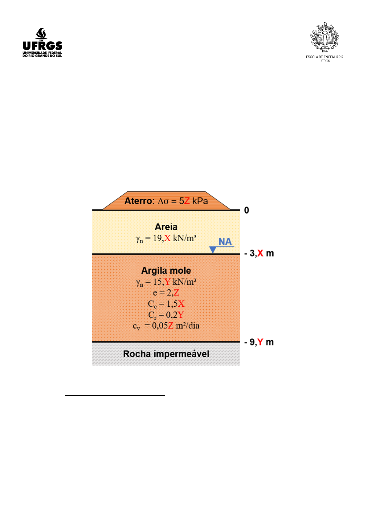 Departamento de Engenharia Civil – DECIV ENG01133 – Mecânica dos solos I Prova 2 – 2020/1 Professora Thaís Radünz Kleinert Nome: Larry da Silva Tronchoni. Cartão (nnnnnXYZ): 00262600. Questão 1 (3 pontos) No passado, a camada superficial de areia apresentada no esquema abaixo possuía uma espessura 1,6 m maior. Após processo de erosão, a espessura da camada reduziu-se, conforme esquema, causando o sobre-adensamento do solo da região. a) Calcule o recalque por adensamento (ρ) que ocorreria no centro da camada de argila mole se fosse construído um aterro sobre o terreno (conforme esquema). Cálculo da tensão efetiva antes do carregamento: σ' 𝑣1 = 19, 6∙3, 6 + 2, 7∙15, 0( ) − 2, 7∙10 = 84, 06 𝑘𝑃𝑎 Cálculo da tensão efetiva após o carregamento: σ' 𝑣2 = 84, 06 + 50 = 134, 06 𝑘𝑃𝑎 Cálculo da tensão efetiva de pré-adensamento: σ' 𝑝𝑎 = σ' 𝑣1 + 1, 6∙19, 6( ) = 84, 06 + 31, 36 = 115, 42 𝑘𝑃𝑎 ρ = 𝐻1+𝑒 𝐶𝑟∙𝑙𝑜𝑔 σ' 𝑝𝑎 σ' 𝑣1 + 𝐶 𝑐 ∙𝑙𝑜𝑔 σ' 𝑣2 σ' 𝑝𝑎 ( ) ρ = 5,41+2,0 0, 20∙𝑙𝑜𝑔 115,42 84,06 + 1, 56∙𝑙𝑜𝑔 134,06 115,42( ) ρ = 5,41+2,0 0, 20∙0, 138 + 1, 56∙0, 065( ) ρ = 5,41+2,0 0, 129( ) ρ = 0, 232 𝑚 b) Calcule o tempo para que ocorra 70% do recalque (t). 𝐶 𝑣 ∙𝑡 𝐻 𝑑 2 = 𝑇 𝑡 70 = 0,403∙5,4 2 0,050 = 235, 03 𝑑𝑖𝑎𝑠 (“H” foi escolhido como sendo o tamanho inteiro da camada, pois a base do solo é rocha impermeável). (“T” foi encontrado utilizando a tabela fornecida na lista de exercícios sobre teoria do adensamento unidimensional). c) Calcule a pressão neutra (u) no centro da camada para o tempo (t) obtido no item “b”. No ábaco: 𝑍 = 𝑧𝐻 𝑑 = 2,75,4 = 1 2 𝑈 𝑧 = 0, 66 Falta dissipar do carregamento do aterro: 𝑢 𝑐 = σ 0 • 1 − 𝑈 𝑧( ) = 50∙0, 34 = 17 𝑘𝑃𝑎 Poropressão em função do nível d`água: 𝑢 𝑎 = 10∙2, 7 = 27 𝑘𝑃𝑎 𝑢 = 𝑢 𝑐 + 𝑢 𝑎 = 17 + 27 𝑢 = 44 𝑘𝑃𝑎 Questão 2 (2 pontos) Está sendo realizado um estudo geotécnico de um maciço arenoso, com a finalidade de obter informações para o projeto de um aterro de grande porte. Para contribuir com a execução desse grande projeto, você deverá determinar os parâmetros pedidos nos itens “a”, “b” e “c”. a) Considerando a fase inicial da obra (estado em repouso), calcule o valor (em kPa) das tensões efetivas normal e de cisalhamento que atuam num plano que forma um ângulo α = 36º com o plano horizontal, sabendo que a tensão efetiva principal maior e a tensão efetiva principal menor são iguais a 160 kPa e 80 kPa, respectivamente. Tensão normal efetiva: σ α = σ 1 +σ 3 2 + σ 1 −σ 3 2 • cos 𝑐𝑜𝑠 (2α) σ α = 160+802 + 160−80 2 • cos 𝑐𝑜𝑠 (72°) σ α = 132, 36 𝑘𝑃𝑎 Tensão de cisalhamento: τ α = σ 1 −σ 3 2 • sin 𝑠𝑖𝑛 2α( ) τ α = 160−802 • sin 𝑠𝑖𝑛 72°( ) τ α = 38, 04 𝑘𝑃𝑎 b) Utilizando o critério de Mohr-Coulomb no estudo da resistência do solo, estime o valor do ângulo de atrito interno do mesmo, admitindo que o intercepto coesivo seja nulo e dispondo, apenas, dos resultados de um ensaio de compressão triaxial CD (adensado drenado) que, no estado de ruptura, forneceu os seguintes dados: σ’1 = 206 kPa e σ’3 = 80 kPa. Sendo a coesão c = 0, a reta que forma o ângulo de atrito interno partirá da origem e tangenciará o círculo de Mohr resultante do ensaio, logo pode ser calculado da seguinte forma: sin 𝑠𝑖𝑛 ϕ = σ 1 −σ 3 σ 1 +σ 3 sin 𝑠𝑖𝑛 ϕ = 206−80206+80 ϕ = 126286 ϕ = 26, 14° c) Fazendo-se um ensaio de cisalhamento direto nessa areia, com a mesma compacidade, e com uma tensão normal de 100 kPa, qual seria a tensão cisalhante na ruptura? tan 𝑡𝑎𝑛 ϕ = τσ tan 𝑡𝑎𝑛 26, 14° = τ100 τ = 100∙ tan 𝑡𝑎𝑛 26, 14° τ = 49, 08 𝑘𝑃𝑎 Questão 3 (2 pontos) Uma argila saturada, não estruturada, apresenta uma tensão de pré-adensamento, em compressão isotrópica, de 106 kPa, correspondente a um índice de vazios de 3,0. Seu índice de compressão é igual a 1,00 e seu índice de recompressão é igual a 0,16. O círculo de Mohr apresentado abaixo demonstra o comportamento dessa argila quando submetida a um ensaio triaxial CD. Também se registrou que, no momento da ruptura, a variação de volume do corpo de prova foi de 10,00%. a) Determine a envoltória de resistência dessa argila para tensões acima da tensão de pré-adensamento. sin 𝑠𝑖𝑛 ϕ = σ 1 −σ 3 σ 1 +σ 3 sin 𝑠𝑖𝑛 ϕ = 200−106200+106 ϕ = 94306( ) ϕ = 17, 89° b) Outro ensaio CD foi realizado com a mesma argila, com confinante igual ao dobro da tensão confinante do ensaio anterior. Pergunta-se: (1) qual a tensão desviadora na ruptura? (2) qual o índice de vazios do corpo de prova após a aplicação da pressão confinante? e (3) qual o índice de vazios na ruptura? σ 1 − σ 3 = σ 3 • 2∙sin𝑠𝑖𝑛 ϕ 1−sin𝑠𝑖𝑛 ϕ σ 1 − σ 3 = 212∙ 2∙sin𝑠𝑖𝑛 17,89° 1−sin𝑠𝑖𝑛 17,89° b.1) σ 1 − σ 3 = 188 𝑘𝑃𝑎 𝑒 1 − 𝑒 2 = 𝐶 𝑐 ∙(log 𝑙𝑜𝑔 σ' 2 − log 𝑙𝑜𝑔 σ' 1 ) 𝑒 1 − 𝑒 2 = 1∙(log 𝑙𝑜𝑔 212 − log 𝑙𝑜𝑔 106) 𝑒 1 − 𝑒 2 = 0, 3 3 − 𝑒 2 = 0, 3 𝑒 2 = 3 − 0, 3 b.2) 𝑒 2 = 2, 7 (𝑒 1 − 𝑒 2 ) = ℇ 𝑣 ∙(1 + 𝑒 1 ) (𝑒 1 − 𝑒 2 ) = 0, 1∙(1 + 2, 7) (𝑒 1 − 𝑒 2 ) = 0, 37 𝑒 2 = 2, 7 − 0, 37 b.3) 𝑒 2 = 2, 33 Questão 4 (2 pontos) Com a argila citada na questão 3 foram realizados ensaios de compressão triaxial CD aplicando-se três pressões confinantes distintas, observando-se ruptura conforme os dados apresentados na tabela abaixo. Ensaio Pressão confinante, σ’3 (kPa) Razão de resistência (σd/σ’3) 1 76 2,30 2 60 2,56 3 40 2,90 a) Determine a razão de sobre-adensam