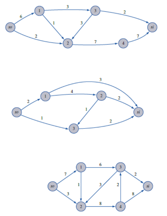 LISTA 5 Centro Federal de Educação Tecnológica Celso Suckow da Fonseca Departamento de Engenharia de Produção Disciplina: Pesquisa Operacional II Tema: Problema do Fluxo Máximo Professor: Ormeu Coelho da Silva Júnior 1 – Encontre o corte mínimo entre fonte (so) e sumidouro (si) nas redes 1, 2 e 3, abaixo ilustradas. A seguir encontre os fluxos através da rede que maximizam o fluxo entre so e si. Além disso, construa um PPL que possa ser usado para determinar o fluxo máximo na rede. (a) Rede 1 (b) Rede 2 (c) Rede 3 2 – Uma estação de tratamento de esgoto precisa determinar sua máxima capacidade de tratamento em termos da vazão (em 103 m3/s). A rede abaixo ilustra as conexões existentes entre o ponto de recebimento dos efluentes (vértice A), os tanques de tratamento (vértices D a E) e o ponto de despejo da água tratada (vértice F). Os arcos indicam as possíveis conexões e os valores as capacidades (em 103 m3/s). (a) Determine, por inspeção, o corte de menor capacidade nesta rede. A partir dele, pode-se dizer qual o valor do fluxo máximo ou pelo menos estabelecer um limite superior para ele? (b) Empregue o algoritmo de Ford-Fulkerson para determinar os fluxos em cada arco que maximizam a quantidade de esgoto tratada. 3 – Quatro trabalhadores estão disponíveis para executar as tarefas 1-4. Infelizmente, três trabalhadores só podem executar determinadas tarefas: trabalhador 1, apenas a tarefa 1; trabalhador 2, apenas as tarefas 1 e 2; trabalhador 3, apenas a tarefa 2, trabalhador 4, qualquer tarefa. Desenhe a rede para o problema de fluxo máximo que possa ser usada para determinar se todas as tarefas podem ser atribuídas a um trabalhador adequado. 4 – As famílias Araújo, Braga, Coelho e Duarte estão indo para o seu churrasco familiar anual. Quatro carros estão disponíveis para transportar as famílias para o churrasco. Os carros podem transportar o seguinte número de pessoas: carro 1, quatro; carro 2, três; carro 3, três; carro 4, quatro. Existem quatro pessoas em cada família e nenhum carro pode transportar mais de duas pessoas de nenhuma família. Formule o problema de transportar o maior número possível de pessoas para o churrasco como um problema de fluxo máximo. 5 – Suponha que a capacidade de processamento de cada tanque intermediário indicado no exercício 2 é de 8x103m3. Como seria possível representar essa restrição através de uma restrição de capacidade de arco de modo que o problema ainda pudesse ser resolvido pelo algoritmo de Ford-Fulkerson para achar o fluxo máximo entre A e F. Breno Realce