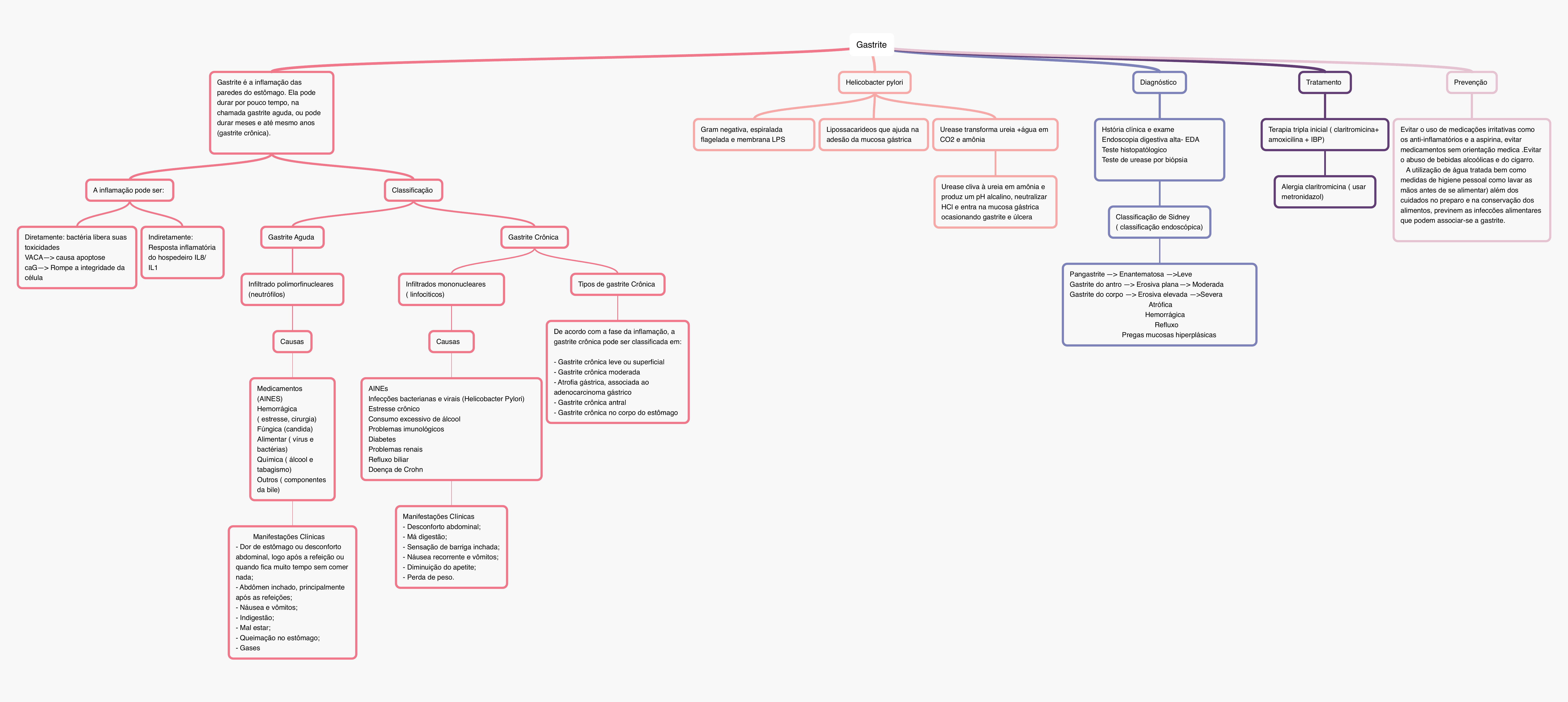 Gastrite Gastrite é a inflamação das paredes do estômago. Ela pode durar por pouco tempo, na chamada gastrite aguda, ou pode durar meses e até mesmo anos (gastrite crônica). A inflamação pode ser: Diretamente: bactéria libera suas toxicidades VACA—> causa apoptose caG—> Rompe a integridade da célula Indiretamente: Resposta inflamatória do hospedeiro IL8/ IL1 Classificação Gastrite Aguda Infiltrado polimorfinucleares (neutrófilos) Causas Medicamentos (AINES) Hemorrágica ( estresse, cirurgia) Fúngica (candida) Alimentar ( vírus e bactérias) Química ( álcool e tabagismo) Outros ( componentes da bile) Manifestações Clínicas - Dor de estômago ou desconforto abdominal, logo após a refeição ou quando fica muito tempo sem comer nada; - Abdômen inchado, principalmente após as refeições; - Náusea e vômitos; - Indigestão; - Mal estar; - Queimação no estômago; - Gases Gastrite Crônica Infiltrados mononucleares ( linfociticos) Causas AINEs Infecções bacterianas e virais (Helicobacter Pylori) Estresse crônico Consumo excessivo de álcool Problemas imunológicos Diabetes Problemas renais Refluxo biliar Doença de Crohn Manifestações Clínicas - Desconforto abdominal; - Má digestão; - Sensação de barriga inchada; - Náusea recorrente e vômitos; - Diminuição do apetite; - Perda de peso. Tipos de gastrite Crônica Helicobacter pylori Gram negativa, espiralada flagelada e membrana LPS Lipossacarideos que ajuda na adesão da mucosa gástrica Urease transforma ureia +água em CO2 e amônia Urease cliva à ureia em amônia e produz um pH alcalino, neutralizar HCl e entra na mucosa gástrica ocasionando gastrite e úlcera Diagnóstico Hstória clínica e exame Endoscopia digestiva alta- EDA Teste histopatólogico Teste de urease por biópsia Classificação de Sidney ( classificação endoscópica) Pangastrite —> Enantematosa —>Leve Gastrite do antro —> Erosiva plana—> Moderada Gastrite do corpo —> Erosiva elevada —>Severa Atrófica Hemorrágica Refluxo Pregas mucosas hiperplásicas Tratamento Terapia tripla inicial ( claritromicina+ amoxicilina + IBP) Alergia claritromicina ( usar metronidazol) Prevenção Evitar o uso de medicações irritativas como os anti-inflamatórios e a aspirina, evitar medicamentos sem orientação medica .Evitar o abuso de bebidas alcoólicas e do cigarro. A utilização de água tratada bem como medidas de higiene pessoal como lavar as mãos antes de se alimentar) além dos cuidados no preparo e na conservação dos alimentos, previnem as infeccões alimentares que podem associar-se a gastrite.