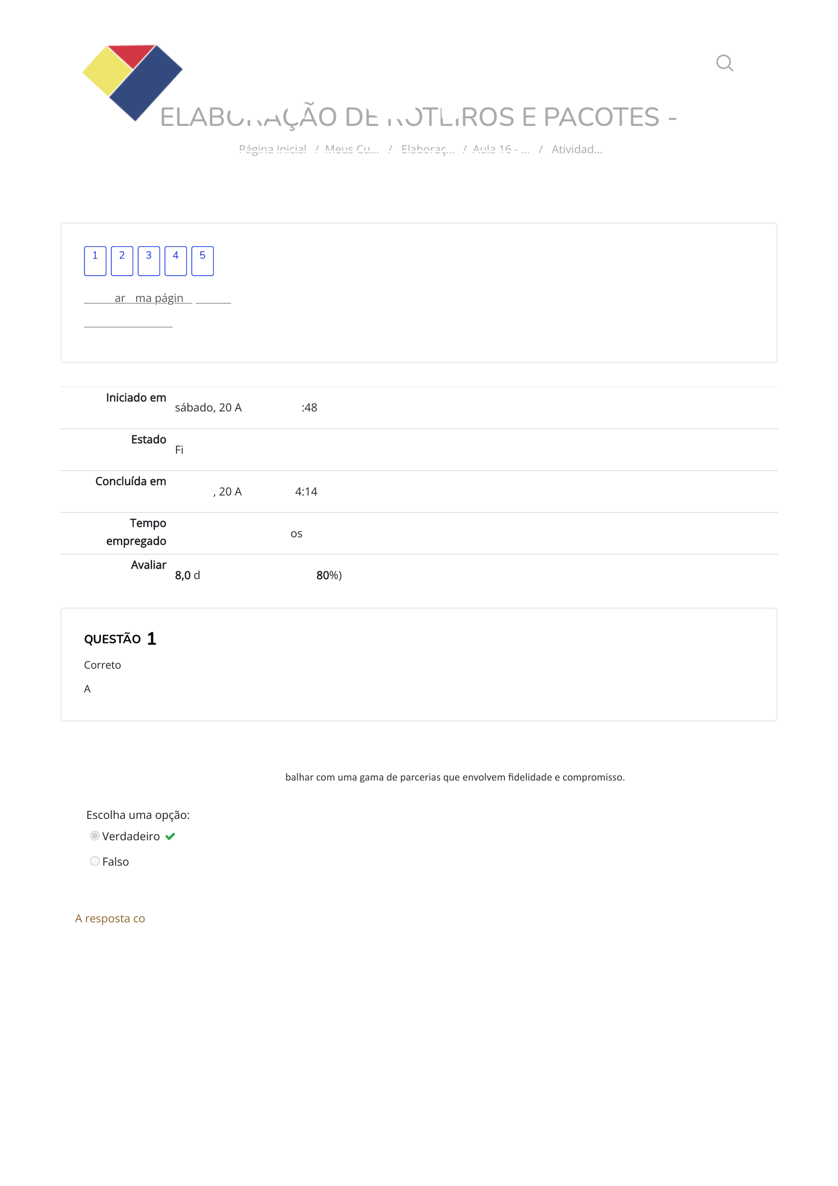 20/08/2022 14:24 Atividade 16: Revisão da tentativa https://cpetead.com.br/mod/quiz/review.php?attempt=2750148&cmid=29710 1/4 ELABORAÇÃO DE ROTEIROS E PACOTES - Página Inicial / Meus Cu… / Elaboraç… / Aula 16 - … / Atividad… Iniciado em sábado, 20 Ago 2022, 13:48 Estado Finalizada Concluída em sábado, 20 Ago 2022, 14:14 Tempo empregado 25 minutos 53 segundos Avaliar 8,0 de um máximo de 10,0(80%) QUESTÃO Correto Atingiu 2,0 de 2,0 Mostrar uma página por vez Terminar revisão 1 2 3 4 5 1 Um dos desafios da profissão do agente é trabalhar com uma gama de parcerias que envolvem fidelidade e compromisso. Escolha uma opção: Verdadeiro Falso A resposta correta é 'Verdadeiro'. https://cpetead.com.br/ https://cpetead.com.br/course/view.php?id=1352 https://cpetead.com.br/mod/quiz/view.php?id=29710 https://cpetead.com.br/mod/quiz/review.php?attempt=2750148&cmid=29710&showall=0 https://cpetead.com.br/mod/quiz/view.php?id=29710 https://cpetead.com.br/ 20/08/2022 14:24 Atividade 16: Revisão da tentativa https://cpetead.com.br/mod/quiz/review.php?attempt=2750148&cmid=29710 2/4 QUESTÃO Correto Atingiu 2,0 de 2,0 QUESTÃO Correto Atingiu 2,0 de 2,0 2 NÃO faz parte das etapas para a elaboração de um bom roteiro: Escolha uma opção: a. Escolha pelo agente de viagens do destino. b. Pagamento dos serviços pelo passageiro. c. Pesquisa sobre o destino. d. Conversa com o futuro passageiro. Sua resposta está correta. A resposta correta é: Escolha pelo agente de viagens do destino. 3 Organizar um roteiro tendo noções de geografia é muito mais fácil. Um bom profissional de turismo deve ter sempre mapas e atlas em mãos e usá-los para consulta ao elaborar um roteiro. É preciso saber onde estão as cidades do roteiro, a distância entre elas, o perfil geográfico da região (montanha, litoral, planície, ilha), o clima local, al�tude etc. Informe-se sobre o índice pluviométrico (quan�dade de precipitações), nevascas, secas e outros fenômenos climá�cos. Escolha uma opção: Verdadeiro Falso A resposta correta é 'Verdadeiro'. 20/08/2022 14:24 Atividade 16: Revisão da tentativa https://cpetead.com.br/mod/quiz/review.php?attempt=2750148&cmid=29710 3/4 QUESTÃO Incorreto Atingiu 0,0 de 2,0 QUESTÃO Correto Atingiu 2,0 de 2,0 4 Os principais custos de uma viagem são as passagens aéreas e as despesas de alimentação; felizmente pode-se contar com muitas facilidades de pagamento, principalmente para as passagens. Escolha uma opção: Verdadeiro Falso A resposta correta é 'Falso'. 5 A a�rmativa abaixo é o conceito de: Viagens direcionadas aos agentes de viagem com a intenção de aprofundarem seus conhecimentos sobre os detalhes dos atrativos, hotéis e destinos sem qualquer ônus para o pro�ssional. Escolha uma opção: a. Resorts. b. Clusters. c. Trade. d. Famtur. Sua resposta está correta. A resposta correta é: Famtur. ◄ Leitura Complementar - Planejamento Seguir para... Atividade de Pesquisa - Elaboração de Roteiros e Pacotes ► Quem somos Cursos Certi�cação Unidades Contato https://cpetead.com.br/mod/url/view.php?id=29654&forceview=1 https://cpetead.com.br/mod/assign/view.php?id=29722&forceview=1 https://www.cpet.com.br/quem-somos-cpet-cursos-tecnicos-a-distancia-ead/ https://www.cpet.com.br/course-cat/cursos/cursos-online/ https://www.cpet.com.br/certificacao-cpet/ https://www.cpet.com.br/unidades-cpet/ https://www.cpet.com.br/contato/ https://www.facebook.com/CPET-Centro-de-Profissionaliza%C3%A7%C3%A3o-e-Educa%C3%A7%C3%A3o-T%C3%A9cnica-1039179026236475/ https://twitter.com/soucpet/ https://www.instagram.com/soucpet/ 20/08/2022 14:24 Atividade 16: Revisão da tentativa https://cpetead.com.br/mod/quiz/review.php?attempt=2750148&cmid=29710 4/4 Copyright © 2021 CPET - Centro de Pro�ssionalização e Educação Técnica