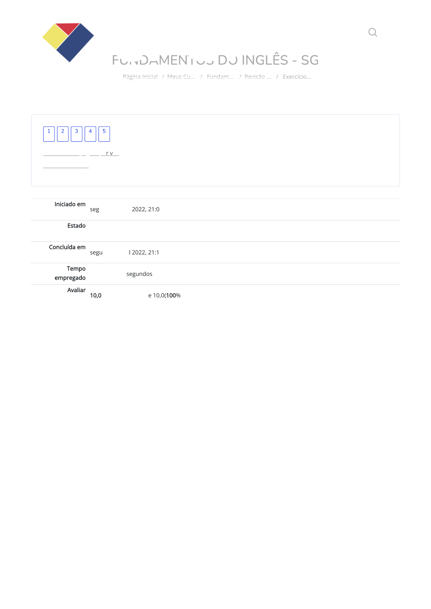 07/08/2022 10:30 Exercício de Fixação - Revisão Gramatical II: Revisão da tentativa https://cpetead.com.br/mod/quiz/review.php?attempt=2607819&cmid=54269 1/6 FUNDAMENTOS DO INGLÊS - SG Página Inicial / Meus Cu… / Fundam… / Revisão … / Exercício… Iniciado em segunda, 25 Jul 2022, 21:01 Estado Finalizada Concluída em segunda, 25 Jul 2022, 21:11 Tempo empregado 10 minutos 4 segundos Avaliar 10,0 de um máximo de 10,0(100%) Mostrar uma página por vez Terminar revisão 1 2 3 4 5 https://cpetead.com.br/ https://cpetead.com.br/course/view.php?id=2211 https://cpetead.com.br/mod/quiz/view.php?id=54269 https://cpetead.com.br/mod/quiz/review.php?attempt=2607819&cmid=54269&showall=0 https://cpetead.com.br/mod/quiz/view.php?id=54269 https://cpetead.com.br/ 07/08/2022 10:30 Exercício de Fixação - Revisão Gramatical II: Revisão da tentativa https://cpetead.com.br/mod/quiz/review.php?attempt=2607819&cmid=54269 2/6 QUESTÃO Correto Atingiu 2,0 de 2,0 1 Leia o texto e responda às perguntas a seguir: Why do men have Adam’s Apple*? Actually, both men and women have Adam’s apple. In medical terms the Adam’s apple is called a thyroid cartilage. The reason a man’s Adam’s apple is larger than a woman’s is because his (1) larynx is larger to accommodate his (2) longer vocal cords. By the way, it (3) is men’s longer vocal cords that give them (4) deeper voices. A second reason, which (5) female readers may not like, is because women have more fat in their (6) necks, which hides their (7) Adam’s apple. The name Adam’s apple was taken from the Biblical story of Adam and Eve. As the story goes, a piece of the apple that Eve had given Adam to eat became lodged in his (8) throat. From then on, Adam and all his (9) male descendants had an enlarged larynx as a symbol of Adam’s shame. (BRITO, 1997) *pomo-de-adão A palavra "which", indicada pelo número 5, é um: Escolha uma opção: a. Pronome pessoal (como objeto). b. Pronome demonstrativo. c. Pronome relativo. d. Adjetivo possessivo. e. Pronome pessoal do caso reto. Sua resposta está correta. A resposta correta é: Pronome relativo. 07/08/2022 10:30 Exercício de Fixação - Revisão Gramatical II: Revisão da tentativa https://cpetead.com.br/mod/quiz/review.php?attempt=2607819&cmid=54269 3/6 QUESTÃO Correto Atingiu 2,0 de 2,0 2 Leia o texto e responda às perguntas a seguir: Why do men have Adam’s Apple*? Actually, both men and women have Adam’s apple. In medical terms the Adam’s apple is called a thyroid cartilage. The reason a man’s Adam’s apple is larger than a woman’s is because his (1) larynx is larger to accommodate his (2) longer vocal cords. By the way, it (3) is men’s longer vocal cords that give them (4) deeper voices. A second reason, which (5) female readers may not like, is because women have more fat in their (6) necks, which hides their (7) Adam’s apple. The name Adam’s apple was taken from the Biblical story of Adam and Eve. As the story goes, a piece of the apple that Eve had given Adam to eat became lodged in his (8) throat. From then on, Adam and all his (9) male descendants had an enlarged larynx as a symbol of Adam’s shame. (BRITO, 1997) *pomo-de-adão A palavra "them", indicada pelo número 4, é um: Escolha uma opção: a. Pronome Relativo. b. Pronome pessoal (como objeto). c. Pronome demonstrativo. d. Adjetivo possessivo. e. Pronome pessoal do caso reto. Sua resposta está correta. A resposta correta é: Pronome pessoal (como objeto). 07/08/2022 10:30 Exercício de Fixação - Revisão Gramatical II: Revisão da tentativa https://cpetead.com.br/mod/quiz/review.php?attempt=2607819&cmid=54269 4/6 QUESTÃO Correto Atingiu 2,0 de 2,0 3 Leia o texto e responda às perguntas a seguir: Why do men have Adam’s Apple*? Actually, both men and women have Adam’s apple. In medical terms the Adam’s apple is called a thyroid cartilage. The reason a man’s Adam’s apple is larger than a woman’s is because his (1) larynx is larger to accommodate his (2) longer vocal cords. By the way, it (3) is men’s longer vocal cords that give them (4) deeper voices. A second reason, which (5) female readers may not like, is because women have more fat in their (6) necks, which hides their (7) Adam’s apple. The name Adam’s apple was taken from the Biblical story of Adam and Eve. As the story goes, a piece of the apple that Eve had given Adam to eat became lodged in his (8) throat. From then on, Adam and all his (9) male descendants had an enlarged larynx as a symbol of Adam’s shame. (BRITO, 1997) *pomo-de-adão A palavra "his", indicada pelos números 1, 2, 8 e 9, no texto, é um: Escolha uma opção: a. Pronome pessoal (como objeto). b. Adjetivo possessivo. c. Pronome pessoal do caso reto. d. Pronome demonstrativo. e. Pronome possessivo. Sua resposta está correta. A resposta correta é: Adjetivo possessivo. 07/08/2022 10:30 Exercício de Fixação - Revisão Gramatical II: Revisão da tentativa https://cpetead.com.br/mod/quiz/review.php?attempt=2607819&cmid=54269 5/6 QUESTÃO Correto Atingiu 2,0 de 2,0 4 Leia o texto e responda às perguntas a seguir: Why do men have Adam’s Apple*? Actually, both men and women have Adam’s apple. In medical terms the Adam’s apple is called a thyroid cartilage. The reason a man’s Adam’s apple is larger than a woman’s is because his (1) larynx is larger to accommodate his (2) longer vocal cords. By the way, it (3) is men’s longer vocal cords that give them (4) deeper voices. A second reason, which (5) female readers may not like, is because women have more fat in their (6) necks, which hides their (7) Adam’s apple. The name Adam’s apple was taken from the Biblical story of Adam and Eve. As the story goes, a piece of the apple that Eve had given Adam to eat became lodged in his (8) throat. From then on, Adam and all his (9) male descendants had an enlarged larynx as a symbol of Adam’s shame. (BRITO, 1997) *pomo-de-adão A palavra "their", in