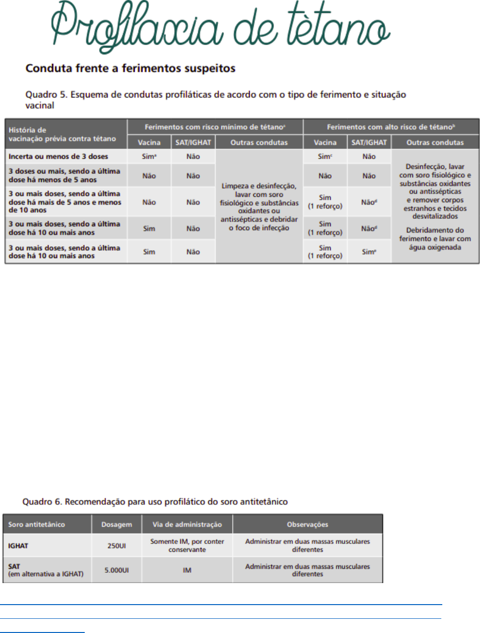 a) Ferimentos superficiais, limpos, sem corpos estranhos ou tecidos desvitalizados. B) Ferimentos profundos ou superficiais sujos; com corpos estranhos ou tecidos desvitalizados; queimaduras; feridas puntiformes ou por armas brancas e de fogo; mordeduras; politraumatismos e fraturas expostas. c) Vacinar e ferimentos futuros. Se o profissional, que presta o atendimento, suspeita que os cuidados posteriores com o ferimento não serão adequados, deve co devem ser aplicados em locais diferentes. d) Para paciente imunodeprimido, desnutrido grave ou idoso, além do reforço com a vacina, está também indicada IGHAT ou SAT. e) Se o profissional, que presta o atendimento, suspeita que os cuidados posteriores com o ferimento não serão adequados, deve considerar a indicação de imunização passiva com SAT ou IGHAT. Quando indicado o uso de vacina e SAT ou IGHAT, concomitantemente, devem ser aplicadas em locais diferente https://www.romulopassos.com.br/materiais/baixar/OTA2YzUxMDJjNmQwNzUxYjU1ODJmMWU3N mViNjdlNzFiZDQ5Zjc3ZDk3MjRhNDRhYTcxODk1NDgzNGI5Y2NhMR8dF854XDewIWec56ciwsNxwBIbl 8SKlivnzgbVp0cp/0
