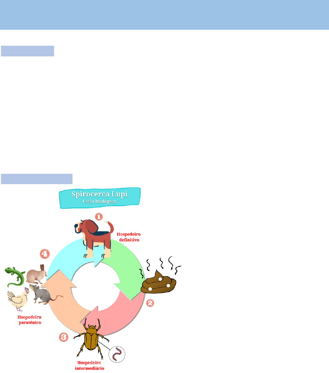Espirocercose dos cães e gatos INTRODUÇÃO • É uma doença causada pelo Spirocerca lupi • Em sua forma adulta o parasito fica locaizado em lesões granulamentosas na parede do esofâgo e estômago • Hospodeiro definitivo: cães principalmente e gatos • Hospedeiro intermediario: besouros coprófagos • Identificação: os vermes adultos medem cerca de 8cm, possui coloração rósea e permanece enovelado no interior de um granuloma formado devido a reações inflamatórias (como se fosse um nódulo na parede esogafica) Localização • Larvas: ficam localizadas na parede da artéria aorta (maior parte das vezes não traz consequencias a aorta) • Adultos: ficam localizados em granulomas na parede do esôfago • Distribuição geografica: regiões tropicais e subtropicais CICLO BIOLÓGICO • Ciclo heteroxênico • Período pré-patente de em média 2 anos • Pode ocorrer a presença de um hospedeiro paratênico (transporte) • Os cães se contaminam ao ingerir besouros ou hospedeiros paratênicos contento larvas infectantes (L3) encistadas 1. Os vermes adultos ficam alojados em granulomas parasitários no parede esofágica, onde ocorrerá reprodução dentro do granuloma 2. Os ovos larvados contendo L1 são liberados no lúmen esofágico 3. Esses ovos seguem o caminho até serem liberados juntamente com as fezes 4. O besouro coprófago (hospedeiro intermediário) ao se alimentar das fezes do hospedeiro definitivo acaba ingerindo os ovos contendo L1 5. No interior do besouro a larva L1 sofre eclosão, de L1 para L2 e de L2 para L3 - (a forma L3 é a forma infectante para o HD) 6. Pode ocorrer o envolvimento de um hospedeiro paratênico (transporte), ao se alimentar do hospedeiro intermediário ele acaba ingerido também a larva L3, não ocorre desenvolvimento nesse hospedeiro 7. O hospedeiro definitivo ao ingerir o hospedeiro intermediário ou o paratênico acaba se infectando com a larva L3 8. Essa larva L3 irá penetrar a parede do estômago, ganhado a circulação periférica do estômago e consequentemente atingindo a circulação sistêmica principal 9. Essa L3 quando chega na parede da aorta, muda de L3 e se torna L4, nesse momento ela abandona a circulação sistêmica e volta para circulação periférica 10. Quando a L4 sente que está na parede do esofago ela muda para a forma adulta e fecha o ciclo PATOGENIA • Durante a migração das larvas pode ocorrer lesões na artéria aorta, principalmente durante a fase de ecdise do parasito • Os granulomas causados pelos parasitos no esôfago, pode ocorrer disfagia (dificuldade em se alimentar) e vômitos • Pode ocorrer osteossarcoma esofágico devido as diferenciações celulares decorrente do processo inflamatório ocasionado pela presença do parasito • Durante seu parasitismo o verme libera diversas toxinas, podendo causar uma ação toxêmica e ocasionando espondilose de vértebras torácicas SINTOMATOLOGIA CLÍNICA • Geralmente não há presença de sinais clínicos • Quando presentes, pode ocorrer: disfagia, êmese e emagrecimento progressivo • Lembra megaesofago, o animal tem fome, mas, tem dificuldade de se alimentar EPIDEMIOLOGIA • Incidência é alta nas áreas endêmicas • A infecção é facilita da pela grande variedade de hospedeiros paratênicos • É uma doença que acomete na maior parte cães de caça que vivem em áreas periurbanas ou rurais tendo a maior chance de ter contato com hospedeiros intermediarios ou paratenicos DIAGNÓSTICO • Realização de exames coproparasitológ icos, por meio da pesquisa de ovos n as fezes ou vômito • Imagem por meio de endoscopia e radiografia para identificação dos granulomas (pode ser confundido com nodulos), melhor exame de fezes ou endoscopia TRATAMENTO • Disofenol – 7 a 10mg/kg por via SC • Ivermectina – 0,2mg/kg dose única – mais usada CONTROLE • Evitar acesso dos cães aos hospedeiros paratênicos – controle pouco efetivo uma vez que há muitos hospedeiros intermediarios ou paratênicos