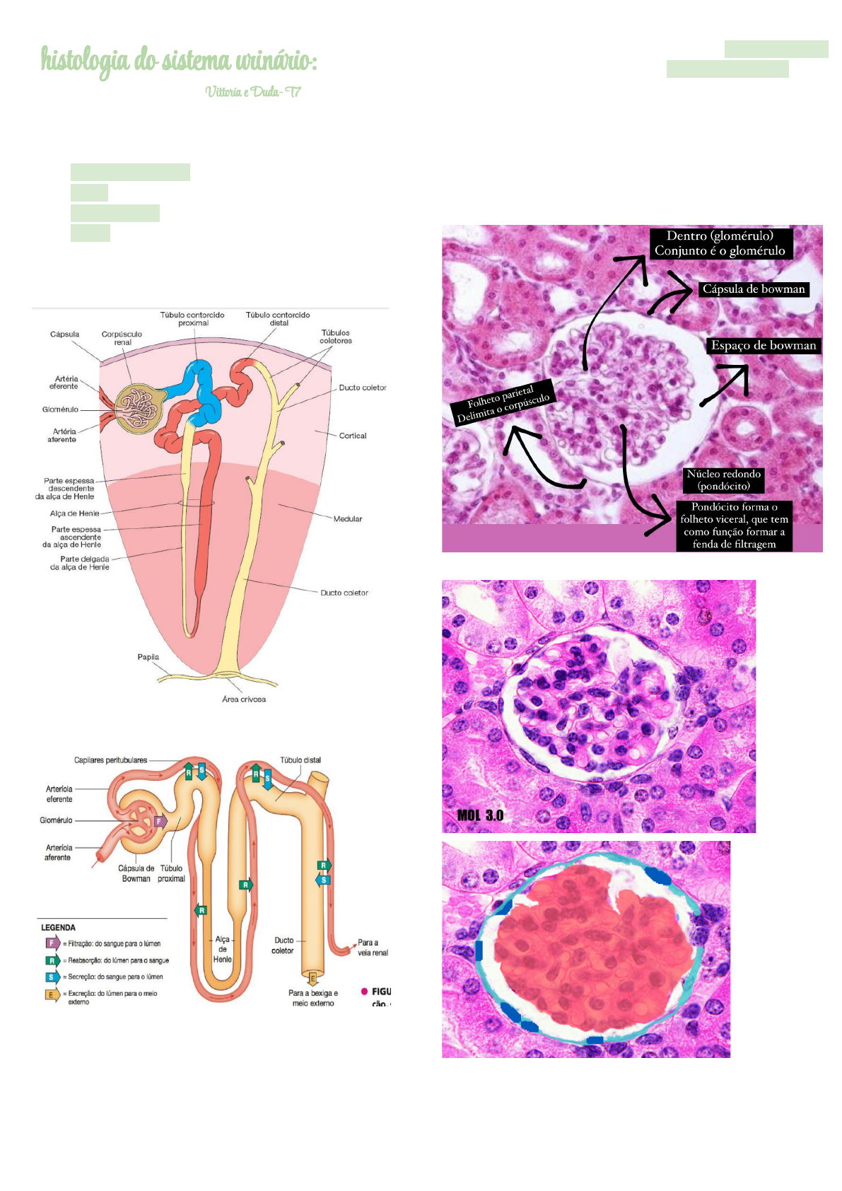 hist�l�gia d� sist�ma ur�nári�: V��t�ia e Duda- T7 ➔ unidade urinífera: néfrons + porção condutora ↪ néfrons: - corpúsculo renal: - T.C.P - alça de henle - T.C.D ↪ porção condutora: - Túbulo coletor - Ducto coletor ⇨ Corpúsculo renal: estrutura responsável pela filtração, gera o filtrado, está circundado por túbulos renais ↪ glomérulo: emaranhado de capilares ↪ cápsula de bowman: delimita o espaço para reservar o filtrado e conduzir ele ➔ folheto visceral: composto por célula podócito que faz parte da fenda filtração e célula mesangial: auxilia na vasodilatação e vasoconstrição dos glomérulos, estão em contato com o glomérulo mesmo, fazem parte da fenda de filtração) ➔ folheto parietal: epitélio simples pavimentoso, delimita o corpúsculo ➔ fica no córtex ➔ cápsula de Bowman, resaltada em verde. ➔ novelo de capilares sanguíneos, denominado glomérulo renal, ressaltado em vermelho. ➔ espaço entre a cápsula e o glomérulo, denominado espaço de Bowman. ⇨ Túbulo contorcido proximal: epitélio cúbico ou colunar baixo, grande quantidade de microvilos na superfície apical das células, que formam a orla em escova. ➔ as células são bem coradas e altas ➔ o lúmen é estreio ➔ prolongamentos (microvilosidades) ➔ aglomerado de moléculas ➔ córtex ⇨ Túbulo contorcido distal: reabsorver água ➔ do túbulo para o capilar sanguíneo ➔ células pouco coradas e baixas ➔ lúmen mais amplo ➔ revestido por epitélio cúbico simples, sem a borda em escova. ➔ córtex ⇨ Alça de henle: epitélio simples pavimentoso. ➔ Reabsorção de íons ➔ células mais baixinhas, pois vai entrar e já vai sair (rápido) ➔ região de medula ➔ tem um núcleo redondinho ⇨ Mácula densa: controla a taxa de secreção da renina ➔ células abaixo da mácula densa são as células justaglomerulares, que tem a função de produzir a renina ⇨ Túbulos e ductos coletores: em alguns casos ainda s fez reabsorção aqui ➔ epitélio cúbico simples ➔ Suas células apresentam citoplasma fracamente corado pela eosina e cujos limites intercelulares sã bem marcados ➔ é possível perceber a delimitação certinha da membrana ➔ córtex (vamos ver aqui) e medula �m�i�l�gia d� sist�ma ur�nári� : ➔ Origem: Mesoderma intermediário ➔ A partir do cordão nefrogênico formam-se três sistemas renais que se sobrepõem levemente em uma sequência craniocaudal. Pronefro, mesonefro e metanefro ⇨ Pronefro: ➔ não tem função mas ajuda a formar os outros, se projeta da região cervical até a cloaca ➔ formação: quarta semana ➔ no final da quarta semana ele se degenera ➔ Composição: 7 - 10 grupos sólidos de células + Ducto pronéfrico ⇨ Mesonefro: se conecta com o ducto pronefro, e se torna mesonefro ➔ Composição: Unidades excretoras + ductos mesonéfricos ➔ Região: Segmentos torácicos até os lombares superiores (L3). ➔ rim funcional e provisório ➔ abraça o capilar que já vai ser o glomérulo primitivo e já vai ter capacidade de filtração ⇨ Metanefro: (rim definitivo) ➔ Formação: 5ª semana ➔ Unidades excretórias → mesoderma metanéfrico ➔ Ductos coletores → broto ureteral ↪ proliferação celular que forma um brotamento ( broto ureteral) ➔ blastema metanefro: região marronzinha, que se dilata e dá origem à pelve renal ➔ se ramifica e dá origem á 3 cálices ➔ O broto ureteral dá origem a que estruturas? ↪ Ureter, pelve renal, cálices maiores e menores e túbulos coletores. ➔ O mesoderma metanéfrico dá origem a que estruturas? ↪ Cápsula de Bowman, túbulo contorcido proxima alça de Henle e túbulo contorcido distal ⇨ Bexiga e Uretra: ➔ A bexiga vem da porção superior do seio urogenital ➔ A uretra vem da porção pélvica (uretra prostatica e uretra membranosa) IMAGENS: - Região medular do rim - Esta região não contém corpúsculos renais. O parênquima desta região é constituído somente por túbulos renais. - Região cortical do rim A região cortical do rim apresenta grande quantidade de: – Túbulos renais de vários tipos, seccionados nos mais diversos planos de corte. – Corpúsculos renais. – Glomérulo ressaltado em azul – Espaço de Bowman ressaltado em amarelo. – Início de túbulo contorcido proximal ressaltado em vermelho. - tubos contorcidos distais e proximais – Túbulo coletor, ressaltado em verde. (ep simples cúbico, citoplasma claro e limites bem marcados) – Túbulo contorcido proximal, ressaltado em azul. (microvilosidades, cél corada e alta) – Túbulos contorcidos distais, ressaltados em rosa (cél baixas e pouco coradas) - Região medular do rim com dutos coletores e porções finas da alça de Henle. Observe: – Dutos calibrosos formados por epitélio simples cúbico cujo citoplasma é pouco corado e seus limites celulares bem distintos. São dutos coletores que iniciam seu trajeto na região cortical e se dirigem para a região medular. Estão ressaltados em azul claro. – Dutos de parede muito delgados. São as alças de Henle ressaltadas em azul escuro. – Capilares sanguíneos, reconhecidos pela presença de hemácias em seu interior.