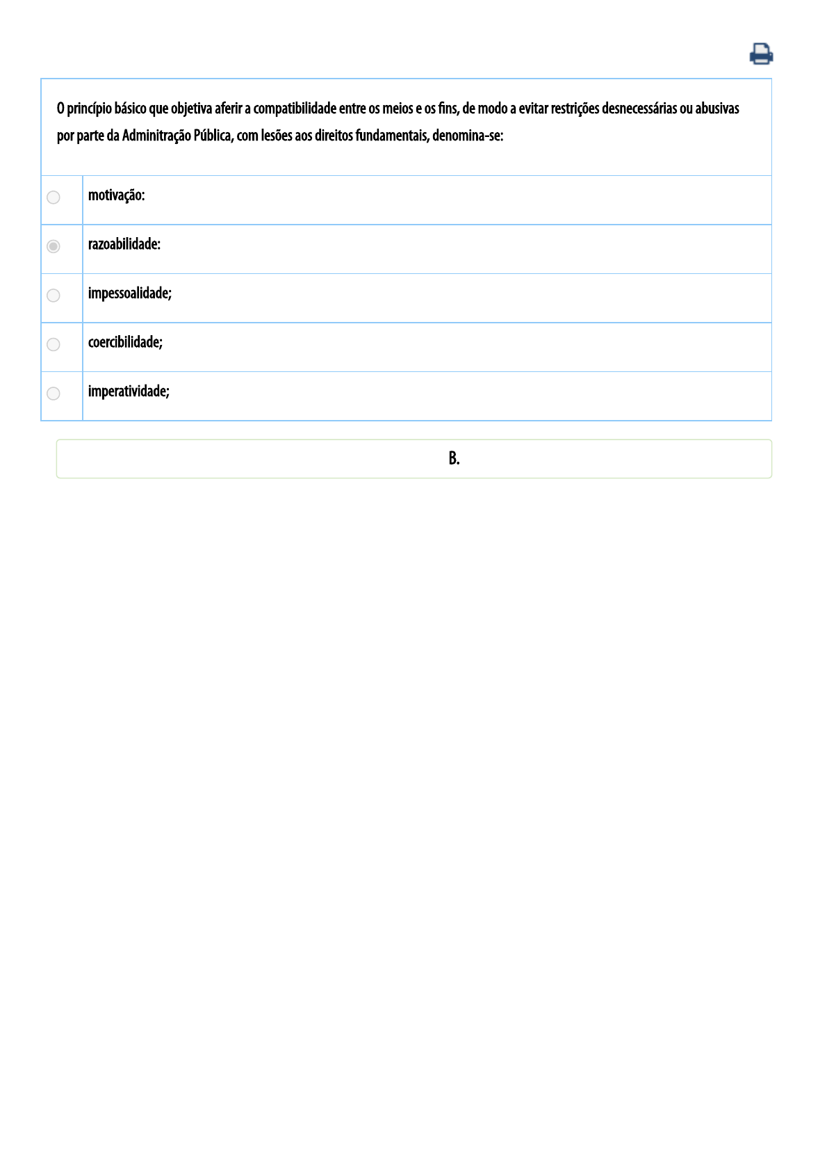 21/08/2022 12:36 Universidade Paulista - UNIP : Disciplina On-line. https://www.unip.br/aluno/central/sistemas/acesso/138 1/1 O princípio básico que objetiva aferir a compatibilidade entre os meios e os �ns, de modo a evitar restrições desnecessárias ou abusivas por parte da Adminitração Pública, com lesões aos direitos fundamentais, denomina-se: A motivação: B razoabilidade: C impessoalidade; D coercibilidade; E imperatividade; Você já respondeu e acertou esse exercício. A resposta correta é: B. Questão 1 21/08/2022 12:38 Universidade Paulista - UNIP : Disciplina On-line. https://www.unip.br/aluno/central/sistemas/acesso/138 1/1 Na hipótese de Prefeito que delibera desapropriar área de seu desafeto para edi�car hospital municipal, veri�ca-se, do ponto de vista material ofensa ao seguinte princípio da Administração Pública: A motivação; B moralidade: C legalidade; D devido processo legal; E Inalienabilidade dos bens públicos. Você já respondeu e acertou esse exercício. A resposta correta é: B. Questão 2 21/08/2022 12:38 Universidade Paulista - UNIP : Disciplina On-line. https://www.unip.br/aluno/central/sistemas/acesso/138 1/1 Sobre os princípios que regem a administração pública, é incorreto a�rmar que: A o princípio da moralidade exige que o administrador se paute por conceitos éticos; B corolário do princípio da igualdade é a vedação de se estabelecer diferenças em razão de sede ou domicílio dos licitantes; C o princípio da supremacia do interesse público decorre da posição privilegiada dos órgãos e entes públicos encarregados da preservação do interesse público; D em decorrência do princípio da hierarquia, que é restrito às funções administrativas e não aplicáveis às funções tipicamente legislativas e judiciais, a Administração Pública possui a prerrogativa de avocar atribuições, e também de rever os atos dos subordinados; E A Constituição Federal prevê, expressamente, os princípios da legalidade, publicidade, impessoalidade, moralidade, e�ciência e razoabilidade. Você já respondeu e acertou esse exercício. A resposta correta é: E. Questão 3 21/08/2022 12:39 Universidade Paulista - UNIP : Disciplina On-line. https://www.unip.br/aluno/central/sistemas/acesso/138 1/1 Com relação aos princípios consitucionais da Administração Pública, está em conformidade com a A moralidade o ato administrativo praticado por agente público em favorecimento próprio, desde que revestido de legalidade. B e�ciência a prestação de serviço público que satisfaça em parte às necessidades dos administrados, desde que realizados com rapidez e prontidão; C publicidade o sigilo imprescindível à segurança da sociedade e do Estado ou o inidispensável à defesa da intimidade; D impressoalidade a violação da ordem cronológica dos precatórios para o pagamento dos créditos de natureza comum; E legalidade a inobservância a quaisquer atos normativos que não sejam lei em sentido estrito e provindos de autoridades admnistrativas. Você já respondeu e acertou esse exercício. A resposta correta é: C. Questão 4 21/08/2022 12:39 Universidade Paulista - UNIP : Disciplina On-line. https://www.unip.br/aluno/central/sistemas/acesso/138 1/1 Acerca dos princípios de Direito Administrativo, assinale a alternativa correta. A o rol dos principios elencados pela Constituição não é exaustiva, tanto que existem os chamados "princípios implícitos". B o princípio da legalidade é uma das poucas previsões constitucionais que se relaciona à possibilidade de existir tirania e autoritarismo dos membros do Poder Executivo. C o princípio da moralidade se aplica apenas aos entes da administração pública indireta. D a moralidade e a razoabilidade são exemplos de princípios administrativos sem previsão expressa. E A Constituição Federal prevê, expressamente, os princípios da legalidade, publicidade, impessoalidade, moralidade, e�ciência e proporcionalidade. Você já respondeu e acertou esse exercício. A resposta correta é: A. Questão 5 21/08/2022 12:40 Universidade Paulista - UNIP : Disciplina On-line. https://www.unip.br/aluno/central/sistemas/acesso/138 1/1 Pedro foi aprovado em concurso público e acabou por ser contrato. Logo depois da sua nomeação, a Administração Pública, analisando com mais detalhe a documentação de Pedro, chega à conclusão de que os documentos apresentados eram falsos e, portanto, tornou sem efeito a sua aprovação e a sua nomeação. Assinale a alternativa que apresenta o princípio aplicado nesse caso. A heterocomposição; B segurança jurídica; C tutela; D autotutela; E motivação. Você já respondeu e acertou esse exercício. A resposta correta é: D. Questão 6 21/08/2022 22:00 Universidade Paulista - UNIP : Disciplina On-line. https://www.unip.br/aluno/central/sistemas/acesso/138 1/1 É princípio comezinho de direito público que as despesas previstas devem ser liquidadas no pertintente contrato, antecedido, em regra, de licitação. Atualmente a imprensa veiculou notícias sobre o uso indevido de cartões de crédito corporativos por agentes políticos em supermercados, free shops, restaurantes e até para saques em dinheiro em caixas eletrônicos. Cuida-se de evidente desrespeito ao princípio da: A tutela; B continuidade; C impessoalidade; D proporcionalidade; E e�ciência. Você já respondeu e acertou esse exercício. A resposta correta é: C. Questão 7 21/08/2022 12:41 Universidade Paulista - UNIP : Disciplina On-line. https://www.unip.br/aluno/central/sistemas/acesso/138 1/1 A vedação à Administração Pública de, por meio de mero ato administrativo, concecer direitos, criar obrigações ou impor proibições, vincula-se : A legalidade B moralidade C impessoalidade D hierarquia E e�ciência Você já respondeu e acertou esse exercício. A resposta correta é: A. Questão 8 21/08/2022 12:41 Universidade Paulista - UNIP : Disciplina On-line.