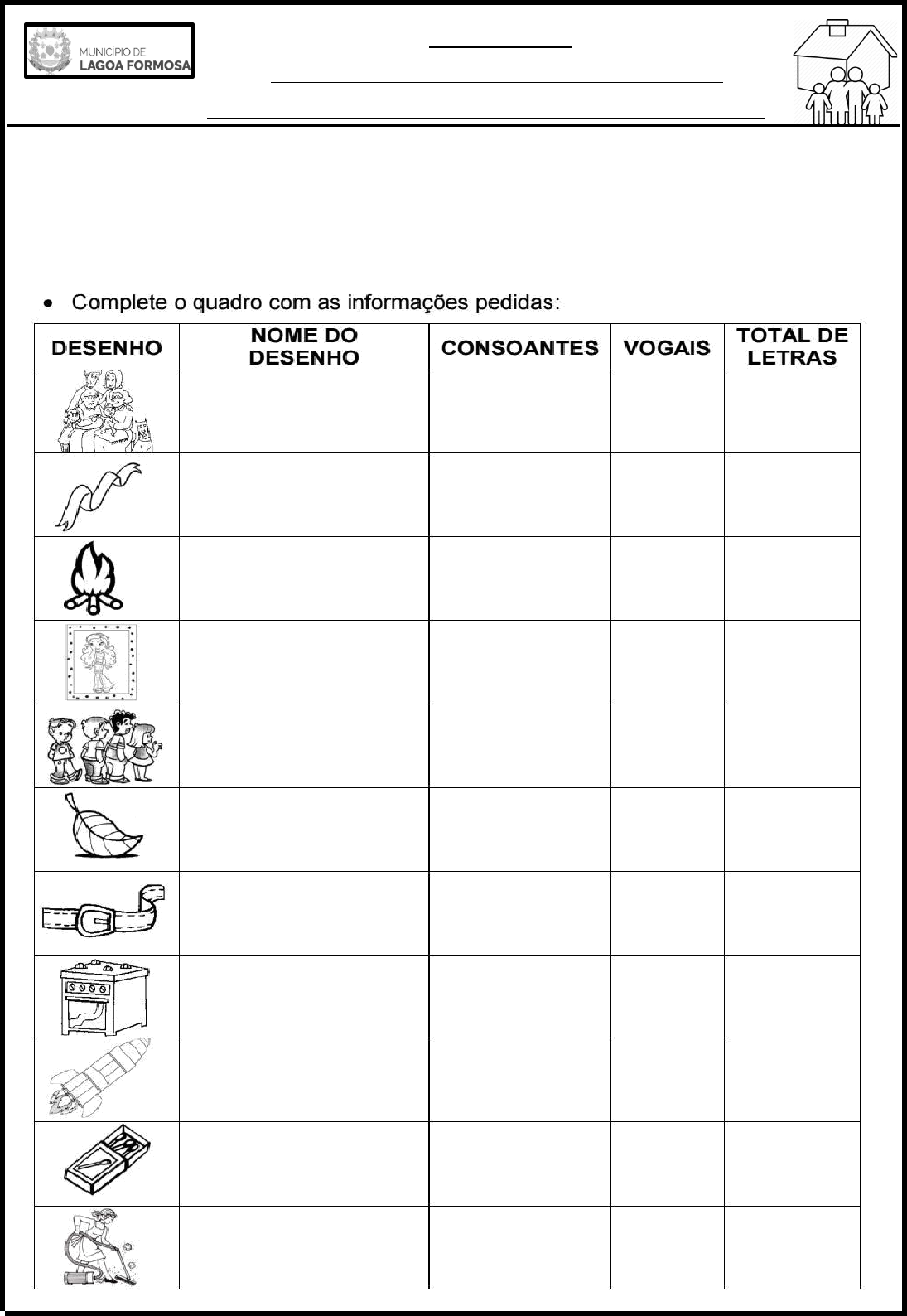 PROJETO: “EM CASA TAMBÉM SE APRENDE” PORTUGUÊS -2º ANO DO ENSINO FUNDAMENTAL SEMANA 22/09 A 28/09/2020 – ATIVIDADE 01: ALUNO (A):(NOME COMPLETO)___________________________________________________________ _______________________________________________________________________________________ PROJETO: “EM CASA TAMBÉM SE APRENDE” PORTUGUÊS -2º ANO DO ENSINO FUNDAMENTAL _____________________________________________________________________________ ATIVIDADE 02: ALUNO (A):(NOME COMPLETO)___________________________________________________________ _______________________________________________________________________________________ PROJETO: “EM CASA TAMBÉM SE APRENDE” PORTUGUÊS -2º ANO DO ENSINO FUNDAMENTAL _____________________________________________________________________________ ATIVIDADE 03: ALUNO (A):(NOME COMPLETO)___________________________________________________________ _______________________________________________________________________________________ PROJETO: “EM CASA TAMBÉM SE APRENDE” PORTUGUÊS -2º ANO DO ENSINO FUNDAMENTAL _____________________________________________________________________________ ATIVIDADE 04: ALUNO (A):(NOME COMPLETO)___________________________________________________________ _______________________________________________________________________________________ PROJETO: “EM CASA TAMBÉM SE APRENDE” PORTUGUÊS -2º ANO DO ENSINO FUNDAMENTAL _____________________________________________________________________________ ATIVIDADE 05: ALUNO (A):(NOME COMPLETO)___________________________________________________________ _______________________________________________________________________________________ PROJETO: “EM CASA TAMBÉM SE APRENDE” MATEMÁTICA -2º ANO DO ENSINO FUNDAMENTAL _____________________________________________________________________________ SEMANA 23/09 A 29/09/2020 - ATIVIDADE 01: ALUNO (A):(NOME COMPLETO)___________________________________________________________ _______________________________________________________________________________________ 1-DESENHE AS PEÇAS DO MATERIAL DOURADO QUE ESTÃO FALTANDO PARA COMPLETAR OS NÚMEROS EM DESTAQUE. 32 44 25 46 40 50 48 35 PROJETO: “EM CASA TAMBÉM SE APRENDE” MATEMÁTICA -2º ANO DO ENSINO FUNDAMENTAL _____________________________________________________________________________ ATIVIDADE 02: ALUNO (A):(NOME COMPLETO)___________________________________________________________ _______________________________________________________________________________________ RESOLVAS OS PROBLEMINHAS. PROJETO: “EM CASA TAMBÉM SE APRENDE” MATEMÁTICA -2º ANO DO ENSINO FUNDAMENTAL _____________________________________________________________________________ ATIVIDADE 03: ALUNO (A):(NOME COMPLETO)___________________________________________________________ _______________________________________________________________________________________ Leia com atenção e resolva os problemas abaixo, com muito capricho! 1. Vera vendeu 34 sorvetes de abacaxi e 23 de uva. Quantos sorvetes ela vendeu no total? B)Os filhos de Sara tinham 25 iogurtes guardados na geladeira. Tomaram 5. Quantos iogurtes restaram? 1. Carina tinha 50 balas. No final da tarde deu 20 balas para suas amigas. Com quantas balas Carina ficou? 1. Marcelo comprou 46 figurinhas e deu 24 para Gabriel. Quantas figurinhas Marcelo ficou? PROJETO: “EM CASA TAMBÉM SE APRENDE” MATEMÁTICA -1º ANO DO ENSINO FUNDAMENTAL _____________________________________________________________________________ ATIVIDADE 04: ALUNO (A):(NOME COMPLETO)___________________________________________________________ _______________________________________________________________________________________ 1-Thiago preferiu brincar na barraca “tomba lata”. Ele derrubou a lata que tinha o número que é antecessor (número que vem antes) de 20. 1. Escreva o número da lata que Thiagoderrubou. ________________________________________________________ 1. Qual lata tem o número que representa 9 dezenas e 6 unidades? Escreva o número: . 2-É hora de derrubar as garrafas no boliche! Observe o valor de cada uma. Se cada bola acertar uma garrafa diferente, quais garrafas você terá que derrubar para fazer 90pontos? Derrubando2garrafas: + = Derrubando 3 garrafas: ____________ + ____________+ __________ = ________ PROJETO: “EM CASA TAMBÉM SE APRENDE” MATEMÁTICA -1º ANO DO ENSINO FUNDAMENTAL _____________________________________________________________________________ ATIVIDADE 05: ALUNO (A):(NOME COMPLETO)___________________________________________________________ _______________________________________________________________________________________ Tadeu e Camila foram à lanchonete e consultaram a tabela de preços. SANDUÍCHES PREÇO PRESUNTO 3 REAIS MORTADELA 2 REAIS QUEIJO 2 REAIS SUCOS PREÇOS LARANJA 1 REAL MELÃO 2 REAIS MARACUJÁ 1 REAL Calcule e responda no verso da folha: 1. Tadeu comprou um sanduíche de mortadela e um suco de maracujá. Quantos reais Tadeugastou? 1. Camila comprou um sanduíche de presunto e um suco de melão. Quantos reais Camilagastou? 1. Quanto Tadeu e Camila gastaram juntos? PROJETO: “EM CASA TAMBÉM SE APRENDE” EDUCAÇÃO FÍSICA - 2º ANO DO ENSINOFUNDAMENTAL ___________________________________________________________________________ ATIVIDADE3 VOCÊ JÁ BRINCOU DE MÍMICA? 1.Recorte 10 pedaços de papel. 2.Escreva em cada um dos pedaços de papel nomes de diferentes animais. 3.Dobre os papéis e coloque numa caixa. 4. Escolha uma pessoa para começar a brincadeira. Essa pessoa pega um papel, lê o nome do animal e faz uma mímica para os outros adivinharem. 5. Quem adivinhar marca um ponto e vai ser o próximo a fazer a mímica. 6. Ganha o jogo quem fizer mais pontos. _____________________________________________________________________________________ Chame as pessoas que moram com você para brincar de mímica. 1. Quais os animais que vocês escreveram? _______________________________