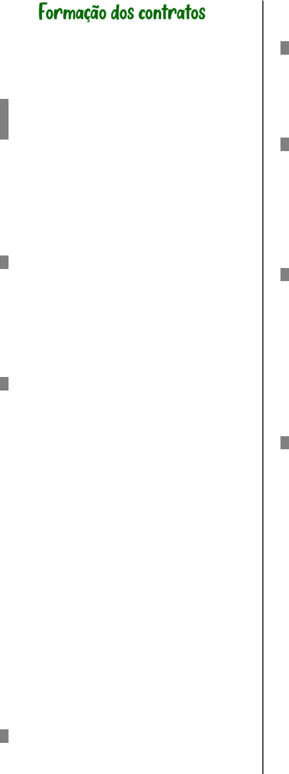 Formação dos contratos: noções introdutórias 1. Proponente é aquele que faz a oferta. 2. Oblato é aquele a quem se destina a oferta. 3. Quando o oblato aceita a oferta passa a ser chamado de aceitante. A oferta Art. 427. A proposta de contrato obriga o proponente, se o contrário não resultar dos termos dela, da natureza do negócio, ou das circunstâncias do caso. 1. A proposta vincula o proponente. A obrigatoriedade da proposta consiste no ônus, imposto ao proponente, de mantê-la por certo tempo a partir de sua efetivação e de responder por suas consequências, por acarretar no oblato uma fundada expectativa de realização do negócio, levando-o muitas vezes a elaborar projetos, a efetuar gastos e despesas, a promover liquidação de negócios e cessação de atividade, etc. 2. Entretanto, a lei abre algumas exceções a essa regra, presente na segunda parte do artigo 427. A proposta obriga o proponente: · se o contrário não resultar dos termos dela: muitas vezes a oferta possui cláusula expressa com dizeres como “proposta sujeita a confirmação” ou “não vale como proposta”. · da natureza do negócio: É o caso, por exemplo, das chamadas propostas abertas ao público, que se consideram limitadas ao estoque existente e encontram-se reguladas no art. 429. · ou das circunstâncias do caso: não são circunstâncias quaisquer, são aquelas mencionadas no art. 428. Art. 428. Deixa de ser obrigatória a proposta: I - se, feita sem prazo a pessoa presente, não foi imediatamente aceita. Considera-se também presente a pessoa que contrata por telefone ou por meio de comunicação semelhante; II - se, feita sem prazo a pessoa ausente, tiver decorrido tempo suficiente para chegar a resposta ao conhecimento do proponente; III - se, feita a pessoa ausente, não tiver sido expedida a resposta dentro do prazo dado; IV - se, antes dela, ou simultaneamente, chegar ao conhecimento da outra parte a retratação do proponente. 3. Sobre o Inciso I: Quando feita sem prazo a pessoa presente e não foi imediatamente aceita: Quando o solicitado responde que irá estudar a proposta feita por seu interlocutor, poderá este retirá-la. É “pegar ou largar”, e se o oblato não responde logo, dando pronta aceitação, caduca a proposta. 4. Sobre o Inciso IV: Se a retratação (desfazimento da proposta) chegar à outra parte antes (ou ao mesmo tempo) que a proposta. A aceitação 1. Aceitação é a concordância com os termos da proposta. É manifestação de vontade imprescindível para que se repute concluído o contrato, pois, somente quando o oblato se converte em aceitante e faz aderir a sua vontade à do proponente, a oferta se transforma em contrato. Art. 431. A aceitação fora do prazo, com adições, restrições, ou modificações, importará nova proposta. 2. Como a proposta perde a força obrigatória depois de esgotado o prazo concedido pelo proponente, a posterior manifestação do solicitado ou oblato também não obriga o último, pois quando isso acontece aceitação não temos e, sim, nova proposta. O mesmo se pode dizer quando este não aceita a oferta integralmente, introduzindo-lhe restrições ou modificações. Art. 432. Se o negócio for daqueles em que não seja costume a aceitação expressa, ou o proponente a tiver dispensado, reputar-se-á concluído o contrato, não chegando a tempo a recusa. 3. A aceitação pode ser expressa ou tácita. A primeira decorre de declaração do aceitante, manifestando a sua anuência; a segunda, de sua conduta, reveladora do consentimento. O art. 432 do Código Civil menciona duas hipóteses de aceitação tácita: · quando “o negócio for daqueles em que não seja costume a aceitação expressa”: Se, por exemplo, um fornecedor costuma remeter os seus produtos a determinado comerciante, e este, sem confirmar os pedidos, efetua os pagamentos, instaura-se uma praxe comercial. Se o último, em dado momento, quiser interrompê-la, terá de avisar previamente o fornecedor, sob pena de ficar obrigado ao pagamento de nova remessa, nas mesmas bases das anteriores. · ou quando “o proponente a tiver dispensado: a hipótese do turista que remete um fax a determinado hotel, reservando acomodações, informando que a chegada se dará em tal data, se não receber aviso em contrário. Não chegando a tempo a negativa, reputar-se-á concluído o contrato. Hipóteses de inexistência de força vinculante da aceitação Art. 430. Se a aceitação, por circunstância imprevista, chegar tarde ao conhecimento do proponente, este comunicá-lo-á imediatamente ao aceitante, sob pena de responder por perdas e danos. Art. 433. Considera-se inexistente a aceitação, se antes dela ou com ela chegar ao proponente a retratação do aceitante. Momento de conclusão do contrato 1. Contratos entre presentes: Nesse caso a proposta deve estipular ou não prazo para aceitação. · Se o policitante não estipulou prazo: a aceitação deve ser manifestada imediatamente sob pena de a oferta perder a força vinculativa. · Se o policitante estipulou prazo: a aceitação deverá operar-se dentro dele, sob pena de desvincular-se o proponente. 2. Contratos entre ausentes: Quando o contrato é celebrado entre ausentes, por correspondência (carta, telegrama, fax, radiograma, e-mail etc.) ou intermediários, a resposta leva algum tempo para chegar ao conhecimento do proponente e passa por diversas fases. · Teoria da informação ou da cognição: O aperfeiçoamento do contrato se dá somente no instante em que o policitante abri-la. · Teoria da declaração ou da agnição: · Teoria da declaração propriamente dita: o instante da conclusão coincide com o da redação da correspondência epistolar. · Teoria da expedição, não basta a redação da resposta, sendo necessário que tenha sido expedida, isto é, saído do alcance e controle do oblato. · Teoria da recepção exige mais: que, além de escrita e expedida, a resposta tenha sido entregue a