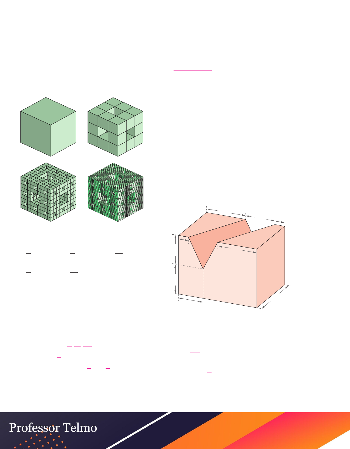 Sólidos GeométricosM17 Matemática 32 Cálculo das áreas das faces: Fig. 1: S1 = 1 m 2 Fig. 2: S m 2 2 21 1 3 1 1 9 8 9 = − = − = Fig. 3: S m 3 2 28 9 8 1 9 8 9 8 81 64 81 = − 9 = − = Fig. 4: S m 4 2 264 81 64 1 27 64 81 64 729 512 729 = − 9 = − = A seqüência das áreas: 1 8 9 64 81 512 729 , , , , ... é uma PG em que a e q 1 1 8 9 = = . Portanto, temos: a30 = a q 1 29 29 29 1 8 9 8 9 9 = 9 = . 5 (UEL-PR) A figura construída segundo a seqüência abaixo é denominada Esponja de Sierpinski ou Esponja de Menger. Representa um fractal gerado a partir de um cubo. Partindo-se do cubo inicial, obtêm-se outros cubos menores, com arestas iguais a 1 3 da aresta deste. O cubo central e os cubos do centro de cada face são removidos. O procedimento se repete em cada um dos cubos meno- res restantes. O processo é interado infinitas vezes, ge- rando a Esponja. X 7 (UnB-DF) Considere o sólido obtido de um paralele- pípedo retângulo, retirando-se um prisma, conforme in- dica a figura abaixo. Calcule, em centímetros cúbicos, a metade do volume des- se sólido. V S V cm B b H B = = 9 9 = = 9 3 3 2 4 18 18 3→ A metade do volume V cm é . 2 87 3= V = 192 − 18 = 174 Θ V = 174 cm3 Sejam A o paralelepípedo de dimensões 8 cm Ο 4 cm Ο 6 cm e B o prisma retirado. O prisma retirado B tem altura H = 4 cm e a base é um triângulo em que um dos lados mede 3 cm e a respectiva altura, 3 cm. V = VA − VB VA = 8 9 4 9 6 = 192 → VA = 192 cm 3 1 cm 4 cm 3 cm 1 cm 4 c m 3 cm 3 cm 2,5 cm 4 cm 6 (MACK-SP) Um poliedro convexo tem 3 faces trian- gulares, 4 quadrangulares e 5 pentagonais. O número de vértices desse poliedro é: a) 25 b) 12 c) 15 d) 9 e) 13 V − A 0 F = 2 Θ V − 25 0 12 = 2 → V = 15 F = 3 0 4 0 5 → F = 12 A A= 9 0 9 0 9 = 3 3 4 4 5 5 2 25→ X Supondo que a medida da aresta do cubo inicial seja igual a 1 m, qual é a área, em m2, de uma face da figura 30? a) 8 9 30 c) 9 8 30 e) 27 20 19 b) 8 9 29 d) 20 27 19 Fig. 1 Fig. 2 Fig. 3 Fig. 4 031_037_CA_Matem_3 09.10.06, 15:2532