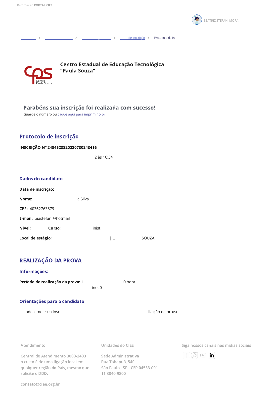 Parabéns sua inscrição foi realizada com sucesso! Guarde o número ou clique aqui para imprimir o protocolo para comprovar sua inscrição! Dados do candidato Data de inscrição: 30/07/2022 às 16:34 horas Nome: Beatriz Stefani Morais da Silva CPF: 40362763879 E-mail: biastefani@hotmail.com Nivel: Técnico Curso: Técnico em Administração Local de estágio: 1° Opção | SP | VOTORANTIM | CENTRO PAULA SOUZA REALIZAÇÃO DA PROVA Período de realização da prova: Início: 20/07/2022 00:00 horas Término: 08/08/2022 12:00 horas Orientações para o candidato Agradecemos sua inscrição e pedimos que se atente ao prazo para realização da prova. Retornar ao PORTAL CIEE BEATRIZ STEFANI MORAIS DA SILVA Home CIEE Processos Seletivos Detalhes do processo Ficha de Inscrição Protocolo de Inscrição Centro Estadual de Educação Tecnológica "Paula Souza" Edital 01/2022 Fazer prova Status da prova: Liberada Protocolo de inscrição INSCRIÇÃO N° 2484523820220730243416 Data de emissão do protocolo: 30/07/2022 às 16:34 horas Informações: Atendimento Central de Atendimento 3003-2433 o custo é de uma ligação local em qualquer região do País, mesmo que solicite o DDD. contato@ciee.org.br Unidades do CIEE Sede Administrativa Rua Tabapuã, 540 São Paulo - SP - CEP 04533-001 11 3040-9800 Siga nossos canais nas mídias sociais https://pp.ciee.org.br/home https://portal.ciee.org.br/para-voce/processos-seletivos-especiais/orgaos-publicos/ https://pp.ciee.org.br/ https://pp.ciee.org.br/vitrine https://pp.ciee.org.br/vitrine/5734/detalhe https://pp.ciee.org.br/vitrine/5734/detalhe/inscricao https://www.facebook.com/oficial.ciee/ https://www.instagram.com/oficial.ciee/ https://www.youtube.com/channel/UCwK-Dc7_6PYqzBzb_AIxacQ https://www.linkedin.com/company/oficialciee/