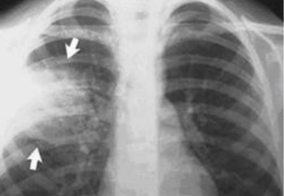 Princípios em radiologia, proteção radiológica e contrastes Preenchimento alveolar: material mais denso (deixa de ser radiotransparente para ser radiopaco) Opacidade homogênea: consolidação. Decorre de preenchimento alveolar Paciente com insuficiência cardíaca: sangue acumula no AE, veias pulmonares, aumento da pressão hidrostática, transudato: opacidade Padrão alveolar: preenchimento do alvéolo. Padrão acinar (mesma nomenclatura) · Extensão variável: decorrência do preenchimento do alvéolo · Exsudato; transudato; sangue; células neoplásicas · Um padrão de consolidação não é patognomônico · Mesmo tipo de alteração radiológica · Uma consolidação não revela um diagnóstico, deve ver o contexto clínico Inflamação: direcionamento das células de defesa para um local que houve um insulto Em alguns momentos, perde a homogeneidade: não fica tão branco (principalmente nas extremidades) O brônquio não fica preenchido, tem apenas ar: broncograma aéreo. Gera imagem de contraste. Ao redor do brônquio tem muitos alvéolos preenchidos. Isso é uma característica da consolidação · Colabamento alveolar: atelectasia · Quando tudo está colabado, o brônquio também colaba. Na atelectasia não tem broncograma aérea Atelectasia: - Colabamento pulmonar - Opacidade - Sem broncograma aéreo - A ventilação pulmonar está comprometida - Pode ser de apenas algum segmento e não de todo o pulmão - Causas: . Obstrutiva. Ex: pneumonia: preenche de secreção e impede que o ar chegue ao pulmão . Compressão. Ex: pneumotórax: compressão extrínseca do pulmão: não consegue expandir; derrame pleural . Déficit de expansão. Ex: fratura de costela: a dor do movimento torácico faz impedir a expansão. . Déficit de surfactante. Ex: parto prematuro: síndrome da membrana hialina e síndrome da angústia respiratória · Hemitorax esquerdo está mais radiotransparente que o direito. Atelectasia de compressão; ausculta pulmonar ausente. Pneumotórax · Pulmão todo colabado circulado broncograma aéreo Pneumotórax hipertensivo; deslocou a traqueia para depois da linha média (apontado pela seta). Pneumotórax à direita, hipertensivo porque á um desvio da traqueia contralateral; hemitórax à esquerda: opacidade total: pulmão à esquerda colabado e mediastino todo desviado; Situação reversível · Pneumotórax hipertensivo: desvio do mediano contralateral · Atelectasia secundária: ipsilateral (atelectasia que surge da compressão, corroborando para o desvio) · Tem atelectasia nos 2 pulmões, mas só vê de um lado porque empurra para o esquerdo · Tratamento do pneumotórax: dreno Febre: acima de 38,3ºC; subfebril: 37,8-38,2 ºC · Homem, 54 nos, portador de hipertensão arterial. Procura pronto-atendimento com queixa de febre (38,5ºC), dispneia e tosse produtiva iniciado há 2 dias, com piora nas últimas 24h. À ausculta respiratória, notado crepitações em base D. · Creptação: . Preenchimento alveolar (pneumonia, congestão pulmonar, contusão pulmonar e preenchimento com sangue) . Alteração da estrutura do alvéolo: fibrose pulmonar · Broncograma aéreo · HD: pneumonia Padrão intersticial: - Tecido que sustenta a estrutura do alvéolo - Não é específico de nenhum doença - Peribroncovascular: entre o brônquio e o vaso (hilo); Borramento do hilo . Preenchimento: busca alteração no hilo . ICC esquerda: aumento da pressão nos vasos pulmonares . Linfaginte: inflamação dos vasos linfáticos do hilo - Subpleural: cisuras . Líquido . Linhas horizontais em relação ao diafragma radiopacas . Preenchimento do espaço subpleural . Linha B de Kerley . Ficam na periferia . Preechimento de cisuras . Sangue acumulado: pode evoluir para padrão alveolar se extravasar seta: cisura; circulo inferior: borramento do hilo; circulo superior: feixe broncovascular aparecendo a 3 cm do ápice do pulmão · Cefalização de fluxo: hilo ingurgitado (insuciência cardíaca, linfangite): aparece nos locais que antes não apareciam (3 cm do ápice) · Insuficiência cardíaca: presença de anéis metálicos: corta do esterno e, para reconectar, o fio é metálico (ponta de setas pretas) · No arco da aorta, há uma linha branca: calcificação na aorta: aterosclerose · Presença da artéria pulmonar: vaso ingurgitado (seta azul) - Parenquimatosa: parede do alvéolo: . Padrão reticular . Tuberculose: a bactéria pode se alojar no interstício do parênquima: formação de micronódulos (padrão micronodular) . Cefalização de fluxo Reticular micronodular reticulo-nodular Não é alveolar porque está muito difuso Raio X com padrão nodular ou micrnodular: investigar tuberculose miliar · Tuberculose miliar: disseminada · Tuberculose normal: cavitação Ingurgita o feixe vascular, o líquido sai do vaso e forma o padrão alveolar Sinal da silhueta Quando a opacidade independente do padrão atrapalha a visualização da silhueta cardíaca Nódulos e massas: - Nódulo: radiopaco . Menor que 3 cm - Massa: opacidade . Maior que tem 3 cm - Limites mais bem definidos - Quanto maior o tamanho, maior o risco de ser maligno - Quanto mais irregular, mais chance de ser maligno - Quanto mais calcificado, menor a chance de ser maligno · Calcificação em formato pipoca em nódulo único do pulmão: hamartoma (benigna) Escavação: - Tinha um nódulo e o centro dela vai sofrendo necrose; o material vai sendo reabsorvido - Tuberculose - Aspergilose: fungo - Estafilococus: bacteria - Câncer: pode sofrer necrose e gerar a escavação - Em ápice: tuberculose - Quanto mais espessa a parede, a lesão está em atividade - Nível hidroaéreo: entre um componente líquido e ar . Em cima já necrosou, mas embaixo ainda está liquefazendo - Quanto mais fino o contorno, mais próximo da resolução DPOC: - Componente de enfisema . Lesão do parênquima . Quebra as estruturas do alvéolo . Aprisionamento aéreo: o ar entra, mas tem dificuldade de sair . Perda da elasticidade para