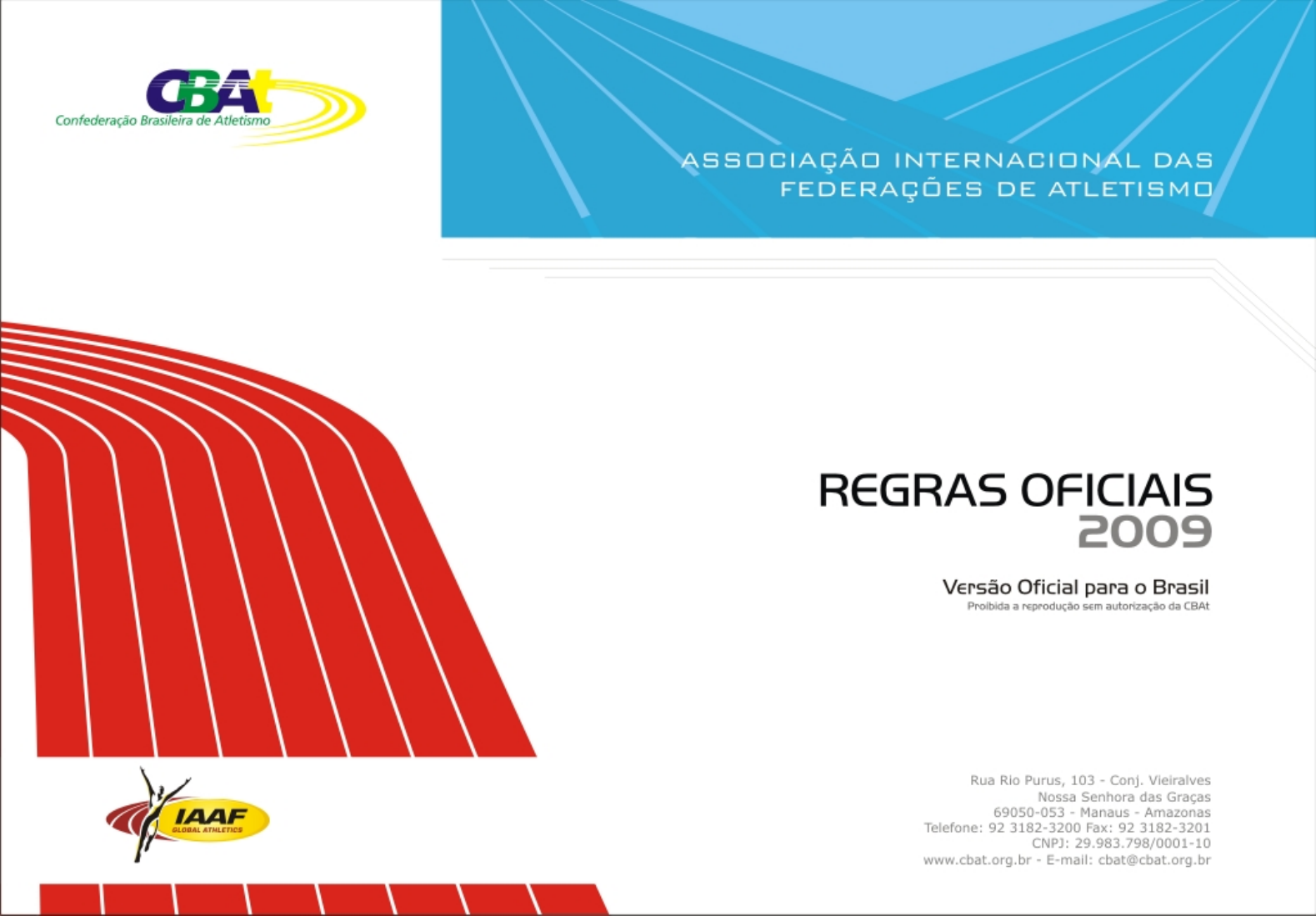 1 2 ATLETISMO REGRAS OFICIAIS DE COMPETIÇÃO 2008 - 2009 IAAF Versão Oficial Brasileira CBAt - Confederação Brasileira de Atletismo Tradução: Alda Martins Pires Frederico Silveira Nantes Harley Maciel da Silva Revisão: Martinho Nobre dos Santos Harley Maciel da Silva DIRETORIA Período 2009 / 2012 Presidente Roberto Gesta de Melo Vice-Presidente Nelson Prudêncio Conselho Fiscal Membros efetivos Benedicto Cruz lyra Sérgio Augusto Cruz de Oliveira Luiz Carlos Araujo Brandão Membros suplentes César Teixeira Lindoso Raimundo Limongi Cabral Carlos Fausto Ventura Gonçalves Secretário Geral Martinho Nobre dos Santos Diretoria Diretor Administrativo Álvaro Leal Sanches Diretor Financeiro Miguel Brandão Câmara Diretor Técnico José Haroldo Loureiro Gomes Diretor de Relações Exteriores Agberto Conceição Guimarães Diretor de Relações Públicas Manoel do Carmo Chaves Neto Diretor de Desenvolvimento Sérgio Luís Coutinho Nogueira Diretora Social Maria da Conceição Aparecida Sales Oficial Anti-Doping Dr. Thomaz Sousa Lima Mattos de Paiva Assessores Assessor jurídico Dr. Élson Rodrigues de Andrade Assessor médico Dr. Cristiano Frota de Souza Laurino Assessor de Veteranos Osvaldo Valdemir Pizani Assessor de Corridas de Rua José Rodolfo Eichler Assessor de Ultra-Maratona Valmir Nunes Assessoria de imprensa Benedito Turco Conselho Técnico Consultivo 3 Presidente João Paulo Alves da Cunha Membros Jayme Netto Junior Nélio Alfano Moura Ricardo Antônio D’Angelo Katsuhiko Nakaya Adauto Domingues Elson Miranda de Souza Antonio Henrique Dias Vianna Claudio Roberto de Castilho Luiz Alberto de Oliveira Comissão de atletas Presidente Nelson Prudêncio Membros Vanderlei Cordeiro de Lima Maurren Higa Maggi Comitê Feminino Presidente Maria Magnólia de Souza Figueiredo Membros Carmem de Oliveira Furtado Esmeralda de Jesus Freitas Garcia Agência Nacional de Combate ao Doping Presidente Thomaz Mattos de Paiva Membros Rafael de Souza Trindade Martinho Nobre dos Santos Superior Tribunal de Justiça Desportiva Presidente Alberto dos Santos Puga Barbosa Vice-Presidente Caupolican Padilha Junior Membros Laurênio Maia Viga Ruy Gama e Silva José Luiz Ribeiro Mauro de Siqueira Queiroz Maria Benigno Maria Thereza Ventura Carvalho Wagner Serpa Vidal Procurador Antonio Marcos Martins Rodrigues Comissão Disciplinar Presidente Affimar Cabo Verde Filho Membros Pedro Augusto Oliveira da Silva Mario Augusto Marques da Costa André Farias de Oliveira Sebastião Gonçalves Guimarães Filho Procurador Edson Rosas Junior MEMBROS EMÉRITOS Título concedido pela Assembléia Geral da CBAt: - de 1997 a 2003: para os atletas brasileiros que obtiveram grande destaque a nível mundial; - A partir de 8.12.2003, com aprovação do novo Estatuto da CBAt, passou a ser concedido para aqueles que se destacarem por serviços relevantes prestados ao Atletismo brasileiro. Nome Data Adhemar Ferreira da Silva 26.2.1988 João Carlos de Oliveira 26.2.1988 Joaquim Carvalho Cruz 26.2.1988 Nelson Prudêncio 26.2.1988 José Telles da Conceição (in memorian) 26.2.1988 José Luiz Barbosa 26.2.1988 Robson Caetano da Silva 26.2.1988 Odete Valentino domingos 26.2.1988 Altevir Silva de Araújo Filho 26.2.1988 Nelson Rocha dos Santos 26.2.1988 Luiz Antonio dos Santos 08.2.1996 Ronaldo da Costa 08.2.1996 Delmir Alves dos Santos 08.2.1996 Artur de Freitas Castro 08.2.1996 4 André Domingos da Silva 19.1.1998 Arnaldo de Oliveira Silva 19.1.1998 Edson Luciano Ribeiro 19.1.1998 Clodoaldo Gomes da Silva 19.1.1998 Edgar Martins de Oliveira 19.1.1998 Wander do Prado Moura 19.1.1998 Tomix Alves da Costa 19.01.1998 Vanderlei Cordeiro de Lima 19.01.1998 Eder Moreno Fialho 19.01.1998 Osmiro de Souza Silva 19.01.1998 Valdenor Pereira dos Santos 19.01.1998 Claudinei Quirino da Silva 19.1.1998 Sanderlei Claro Parrela 8.1.2001 Claudio Roberto Souza 8.1.2001 Vicente Lenilson de Lima 8.1.2001 Eronilde Nunes de Araujo 8.1.2001 Ana Jun Yamamoto (in memorian) 17.2.2004 Victor Malzoni Júnior 17.2.2004 Amaro Klautau 28.3.2005 José Angelo Miranda 28.3.2005 Roosevelt Pereira de Melo (in memoriam) 28.3.2005 Osvaldo Valdemir Pizani 05.02.2006 Yolanda Vidal Queiroz 27.04.2006 Aluízio Humberto Ayres da Cruz 12.02.2007 Bernardo Cabral 12.02.2007 Manoel Trajano Dantas Neto 12.02.2007 Warlindo Carneiro da Silva Filho 12.02.2007 Maria da Conceição Silva 12.02.2007 Lamine Diack 25.05.2007 MEMBROS BENEMÉRITOS Título concedido pela Assembléia Geral da CBAt: - de 1997 a 2003: para os Grandes Benfeitores do Atletismo Brasileiro; - a partir de 08.12.2003, com aprovação do novo Estatuto da CBAt, passou a ser concedido para aqueles que, já possuindo o título de Emérito, tenham prestado ao Atletismo brasileiro serviços relevantes dignos de realce. Nome Data João Havelange 1.9.1978 Sylvio de Magalhães Padilha 1.9.1978 Heleno de Barros Nunes 1.9.1978 João Lyra Filho 1.9.1978 Jerônymo Baptista Bastos 1.9.1978 Péricles de Souza Cavalcanti 30.1.1981 Hélio Babo 30.1.1981 Amazonino Armando Mendes 26.2.1988 Evald Gomes da Silva (in memorian) 26.2.1988 João Corrêa da Costa 26.2.1988 José Oswaldo Passarelli 26.2.1988 Waldemar Areno 26.2.1988 Alfredo Alberto Leal Nunes 14.1.1989 Hugo Napoleão 14.1.1989 Roberto Gesta de Melo 23.1.1990 Vivaldo Barros Frota 25.1.1991 Arthur Virgílio do Carmo Ribeiro Neto 25.1.1991 Paulo Constantino 25.1.1991 Ricardo Barros 25.1.1991 José Alves Pacífico 25.1.1991 Arthur Antunes Coimbra 25.1.1991 Ézio Ferreira de Souza 25.1.1991 Gilberto Mestrinho de Medeiros Raposo 29.2.1992 Bernard Rajzan 29.2.1992 Artur da Távola 31.3.1995 Alda Martins Pires 8.2.1996 Sérgio Roberto Vieira da Mota 19.1.1998 Antônio Brito Filho 19.1.1998 Martinho Nobre dos Santos 21.3.1999 Carlos Carmo Andrades Melles 08.1.2001 Manoel Félix Cintra Neto 30.10.2001 Almir José de Oliveira Gabriel 30.10.2001 Lars Grael 10.2.2003 Francisco Manoel de Carvalho 10.2.2003 MEMBROS GRANDE BENEMÉRITOS Título criado pela Assembléia Geral, a partir de 08.12.2