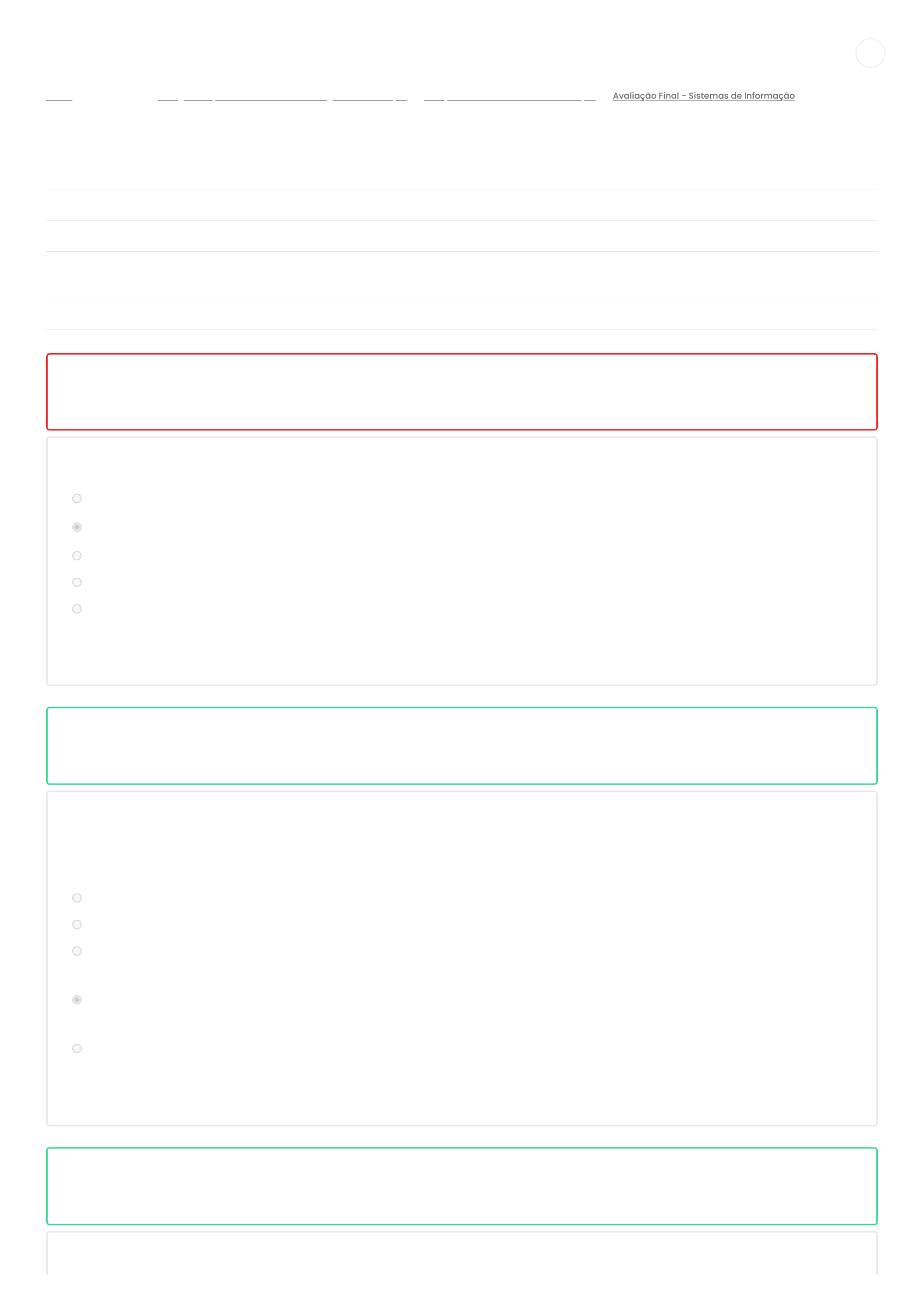 29/08/2022 21:33 Avaliação Final - Sistemas de Informação: Revisão da tentativa https://ava.cenes.com.br/mod/quiz/review.php?attempt=61789&cmid=2237 1/4 - Meus cursos - - - Painel Pós-graduação em Gestão da Tecnologia de Informação Disciplina 05 - Sistemas de Informação Avaliação Final - Sistemas de Informação Iniciado em Monday, 29 Aug 2022, 20:48 Estado Finalizada Concluída em Monday, 29 Aug 2022, 21:15 Tempo empregado 26 minutos 8 segundos Avaliar 7,0 de um máximo de 10,0(70%) Questão 1 Incorreto Atingiu 0,0 de 1,0 Qual é um requisito específico de um software? a. O software é um conjunto de comandos cuja sequência definida não afeta o resultado. b. Softwares de base são projetados para atender demandas específicas dos usuários finais. c. É obrigatório que o software apresente uma licença de distribuição especificada. d. Os softwares de aplicação são basicamente sistemas operacionais. e. Softwares não têm características de produtos conceituais ou lógicos. A resposta correta é: É obrigatório que o software apresente uma licença de distribuição especificada. Questão 2 Correto Atingiu 1,0 de 1,0 ERPs (Planejamento de Recursos Empresariais – Enterprise Resource Planning), também denominados de sistemas de gestão integrados, apresentam níveis de informações transacionais e gerenciais. Marque a alternativa correta que corresponde a esse sistema: a. Sistemas funcionais. b. Sistemas especialistas. c. Sistemas de gestão de manufatura. d. Sistemas multifuncionais. Os ERPs – ou sistemas de gestão empresarial – são sistemas multifuncionais, pois integram todas as áreas funcionais de uma organização. Esse processo de integração entre áreas funcionais é realizado devido a características peculiares dos sistemas de informações do tipo ERPs, de integração das informações. e. Sistemas inteligentes. A resposta correta é: Sistemas multifuncionais. Questão 3 Correto Atingiu 1,0 de 1,0 Qual a diferença entre Sistemas de Informação (SI) e Tecnologia da Informação (TI)? Assinale a alternativa https://ava.cenes.com.br/my/ https://ava.cenes.com.br/course/view.php?id=25 https://ava.cenes.com.br/course/view.php?id=25§ion=7 https://ava.cenes.com.br/mod/quiz/view.php?id=2237 29/08/2022 21:33 Avaliação Final - Sistemas de Informação: Revisão da tentativa https://ava.cenes.com.br/mod/quiz/review.php?attempt=61789&cmid=2237 2/4 correta. a. O termo Sistemas de Informação abrange componentes que são inter-relacionados que, juntos, coletam, processam, armazenam e distribuem informações. Já o termo TI é usado para se referir à infraestrutura, técnicas de implementação e formas de comunicação (redes, internet etc.). Os conceitos referentes aos Sistemas de Informação (SI) e à Tecnologia da Informação (TI) diferem entre si. Os SI envolvem os conceitos de componentes que coletam, processam, armazenam e distribuem informações. Já o termo TI é mais amplo e se refere à infraestrutura, técnicas de implementação e formas de comunicação (redes, internet etc.). b. O termo Sistemas de Informação se refere somente a parte de infraestrutura e as técnicas de desenvolvimento de sistemas de uma empresa. Já o termo TI é usado para se referir aos componentes que são inter-relacionados que, juntos, coletam, processam, armazenam e distribuem informações. c. O termo Sistemas de Informação inclui componentes que são inter-relacionados que, separadamente, coletam, processam, armazenam e distribuem informações. Já o termo TI é usado para se referir à infraestrutura, técnicas de implementação e formas de comunicação (linguagens de programação, protocolos de internet). d. O termo Sistemas de Informação abrange a infraestrutura, técnicas de implementação e formas de comunicação (redes, internet etc.). Já o termo TI é usado para se referir aos componentes que são inter-relacionados que, juntos, coletam, processam, armazenam e distribuem informações. e. O termo Sistemas de Informação abrange componentes que são inter-relacionados que, juntos, coletam, processam, armazenam e distribuem informações. Já o termo TI é usado para se referir à toda parte de documentação do desenvolvimento de soluções tecnológicas. A resposta correta é: O termo Sistemas de Informação abrange componentes que são inter-relacionados que, juntos, coletam, processam, armazenam e distribuem informações. Já o termo TI é usado para se referir à infraestrutura, técnicas de implementação e formas de comunicação (redes, internet etc.). Questão 4 Correto Atingiu 1,0 de 1,0 Qual é uma importante característica do processo de transformação digital na indústria 4.0? a. O processamento de informações deve ser programado para ocorrer apenas em horários pré-agendados. b. A criação de processos adaptáveis e dinâmicos não é relevante no contexto de indústria 4.0 c. A transformação digital diz respeito ao projeto de dissociar as tarefas cotidianas do uso de tecnologias da informação. d. A virtualização é importante para segurança e disponibilidade da informação, que é um recurso fundamental para a tomada de decisão. A virtualização é o recurso que permite a existência de cópias virtuais das informações, que podem ser utilizadas tanto para serem acessadas de forma remoto como para recuperação de base de dados e restauração de funcionamento de serviços e processos. e. As máquinas devem ser fixadas em seus setores atendendo sempre ao mesmo tipo de demanda. A resposta correta é: A virtualização é importante para segurança e disponibilidade da informação, que é um recurso fundamental para a tomada de decisão. Questão 5 Correto Atingiu 1,0 de 1,0 Os dados são informação chamadas de brutas, pois representam numérica ou alfabeticamente um registro. Além disso, eles podem ser classificados em alfanuméricos, áudio, imagem, vídeo etc. Um exemplo de um dado alfanumérico 