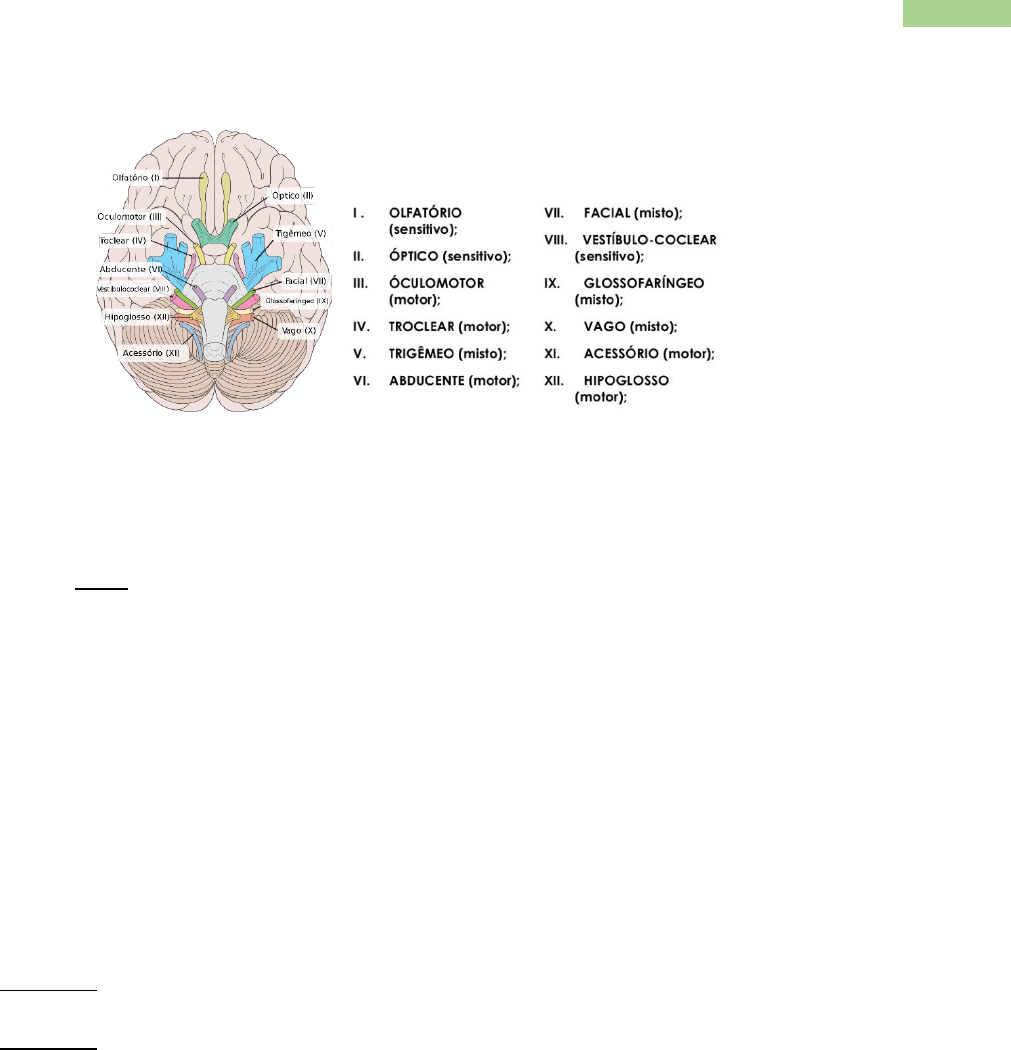 1 Larissa Monique Brand, UCPel, ATM 23 PARES CRANIANOS -Os 12 pares cranianos têm origem no tronco cerebral, ou se dirigem para ele (exceto os 2 primeiros). I: OLFATÓRIO -Pesquisar com: álcool, limão, cânfora, hortelã, vinagre. Testar cada narina separadamente. -Alterações: anosmia (olfato abolido), hiposmia (diminuição do olfato), parosmia (perversão do olfato), alucinações olfatórias e cacosmia (sensação olfatória desagradável). -Doenças: traumatismo cranioencefálico (com lesão de lâmina crivosa do osso etmoide na fratura de base de crânio), tumores (glioma frontal ou meningeoma e tabes dorsalis- esta leva a alteração de marcha e do sistema neurológico devido a sífilis não tratada). -Causas comuns de modificação do olfato: rinites, resfriado, atrofia de mucosa. II: ÓPTICO -Acuidade visual: analisar cada olho separadamente. Alterações: ▫ Ambliopia: deficiência visual (uni ou bilateral). Causada por neurite óptica, neoplasia ou hipertensão intracraniana). ▫ Amaurose: ausência ou privação de visão (uni ou bilateral). Causada por neurite óptica, neoplasia ou hipertensão intracraniana). ▫ Discromatopsia: distúrbio da visão para cores. ▫ Cegueira absoluta: perda da visão central e periférica, por lesão cortical. ▫ Hemeralopia: cegueira diurna. Nictalopia: cegueira noturna. ▫ Há tabelas para avaliar a acuidade visual (Tabela de Jaeger...). -Fundo de olho: testar a fundoscopia com oftalmoscópio. ▫ Observa-se tecido nervoso (retina e papila) e vasos (veias, artérias e arteríolas). ▫ Paciente com edema cerebral ou aumento da pressão intracraniana (por trauma grave ou tumor) o exame muda (mácula muda de amarelo para cinza, e diminui de tamanho, há edema de papila). ▫ Pressão normal dentro do cérebro: 12mmHg. 2 Larissa Monique Brand, UCPel, ATM 23 ▫ Paciente diabético: há neovascularização da retina (retinopatia diabética). Pode levar à cegueira. -Campo visual: representa o limite das visões periféricas. Estudo das hemianopsias. ▫ Exame: sentado, o paciente fixa um ponto na face do examinador, que desloca um objeto nos sentidos horizontal e vertical, e o paciente dirá até que ponto está “percebendo o objeto”. ▫ As alterações campimétricas causadas por neoplasias, infecção e desmielinação são anotadas em campo visual, e não à retina. ▫ Raio normal: de 122 a 128cm de raio. ▫ Fibras temporais e nasais determinam o campo visual. ▫ Fibra temporal dá o campo nasal, e fibra nasal dá campo temporal. III: OCULOMOTOR -Os nervos oculomotores são 3: III, IV e VI. ▫ Lesão do III par: ptose palpebral, midríase e estrabismo divergente. ▫ Lesão do IV par: pode haver uma diplopia vertical (olho desviado para cima e para dentro). Olha patético (fixo, sem movimentação do globo ocular). ▫ Lesão do VI par: estrabismo convergente e diplopia. -Os três pares são examinados em conjunto pois inervam os músculos extrínsecos do globo ocular, além do ciliar e esfíncter da pupila (intrínsecos) inervados pelo II par, além da musculatura elevadora da pálpebra. -Investigação semiológica: ▫ Motilidade extrínseca: se houver predomínio de um dos músculos (por paresia ou paralisia), ocorre estrabismo (desvio do eixo normal do olho) horizontal ou vertical, e diplopia. “Prova de convergência” é feita aproximando um objeto dos olhos do paciente. ▫ Motilidade intrínseca: exame da pupila. Discoria (irregularidade), midríase (dilatação), miose (contração), isocoria (igualdade), anisocoria (desigualdade). Exame: feixe luminoso e convergência ocular. O examinador incide um feixe de luzem uma pupila (reflexo fotomotor direto) e observa a pupila oposta (reflexo fotomotor consensual). 3 Larissa Monique Brand, UCPel, ATM 23 -As causas mais comuns de lesão do III nervo são: traumatismos, diabetes melito, aneurisma intracraniano, hipertensão intracraniana e neoplasia selar. -Miastenia grave: persistência do timo funcionante após a infância. A doença leva à fraqueza muscular. Um dos sinais é a ptose palpebral bilateral, dando olhar característico de “sol poente” (apertando os olhos). V: TRIGÊMEO -É um nervo misto. Tem fibras motoras para os músculos da mastigação (masseter e pterigoide) e sensitivas que provém da face e do crânio: ▫ Ramo oftálmico (I): dá a sensibilidade extereoceptiva da porção anterior do crânio, região supraciliar, pálpebra superior e face lateral do nariz. ▫ Ramo maxilar (II): sensibilidade do lábio superior, úvula e nasofaringe. ▫ Ramo mandibular (III): mento, lábio inferior e 2/3 anteriores da língua. 4 Larissa Monique Brand, UCPel, ATM 23 -É um dos nervos mais importantes para o exame físico do paciente. Dentistas usam anestesia nele. -Avaliação dos músculos da mastigação: pedir que o paciente trique os dentes. Quando há lesão unilateral do nervo, a mandíbula desvia para o lado da lesão -Estudo da sensibilidade ao calor, frio, dor, tato e pressão. -Reflexo corneo-palpebral: coloca-se algodão na córnea e o paciente pisca. -Alterações do trigêmeo podem ser consequência de herpes-zóster, traumatismo e neoplasias. -OBS: neuralgia do trigêmeo (uma das piores dores existentes, provocada pelo ramo oftálmico do nervo), neurinoma do trigêmeo, herpes oftálmico (mais comum em imunodeprimidos descompensados). PARALISIA DO V VII: FACIAL -Funções: motoras, sensitivas, sensoriais e vegetativas. ▫ Motora: mímica facial (esclerodermia: doença reumática que tira a expressão facial). ▫ Sensibilidade geral: propiocepção da face. ▫ Sensorial: 2/3 anteriores gustativos da língua. ▫ Vegetativa: secreção de glândulas salivares (parótidas, sublinguais e submandibulares). OBS: caxumba: vírus epidêmico que afeta a parótida, causando edema. O nervo facial não inerva, mas passa sobre a parótida. Quando a caxumba tem edema muito grande, pode causar paralisia facial. ▫ Estudo das paralisias faciais. -Exame: pede