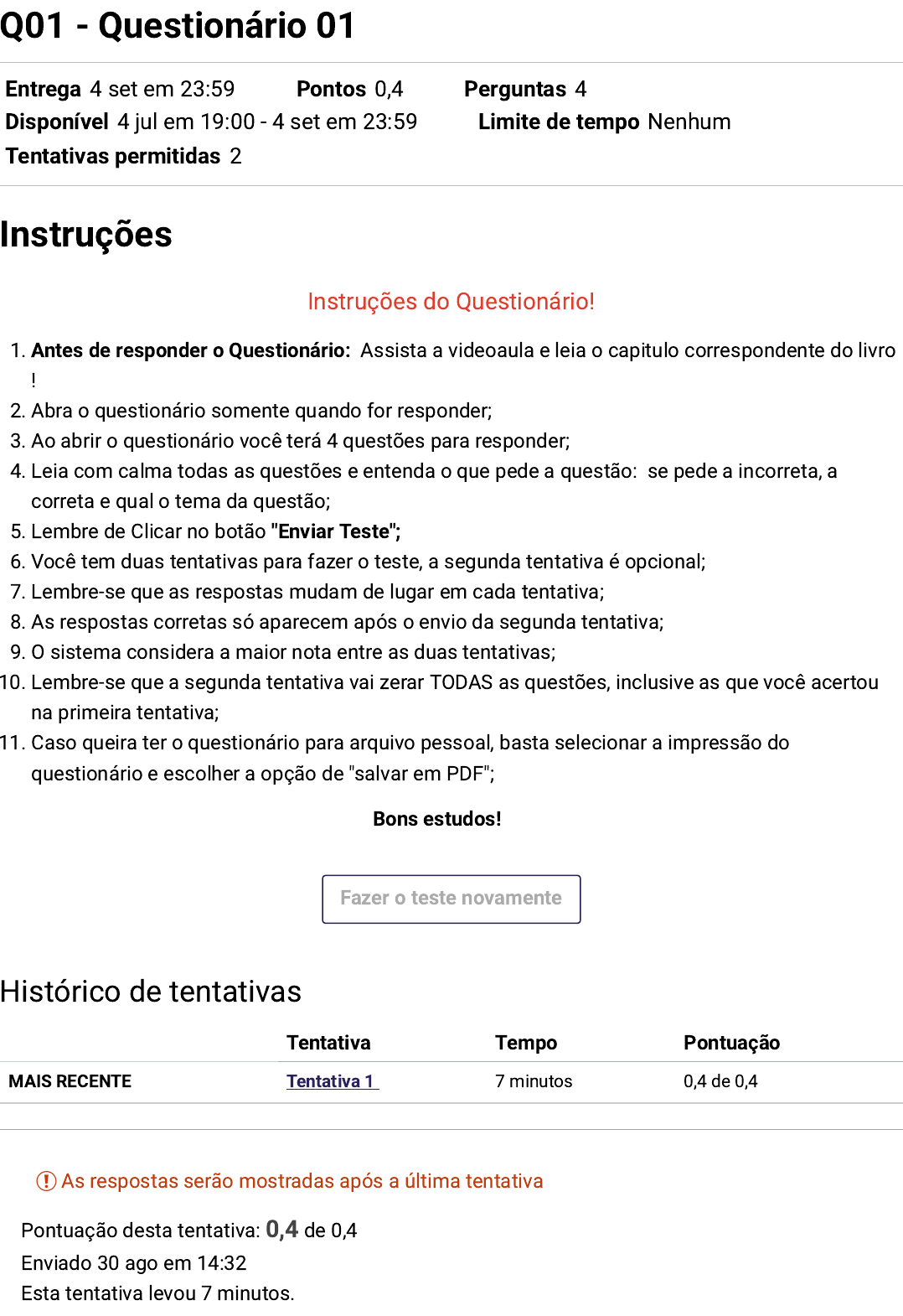 Q01 - Questionário 01 Entrega 4 set em 23:59 Pontos 0,4 Perguntas 4 Disponível 4 jul em 19:00 - 4 set em 23:59 Limite de tempo Nenhum Tentativas permitidas 2 Instruções Histórico de tentativas Tentativa Tempo Pontuação MAIS RECENTE Tentativa 1 7 minutos 0,4 de 0,4 As respostas serão mostradas após a última tentativa Pontuação desta tentativa: 0,4 de 0,4 Enviado 30 ago em 14:32 Esta tentativa levou 7 minutos. Instruções do Questionário! 1. Antes de responder o Questionário: Assista a videoaula e leia o capitulo correspondente do livro ! 2. Abra o questionário somente quando for responder; 3. Ao abrir o questionário você terá 4 questões para responder; 4. Leia com calma todas as questões e entenda o que pede a questão: se pede a incorreta, a correta e qual o tema da questão; 5. Lembre de Clicar no botão "Enviar Teste"; �. Você tem duas tentativas para fazer o teste, a segunda tentativa é opcional; 7. Lembre-se que as respostas mudam de lugar em cada tentativa; �. As respostas corretas só aparecem após o envio da segunda tentativa; 9. O sistema considera a maior nota entre as duas tentativas; 10. Lembre-se que a segunda tentativa vai zerar TODAS as questões, inclusive as que você acertou na primeira tentativa; 11. Caso queira ter o questionário para arquivo pessoal, basta selecionar a impressão do questionário e escolher a opção de "salvar em PDF"; Bons estudos! 😀 Fazer o teste novamente https://ucaead.instructure.com/courses/58694/quizzes/90407/history?version=1 https://ucaead.instructure.com/courses/58694/quizzes/90407/take?user_id=26926 0,1 / 0,1 ptsPergunta 1 A conformação do pensamento sociológico iniciou-se com Auguste Comte, precursor da preocupação com a análise do homem em sociedade e suas relações, naquilo que ficou conhecido como Física Social. Em seus escritos, o autor descreveu um conjunto de reflexões sobre a vida em coletividade, dentre os quais está a perspectiva de estágios de desenvolvimento humano. Acerca desses estágios, analise as afirmações a seguir e assinale a alternativa correta: O estágio positivo é pautado pela observação e confirmação científica de aspectos da vida em sociedade. Os estágios de desenvolvimento humano decorrem de aspectos biológicos, portanto advêm das Ciências Naturais. O estágio teológico diz respeito à análise científica de tudo o que remete ao divino e às interpretações religiosas. O estágio de abstração se caracterizava pela ausência de preocupação com a comprovação de fenômenos sociais. Os três estágios do desenvolvimento humano são encontrados em cada indivíduo simultaneamente. 0,1 / 0,1 ptsPergunta 2 A discussão sobre os conceitos de sociedade e cultura e suas relações foi abordada com o intuito de apresentar a conformação da perspectiva do termo “sociocultural”. Nesse sentido, no que se refere à cultura, foi adotada a Antropologia como campo do conhecimento por meio do qual sua definição foi tratada. Acerca dessa temática, analise as afirmações a seguir e assinale a alternativa correta: A cultura brasileira varia conforme aspectos geográficos e perfis de indivíduos e grupos sociais. Os estudos sobre cultura dizem respeito especificamente às práticas artísticas de um povo. O debate antropológico sobre cultura determina padrões de manifestações entre os povos. Por ser relacionado a um povo, uma cultura remete exclusivamente ao que lhe é intrínseco. A cultura de uma sociedade é perene ao longo do tempo, ou seja, mantém-se estática. 0,1 / 0,1 ptsPergunta 3 Por se tratar de uma disciplina de formação em curso superior, ao tratarmos sobre Formação Sociocultural e Ética tendemos ao debate no campo da ciência, porém é necessária a compreensão de que existem diversos tipos de conhecimentos distintos, dentre os quais a ciência é apenas uma possibilidade a ser mobilizada pela população em geral. Sobre esse assunto, analise as afirmações a seguir: I – As crendices e tradições populares são importantes formas de conhecimento a ser reconhecidas. II – O conhecimento científico deve ser pautado pelo reconhecimento da ciência, sem contestação. III – O pensamento filosófico compõe um tipo de conhecimento pautado pela busca da sabedoria. IV – A religião é uma fonte de conhecimento dogmático, baseado em tradições reproduzidas por gerações. É correto o que se afirma apenas em: I, III e IV. II, III e IV. II e III. I e II. III e IV. 0,1 / 0,1 ptsPergunta 4 Moral e ética são dois termos que, não raras vezes, são tratados como sinônimos pela população em geral, bem como são recorrentes, por exemplo, em discursos políticos e em campanhas eleitorais, como remetendo a preceitos adequados para a vida em sociedade. Contudo, é preciso considerar que se trata de conceitos diferentes. Acerca do conceito de moral, analise as afirmações a seguir e assinale a alternativa correta: A efetivação da moral ocorre pela existência de leis, de modo que basta o respeito para sua legitimação em uma sociedade. Ainda que decorra de normas legais e regras, a moral se efetiva conforme a percepção dos indivíduos ou coletividade sobre ela. A moral existe independentemente das relações sociais ou da estrutura de sociedades, pois remete ao indivíduo em si. As normas morais existem em decorrência da ética e, nesse sentido, são iguais para qualquer sociedade independentemente da época. A moral diz respeito às regras impostas, baseadas em determinações legais, que desconsideram costumes do cotidiano. Pontuação do teste: 0,4 de 0,4