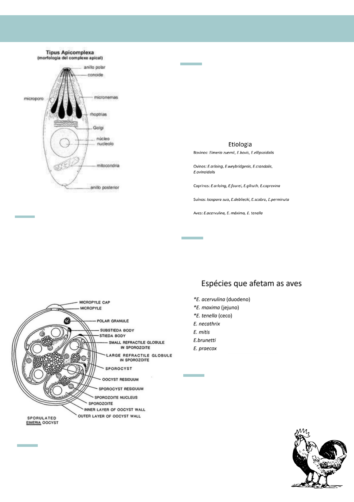 características Oocisto esporulado com 4 oocistos e 2 esporozoítos, parede do oocisto com dupla camada, esporocisto ovoíde, esporozoítos em forma de banana, microgametas (gametas masculinos) com 2-3 flagelos. Apresentam resistência na forma de oocisto, completam o ciclo de vida em um único hospedeiro (monoxeno), apresentam reprodução assexuada (merogonia), sexuada (gametogonia) e por esporogonia (meio exterior). COCCIDIOSE AVES Tem importância na avicultura principalmente em frangos de corte cujo tem camas no chão é pouco comum em galinhas poedeiras pela gaiola ser suspensa. É causada por protozoários que se multiplicam na mucosa intestinal causando danos, reduzindo a capacidade de absorver e digerir alimentos, mais comum em aves jovens, depois que reconhecem os antígenos se tornam imunes contra futuras infecções. COCCIDIOSE É uma enterite contagiosa causada pela infecção com eimeria ssp. e/ou isospora ssp. ocorre em todos os animais domésticos, forma subclínica ou quadros de diarréia e disinteria, forma crônica com menor ganho de peso e produtividade. EPIDEMIOLOGIA Ocorrência mundial frquente em aves, leitões, ovinos e bezerros, maior importância em animais confinados, infecção espécie e hospedeiro-específica. Hospedeiros: caprinos, ovinos, suínos, bovinos, aves. O ciclo é monoxênico- fecal- oral DISTRIBUIÇÃO Eimeria sp. acomete todas as granjas comerciais seja de frango ou reprodutoras. Também é comum em aves de fundo de quintal. Cocc id ioses HEMOPARASITOSES MARIA BARROS fatores predisponentes Alimentação fora do comedouro, tipo de comedouro, cama úmida e suja, cama molhada sob os bebedouros, bebedouros que ficam balançando e derrubando água, problemas de instalação como por exemplo vazamento de água, aves molhadas e sujas. CICLO BIOLÓGICO A ave ingere o oocisto esporulado - há liberação de esporozoítos no intestino com invasão dos enterócitos - trofozoitos e esquizonte (esquizogonia) - microgamonte e macrogamonte (gametogonia)- liberação do microgamonte e fecundação do macrogamonte - zigoto - liberação do oocisto maduro não esporulado nas fezes. Com 24-48h na temperatura de 27-30ºC em um local com umidade o oocisto esporula se tornando infectante (4 esporocistos com 2 esporozoítos cada). O oocisto que é ingerido se rompe pela ação mecânica da moela ou ação enzimática do pró-ventrículo, os esporocistos são liberados e vão para o intestino pela ação da tripsina e ai os esporozoítos são liberados. Cada esporozoíto invade uma célula intestinal se torna arredondado se transformando em trofozoíto, a esquizogonia é iniciada formando o esquizonte imaturo de 1ª geração, ele se desenvolve podendo conter até 200 merozoítos que são liberados quando o esquizonte se torna maduro. FATORES PREDISPONENTES Distruição das células intestinais, diminuição da conversão alimentar, perda de peso, infecção bacteriana secundária, perda de sangue por hemorragia e diarréia sanguinolenta, taxa mortalidade, encurtamento da altura da vilosidade, distruição das células intestinais, perda de fluidos, hemorragias e susceptibilidade a outras doenças e queda de absorção de zinco, metionina, histidina, cálcio e glicose. DIAGNÓSTICO Exame de fezes, contagem de oocistos na cama, exame de raspado de mucosa intestinal, escores de lesões características da mucosa intestinal, histopatologia, exame parasitológico de fezes, achados de necropsia (áreas avermelhadas no duodeno, ceco distendido por sangue ou hemorrágico e engrossado, hemorragia extensa no intestino, fragmentos de mucosa intestinal nas fezes, atrofia das vilosidades duodenais). PREVENÇÃO E CONTROLE Manejo: evitar cama úmida, evitar estresse ambiental, regulagem de comedouros e bebedouros, qualidade da cama, temperatura do galpão. Drogas anticocidianas preventivas na ração sendo químicas como nicarbazina, halofuginona, diclazuril, amprolium, robenidina. Ionóforos como mosensina, salinomicina, narasina, maduramicina, lasalocida. O tratamento é feito com sulfas mas não é muito realizado. Vacinas vivas virulentas e atenuadas, eficientes na imunidade protetora mas como desvantagem tem custo elevado e possibilidade de causar doença. Vacinas recombinantes como a CoxAbic que é injetada na galinha com a mãe desenvolvendo a imunidade e passando pro pintinho. Esses merozoítos liberados é a fase mais patogênica causando hemorragia e alta mortalidade, entram em outras células intestinais formando um esquizonte imaturo de 2º geração que se rompe e libera merozoítos imaturos de 2ª geração, quando invadem as células se inicia a gametogonia formando um gametócito fêmea e um macho que se maturam (microgametócitos e macrogametócitos). O gametócito macho toma toda a célula lateralizando o núcleo da célula intestinal e formando microgametas biflagelados, O gametócito se rompe liberando microgametas que vão para a luz intestinal. Os microgametas procuram os gametócitos fêmea, há a fecundação resultando em um zigoto ou oocisto imaturo secretam uma substância que forma uma membrana adicional que aumenta a resistência do oocisto (membrana cística), A célula intestinal se rompe com o oocisto sendo liberado e eliminado pelas fezes. O ciclo dura de 4-7 dias e o período pré patente PPP (ingestão até eliminação) é de 4-6 dias. HEMOPARASITOSES MARIA BARROS Importância econômica Morbidade e mortalidade devida a infecções secundárias, leitegadas desiguais ao desmame, redução do peso médio ao desmame, custos de tratamento, trabalho com a limpeza de instalações. Transmissão Fontes de infecção: fezes de animais clinicamente infectados ou carreadores, ingestão de alimentos e águas contaminadas. Esporulação no ambiente a 12-32ºC, resistência a -7 e -8ºC, destruição em temperaturas acima de 35ºC e umidade maior que 25% e luz solar por mais de 4h. MARIA BARROS PATOGENIA CORDEIRO- Atrofia das vilosidades causando diarréia e