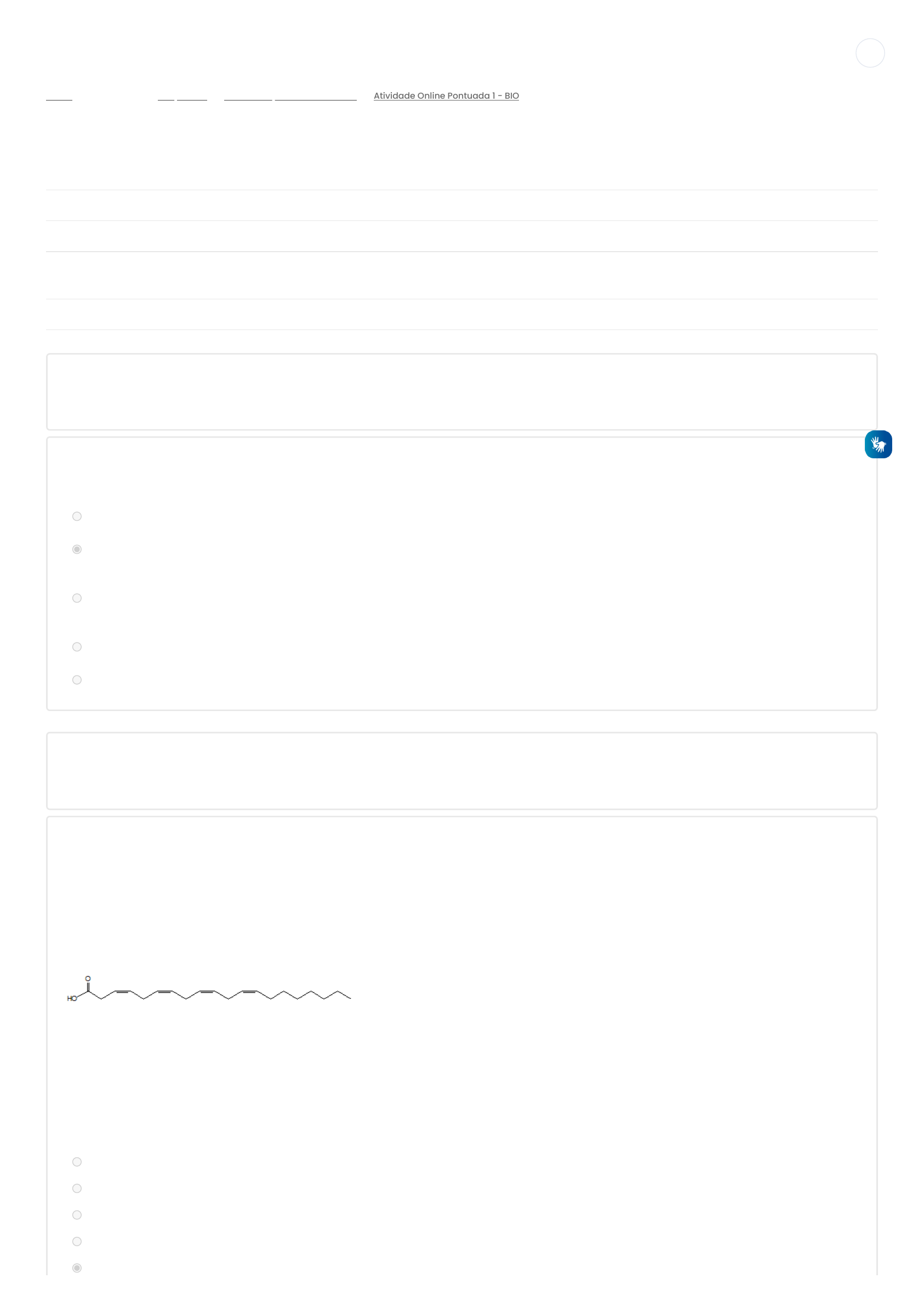 30/08/2022 11:55 Atividade Online Pontuada 1 - BIO: Revisão da tentativa https://ceadgraduacao.uvv.br/mod/quiz/review.php?attempt=11012&cmid=12406 1/3 - Meus cursos - - - Painel Bioquímica Atividades pontuadas & Notas Atividade Online Pontuada 1 - BIO Iniciado em terça, 30 ago 2022, 11:16 Estado Finalizada Concluída em terça, 30 ago 2022, 11:49 Tempo empregado 33 minutos 42 segundos Avaliar 1,00 de um máximo de 1,00(100%) Questão 1 Completo Atingiu 0,20 de 0,20 Escolha a alternativa correta sobre as proteínas. Escolha uma opção: a. Fibrinogênio é um peptídeo de defesa contra hemorragias que, após ativação, tem capacidade de coagulação do sangue. b. Actina e miosina são proteínas relacionadas ao movimento e contração muscular; quando estimuladas, promovem o encurtamento destas células, capacidade promovida pela estrutura secundária das fibras proteicas. c. Desnaturação é a alteração na estrutura tridimensional nativa das proteínas, ou seja, hidrólise das ligações fracas que são responsáveis pelas estruturas secundárias, terciárias e quaternárias. A desnaturação pode provocar perda parcial ou completa da função biológica. d. Arranjo espacial de duas ou mais cadeias polipeptídicas, formação de complexos tridimensionais, é o conceito de estrutura terciária de proteínas e. Albumina, ferritina e queratina são proteínas nutritivas e de reserva. Questão 2 Completo Atingiu 0,20 de 0,20 Os ácidos graxos são os lipídeos mais simples, possuindo longa cadeia carbônica (4 a 36 átomos de carbono) com o grupo carboxila (COOH) na extremidade. A cadeia carbônica pode ser saturada ou insaturada. A respeito destas importantes moléculas, avalie as afirmações a seguir. I. Todo ácido graxo constitui um lipídeo. II. A estrutura abaixo pertence a um ácido graxo do tipo “ômega-3”. III. A presença de insaturação (dupla ligação) e o tamanho da cadeia influenciam no estado físico do ácido graxo. IV. Apesar de serem considerados óleos e gorduras, os ácidos graxos podem reagir com bases fortes. É correto o que se afirma em Escolha uma opção: a. I e III, apenas. b. II e IV, apenas. c. II e III, apenas. d. I e II, apenas. e. III e IV, apenas. https://ceadgraduacao.uvv.br/my/ https://ceadgraduacao.uvv.br/course/view.php?id=153 https://ceadgraduacao.uvv.br/course/view.php?id=153§ion=2 https://ceadgraduacao.uvv.br/mod/quiz/view.php?id=12406 30/08/2022 11:55 Atividade Online Pontuada 1 - BIO: Revisão da tentativa https://ceadgraduacao.uvv.br/mod/quiz/review.php?attempt=11012&cmid=12406 2/3 p Questão 3 Completo Atingiu 0,20 de 0,20 As enzimas são proteínas com a capacidade de acelerar reações químicas. Essa propriedade funcional é essencial a manutenção da vida, pois sem ela, levaríamos semanas para a digestão de qualquer alimento impossibilitando, assim, a síntese de energia celular. Observe a figura abaixo e selecione a opção correta: Escolha uma opção: a. A energia E2 representa a energia de ativação necessária a realização da reação. b. O nível de energia inicial dos reagentes é diretamente proporcional a energia de ativação e inversamente proporcional a energia dos produtos. c. Trata-se de um gráfico que representa o caminho de reação enzimática, onde a Curva 2 representa a reação com a enzima e a Curva 1 sem a enzima. d. A Curva 2 representa a reação sem a presença de um catalizador (enzima), havendo a necessidade de mais energia para se atingir o estado de transição, enquanto a Curva 1 é a curva na presença de um catalizador (enzima) observado pela necessidade de menos energia de ativação para se atingir o estado de transição. e. Observa-se que o nível de energia dos produtos é maior do que dos substratos Questão 4 Completo Atingiu 0,20 de 0,20 Os ácidos graxos são ácidos carboxílicos derivados de hidrocarbonetos, embora nem todo ácido graxo constitua um lipídeo. Para isso, o ácido graxo deve apresentar quatro características importantes. Primeiramente, ser monocarboxílico, por apresentar apenas um ácido carboxílico na constituição do lipídeo; segundo, ter número par de carbonos, que varia de 4 a 36 carbonos em cadeias hidrocarbonadas longas; e finalmente, ser saturado ou insaturado. Em relação a nomenclatura dos ácidos graxos, marque a alternativa que representa a nomenclatura comum e delta correta do ácido abaixo. CH (CH )7CH=CH(CH ) COOH Escolha uma opção: a. ácido esteárico e 18:0. b. ácido plamítico e 18:2 ∆ . c. ácido linolênico e 18:1 ∆ . d. ácido oleico e 18:1 ∆ . e. ácido linoleico e 18:1 ∆ Questão 5 Completo Atingiu 0,20 de 0,20 3 2 2 7 9,12 8 9 9 30/08/2022 11:55 Atividade Online Pontuada 1 - BIO: Revisão da tentativa https://ceadgraduacao.uvv.br/mod/quiz/review.php?attempt=11012&cmid=12406 3/3 Relacione os termos a definição abaixo: 1 - Holoenzimas 2 – Sitio ativo 3 – Apoenzimas 4 – Cofatores 5 – Enzimas reguladoras ( ) Somente realizam atividade enzimática quanto estão ligadas a cofatores. ( ) Local da enzima onde ocorre o encaixe com o substrato. ( ) Geralmente são íons metálicos como Fe++, Mn++, Zn++. ( ) Enzima + cofator. ( ) São encontradas em quase todas as vias metabólicas, atuam em etapas irreversíveis e, na maioria das vezes, estão localizadas no início dessas vias. Escolha a alternativa correta: Escolha uma opção: a. 3 – 2 – 4 – 1 – 5 b. 2 – 1 – 4 – 3 – 5 c. 1 – 2 – 5 – 3 – 4 d. 1 – 2 – 4 – 3 – 5 e. 3 – 2 – 5 – 1 – 4 Terminar revisão Roteiro aulas práticas - Biome… Seguir para... Atividade Online Pontuada 2 -… https://ceadgraduacao.uvv.br/mod/quiz/view.php?id=12406 https://ceadgraduacao.uvv.br/mod/folder/view.php?id=12402&forceview=1 https://ceadgraduacao.uvv.br/mod/quiz/view.php?id=29525&forceview=1