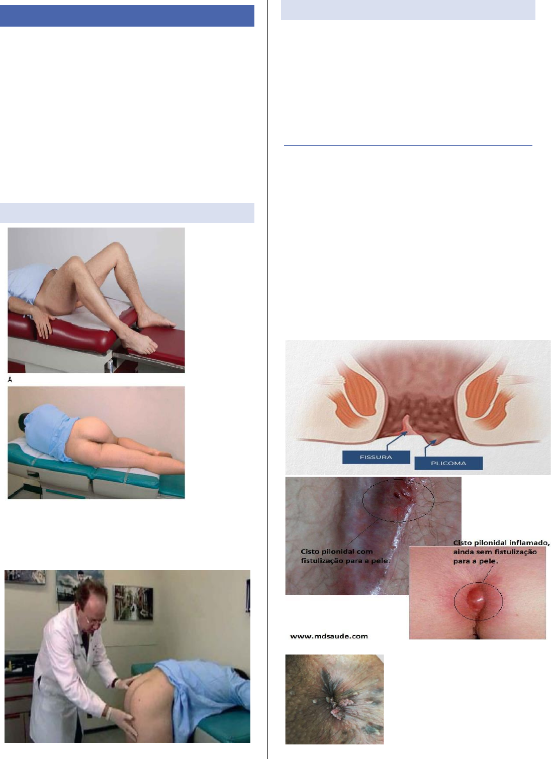 EXAME RETAL É a fase final do exame abdominal de rotina, sendo que o paciente deve ser instruído a esvaziar a bexiga e o intestino antes do exame começar. Lembrar de: 1. Cumprimentar o paciente 2. Explicar como será realizado o exame e sua importância além de explicar que o paciente poderá sentir alguns impulsos (vontade urinar ou defecar), mas que isso não ira ocorrer 3. Colocar o paciente na posição correta POSIÇÃO DO PACIENTE Litotomia modificada – para pacientes que não conseguem ficar de pé ou não se precisa fazer um exame detalhado Posição de Sims Pode-se usar ainda a posição com o paciente em pé, inclinado, com os ombros e cotovelos apoiados na mesa de exame → É mais utilizada principalmente pelos homens e permite uma melhor inspeção do ânus e palpação do reto INSPEÇÃO ANAL Com o paciente em posição adequada, o médico utilizando os polegares enluvados deverá afastar as nádegas do paciente com delicadeza. O ânus normalmente encontra-se fechado, com pregas cutâneas suaves dirigidas radialmente para o orifício anal. A pele perineal é geralmente mais pigmentada. ALTERAÇÕES MAIS COMUNS 1. Lesões elementares da pele e sinais inflamatórios 2. Anomalias congênitas 3. Plicomas anais (pregas excedentes de pele na margem anal) 4. Escoriações decorrentes do prurido anal 5. Hemorroidas 6. Fissuras 7. Condilomas e abcessos 8. Fístulas 9. Neoplasias. Na região sacrococcígea podemos encontrar os cistos dermoides. Condiloma anal Devemos ainda solicitar ao paciente que “faça força para baixo, como se estivesse fazendo coco” no sentido de exteriorizar hemorroidas internas ocultas, pólipos e prolapso de mucosa retal. TOQUE ANORRETAL Técnica: ▪ É feito com o dedo indicador da mão direita usando-se luva ou dedeira, enquanto a mão esquerda afasta as nádegas do paciente ▪ Após lubrificar o dedo adequadamente (com vaselina ou xilocaína gel), encosta-se a polpa digital sobre o orifício anal fazendo uma leve compressão no sentido de relaxar e vencer a resistência do esfíncter externo do ânus, introduzindo o dedo com leve movimento de rotação. ▪ Geralmente, consegue-se examinar até 10 centímetros além da borda anal. ▪ Deve-se avaliar o canal anal e o reto CANAL ANAL No canal anal, avalia-se: 1. Tônus do esfíncter anal (normotônico, hipotônico ou hipertônico) 2. Sensibilidade (doloroso ou indolor) 3. Elasticidade (normal, diminuída ou inelástico) 4. “Tumorações” (trombos hemorroidários, papilas hipertróficas, neoplasias benignas e malignas). O toque anorretal doloroso na hipertonia do esfíncter quase sempre indica fissura anal, processos inflamatórios e/ou lesões estenosantes do canal anal (papilites, criptites, neoplasias), além de trombose hemorroidária e abscessos. O esfíncter hipotônico ocorre nas pessoas idosas, na doença hemorroidária, na ressecção do esfíncter. RETO A ampola retal normalmente está vazia, tem paredes lisas, depressíveis, ligeiramente móveis e indolores. Além disso, o reto é constituído pelas paredes posterior, lateral e anterior. A parede anterior do reto apresenta características especiais em cada sexo: ▪ Homem: palpam-se a próstata, as vesículas seminais – quando acometidas por processo inflamatório ou neoplásico –, o fundo de saco retovesical e a válvula de Houston inferior. ▪ Mulher: palpam-se a parede retovaginal, o colo uterino, o corpo do útero, o fundo de saco de Douglas e a válvula de Houston inferior. O encontro de abaulamento do fundo de saco de Douglas, na mulher, ou do fundo retovesical, no homem, torna possível o diagnóstico precoce da ascite e, quando se apresentam dolorosos, sugerem a presença de abscesso, anexite e apendicite, bem como outros processos inflamatórios dos órgãos e estruturas pélvicas. Na bolsa de Douglas é possível encontrar ainda o sinal prateleira de Blumer → tumor com metástase geralmente do pulmão, pâncreas e estomago sendo percebida como uma estrutura endurecida na região Ao toque das faces laterais e posterior da parede retal, pode-se perceber a espinha ilíaca, cóccix e a região sacral inferior. Essas paredes são palpáveis em busca de pólipos (sésseis – aderidas por uma base – ou pedunculados). Podem-se ainda reconhecer pelo toque retal os fecalomas, frequentes no megacólon chagásico. A única maneira de examinar toda a circunferência da parede retal é virar de costas para o paciente, fazendo uma hiperpronação da mão do examinador (Avaliar a posição de 12 e 3h da porção retal) Após a retirada do dedo, ao finalizar o toque retal, convém examinar o material que costuma aderir a ele (pus, sangue ou fezes), cuja presença pode oferecer subsídio para o diagnóstico. O reto anterior apresenta uma superfície peritoneal, sendo assim, o exame do toque retal pode revelar dor caso haja inflamação peritoneal PALPAÇÃO DA GLANDULA PROSTÁTICA As características semiológicas a analisar são: ▪ Tamanho (noz e simétrica) ▪ Consistência (elástica, regular e depressível) ▪ Superfície (lisa) ▪ Contornos (precisos) ▪ Sulco mediano ▪ Mobilidade da próstata (discretamente móvel) ANUSCOPIA /COLPOSCOPIA ANAL OU CANAL ANAL Observa-se o canal anal e a parte final do reto inferior, não sendo feito de forma rotineira no clínico geral. Detecta: hemorroidas internas e categorizar o grau, laceração, fissura, pólipo no canal anal ou reto inferior além de ver inflamações, câncer nessas localidades. Geralmente, é feito a partir dos 40 anos ou pessoas com sintomas (sangramento, dor, muco) TÉCNICA Introduz o anuscopico com o mandril, depois de inserido, o mandril é retirado, sendo assim, torna-se possível observar todo o canal anal Pode colocar um anestésico para diminuir a dor do paciente