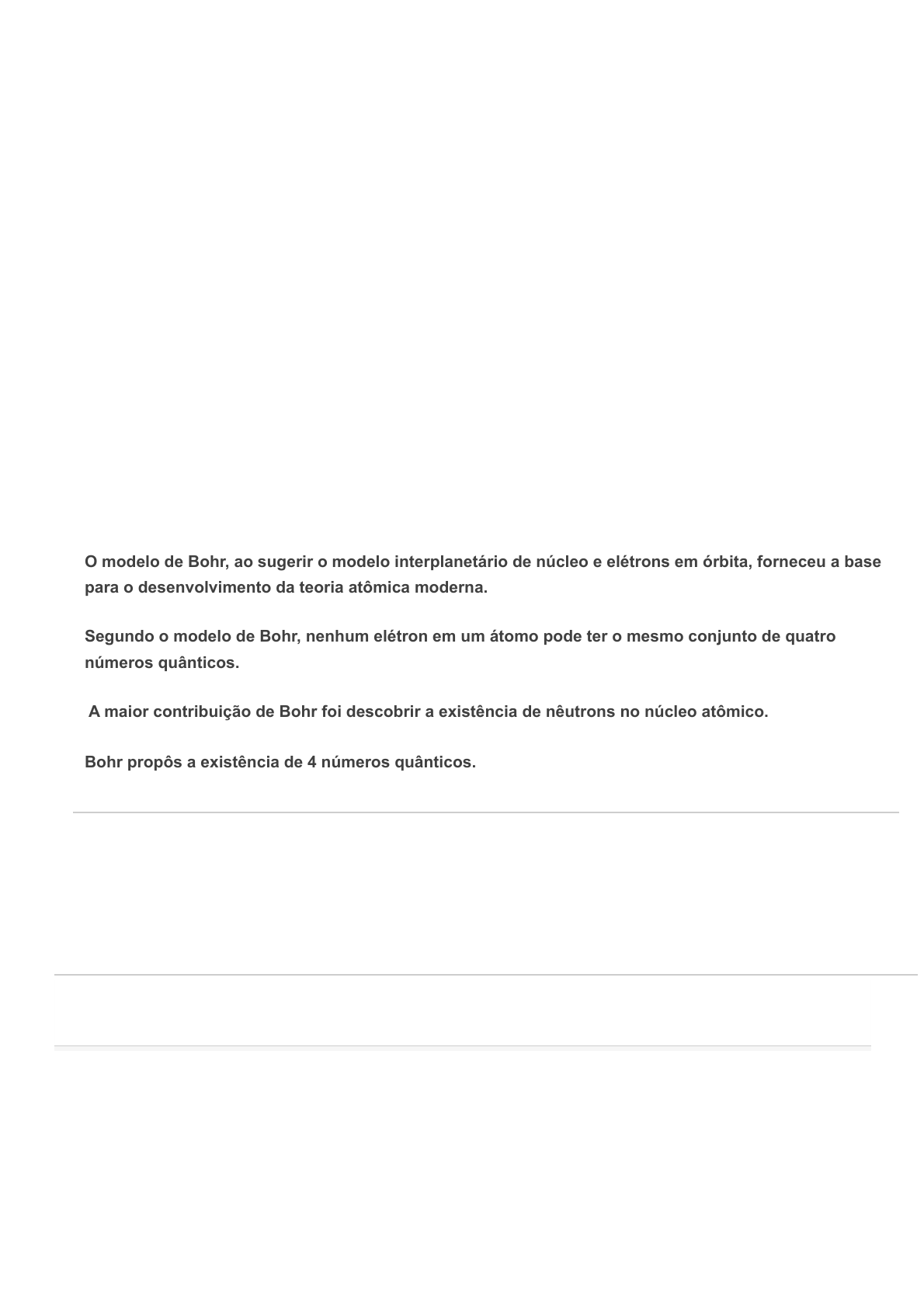 27/04/2022 13:49 Comentários https://sereduc.blackboard.com/ultra/courses/_81138_1/outline/assessment/_4669908_1/overview/attempt/_17020416_1/review/inline-feedback?… 1/8 Ocultar opções de resposta Pergunta 1 -- /0 Leia o excerto abaixo: “No ano de 2013 completa um século aquele annus mirabilis em que o físico dinamarquês Niels Bohr publicou sua teoria sobre a constituição dos átomos. Essa foi a primeira explicação da estrutura atômica a lançar mão de pressupostos quânticos, criando uma clivagem com as teorias clássicas precedentes e abrindo o caminho para o entendimento moderno do átomo. Ao publicar o primeiro de seus artigos de 1913 que subitamente o lançaram à vanguarda da ciência mundial, Bohr era um jovem de 28 anos que só havia até então publicado três artigos de seu tempo de estudante.” BRAGA, J. P.; FILGUEIRAS, C. A. L. O centenário da Teoria de Bohr. Química Nova, v. 36, n. 7, p. 1073-1077, 2013. As contribuições de Bohr possibilitaram um maior entendimento sobre a estrutura atômica. Marque a opção que descreve corretamente informações sobre o modelo atômico proposto por Bohr. Resposta corretaSegundo Bohr, os elétrons são organizados em níveis discretos de energia no átomo. O modelo de Bohr, ao sugerir o modelo interplanetário de núcleo e elétrons em órbita, forneceu a base para o desenvolvimento da teoria atômica moderna. Segundo o modelo de Bohr, nenhum elétron em um átomo pode ter o mesmo conjunto de quatro números quânticos. A maior contribuição de Bohr foi descobrir a existência de nêutrons no núcleo atômico. Bohr propôs a existência de 4 números quânticos. Pergunta 2 -- /0 Leia o excerto abaixo: “Quando um átomo com grande eletronegatividade se liga a um átomo com baixa eletronegatividade, há transferência definitiva de elétron do mais fraco para o mais forte. Se tirarmos um elétron de um átomo, ele deixa de ser neutro, pelo desequilíbrio entre seu número de prótons e de elétrons. Se aproximarmos dois átomos de forte eletronegatividade, um não terá força para capturar o elétron do outro permanentemente. Ele captura o elétron, mas o outro consegue capturá-lo de volta e, além de retomá-lo, captura um elétron do outro. Esse jogo fica se repetindo fazendo com que o par de elétrons (um de cada átomo) fique orbitando pelos dois átomos. É importante perceber que nesse caso não há formação de íons.” 27/04/2022 13:49 Comentários https://sereduc.blackboard.com/ultra/courses/_81138_1/outline/assessment/_4669908_1/overview/attempt/_17020416_1/review/inline-feedback?… 2/8 Ocultar opções de resposta RENDELUCCI, F. Ligações químicas - Metais, não-metais, ligações iônicas e ligações covalentes. Educação UOL, 02 mai. 2014. Disponível em: https://educacao.uol.com.br/disciplinas/quimica/ligacoes-quimicas-metais-nao- metais-ligacoes-ionicas-e-ligacoes-covalentes.htm. Acesso em: 27 abr. 2020. As ligações iônicas e covalentes apresentam notáveis diferenças, que resultam em materiais com propriedades claramente distintas. Marque a opção que apresenta corretamente algumas diferenças entre substâncias iônicas e substâncias moleculares. Incorreta: Compostos covalentes são formados por dois ou mais átomos, que geralmente são metais, enquanto que compostos iônicos são formados por um metal e um ametal. Fortes interações eletrostáticas entre os íons carregados são responsáveis pela ligação covalente. Resposta correta Compostos covalentes são formados por dois ou mais átomos, que geralmente são ametais, enquanto que compostos iônicos são formados por um metal e um ametal. Compostos covalentes geralmente apresentam elevado ponto de ebulição, enquanto que os compostos iônicos apresentam ponto de ebulição ligeiramente inferior. Compostos covalentes, quando dissolvidos em água, apresentam características de condutores de eletricidade, assim como compostos iônicos. Pergunta 3 -- /0 Leia o excerto abaixo: “O número quântico principal n define a distância média do elétron ao núcleo atômico e está relacionado à energia do orbital, podendo assumir qualquer valor inteiro positivo. Todos os orbitais com o mesmo valor de n estão no mesmo nível de energia. O número quântico momento angular orbital, l, também denominado de número quântico azimutal, define o momento angular do elétron e especifica o orbital. Como o n limita o l, os valores assumidos por l são inteiros e variam entre 0 e n−1. Número quântico magnético ml dá a orientação dos orbitais. O ml é um número inteiro que pode assumir 2l + 1 valores distintos, compreendidos entre +l e −l. Por exemplo, se l = 2, então os valores de ml incluem -2, -1, 1, 0, +1, +2. Em 1929, usando postulados da mecânica quântica, Dirac demonstrou que um elétron deve ter um momento angular intrínseco, s = , o qual limita o número quântico magnético de spin, ms , a dois valores, s =+ (↑) ou s =- (↓), mostrando que a proposição de Goudsmit e Uhlenbeck é totalmente compatível com a mecânica quântica.” OLIVEIRA, Ó. A.; FERNANDES, J. D. G. Arquitetura atômica e molecular. Natal: Editora da UFRN, 2006. Segundo o princípio de exclusão de Pauli, nenhum elétron em um átomo pode ter o mesmo conjunto de quatro números quânticos. Considerando as informações presentes no texto, indique o o elemento cujo elétron mais energético apresenta os seguintes números quânticos: n= 3; l =2, m=-2, s = + https://educacao.uol.com.br/disciplinas/quimica/ligacoes-quimicas-metais-nao-metais-ligacoes-ionicas-e-ligacoes-covalentes.htm. 27/04/2022 13:49 Comentários https://sereduc.blackboard.com/ultra/courses/_81138_1/outline/assessment/_4669908_1/overview/attempt/_17020416_1/review/inline-feedback?… 3/8 Ocultar opções de resposta Ocultar opções de resposta Manganês (Z=25) Resposta corretaFerro (Z= 26) Cromo (Z=24) Cobalto (Z=27) Níquel (Z=28) Pergunta 4 -- /0 Leia o excerto abaixo: “As li