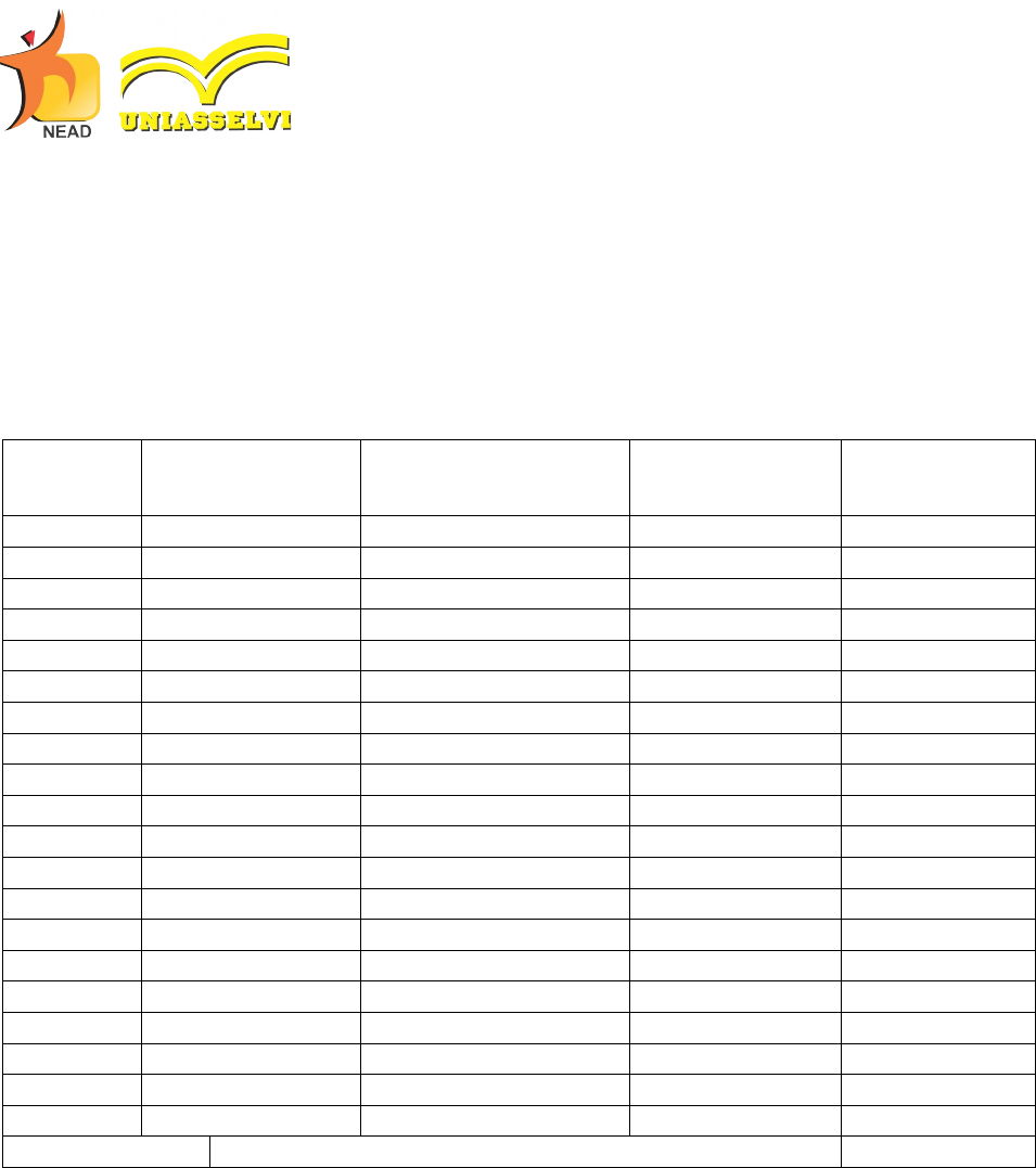 NÚCLEO DE EDUCAÇÃO A DISTÂNCIA – NEAD CENTRO UNIVERSITÁRIO LEONARDO DA VINCI – UNIASSELVI Rodovia BR 470 - Km 71 – n. 1.040 – Bairro Benedito – 89130-000 – Indaial/SC FICHA DE FREQUÊNCIA – ESTÁGIO OBRIGATÓRIO II Estagiário: _____________________________________________________________________ Campo de estágio: ___________________________________________Cidade: _____________ Supervisor de Campo:________________________________________ CRESS: _____________ Orientador Pedagógico Local: ___________________________________CRESS:____________ Data Carga horária Atividades Realizadas Visto acadêmico Visto Supervisor Total de horas Assinatura Supervisor de Campo: ______________________________ Assinatura Orientador Pedagógico: ______________________________ Assinatura Acadêmico: ______________________________ “Não basta saber, é preciso saber fazer”