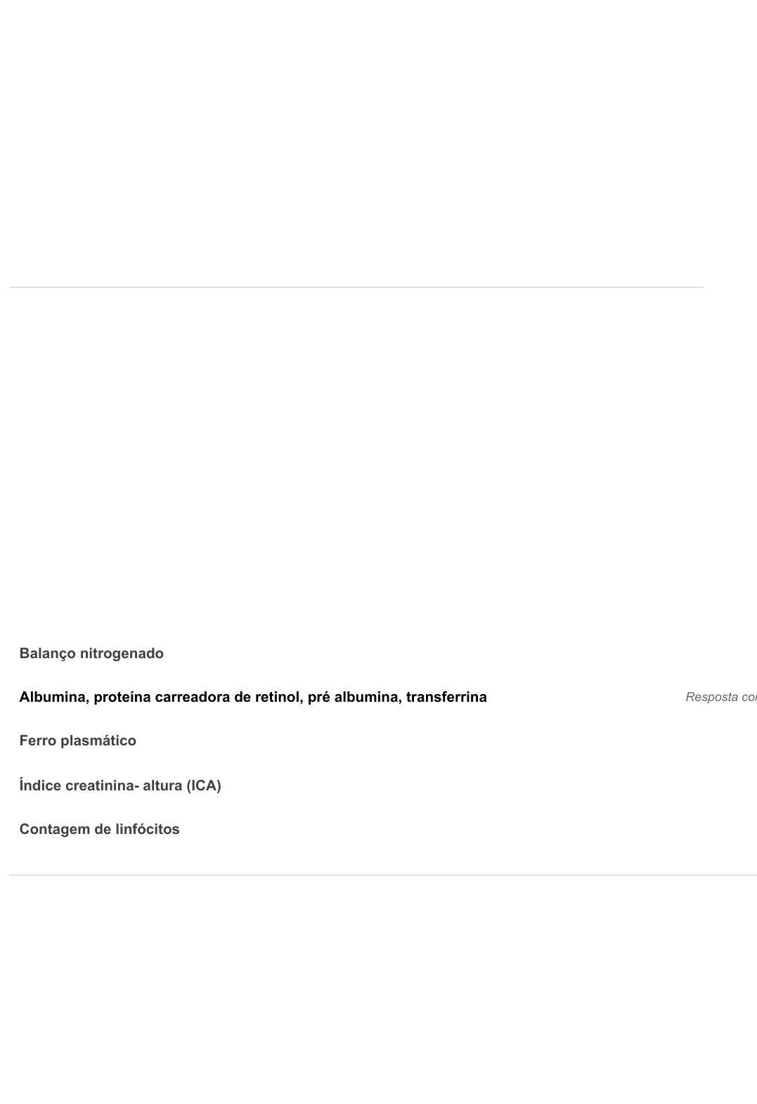 Conteúdo do exercício Ocultar opções de resposta Pergunta 1 1 / 1 É um parâmetro bioquímico que em situações de desnutrição e depleção proteica severa seus níveis encontram-se baixos, porém também estão diminuídos em infecções, inflamação, doenças hepáticas, desidratação; não sendo recomendado seu uso isolado para avaliação do estado nutricional. É dosado no sangue. A qual método de avaliação o enunciado se refere? Balanço nitrogenado Resposta corAlbumina, proteína carreadora de retinol, pré albumina, transferrina Ferro plasmático Índice creatinina- altura (ICA) Contagem de linfócitos Pergunta 2 1 / 1 É considerada perda grave de peso num período de 2 meses: admin Realce Ocultar opções de resposta Ocultar opções de resposta >10% do peso corporal >2% do peso corporal >12% do peso corporal Resposta cor>5 % do peso corporal >3% do peso corporal Pergunta 3 1 / 1 Considere a seguinte situação: paciente do sexo masculino, 62 anos, IMC 23 kg/m2, portador de hipertensão arteria não possui dentição completa por isso não tolera bem alimentos mais sólidos. Foi admitido na unidade hospitalar pa realização de cateterismo. Quais as características da dieta recomendadas a este paciente? Branda Pastosa Resposta corHipossódica branda Hipossódica Hipercalórica Pergunta 4 1 / 1 admin Realce admin Realce Ocultar opções de resposta Ocultar opções de resposta Paciente J.S, sexo masculino, 45anos, admitido com traumatismo abdominal (acidente de moto), hemodinamicamen estável, porém apresentando íleo paralítico e distensão abdominal, quadro clínico estável, peso estimado de 65kg, diagnóstico nutricional eutrófico . Estima-se tempo de repouso intestinal de 7-10 dias. Qual sua indicação de terapia nutricional? Dieta enteral hipercalórica Dieta oral liquida restrita Dieta enteral Resposta corDieta parenteral periférica Dieta parenteral central Pergunta 5 1 / 1 Dieta de transição, indicada para pré e pós-operatórios e preparo para alguns exames. Tem baixo valor nutricional: Resposta corDieta líquida restrita Dieta hipossódica Dieta pastosa Dieta livre Dieta liquida Pergunta 6 1 / 1 admin Realce admin Realce Ocultar opções de resposta Ocultar opções de resposta Sobre o questionário de frequência alimentar, assinale a alternativa correta: É considerado inadequado para estudos epidemiológicos que avaliam a relação da alimentação com doenç crônicas Neste método é possível saber os horários das refeições e se houveram dias atípicos Resposta cor É utilizado para avaliar a dieta habitual do indivíduo em um período de tempo (dia, semana, mês, ano) Não é possível ser auto aplicado Não é necessário que o indivíduo saiba ler e escrever Pergunta 7 1 / 1 A medida antropométrica utilizada para estimar o percentual de gordura subcutânea é: Resposta corDobras cutâneas Índice de massa corporal As circunferências Circunferência do quadril Exame físico Pergunta 8 1 / 1 admin Realce admin Realce Ocultar opções de resposta Ocultar opções de resposta Na gestação Alto consumo de proteínas Crianças em fase de crescimento Resposta corDesnutrição/inanição Hipertrofia muscular Pergunta 9 1 / 1 Qual das alternativas abaixo NÃO é indicação para início de terapia nutricional enteral? Lesão na cavidade oral Resposta corPrevisão de uso de 4 dias Neoplasia gastrintestinal Doença neurológica, paciente inconsciente Fístula intestinal de baixo débito (<500 ml/dia) Pergunta 10 1 / 1 A.C.S, paciente do sexo feminino, 33 anos, foi admitida em hospital com trauma crânio-encefálico, no momento apresenta-se inconsciente. Para calcular o valor energético da dieta a ser ofertada é necessário obter o peso, porém família não sabe referir e não há registro em prontuário. Foi possível realizar as seguintes medidas: admin Realce admin Realce Ocultar opções de resposta circunferência da panturrilha: 32 cm, altura do joelho: 47 cm, dobra cutânea subescapular: 3 cm. Aplicando estas medidas na fórmula para estimativa de peso, qual será o resultado? 37,45kg 48,80kgs 52,60kg 42,35 kg Resposta cor45,86 kg admin Realce