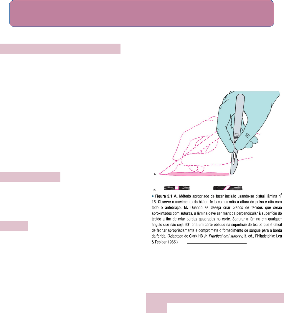 →@odonto.marihafernandes Necessidades básicas para cirurgia ·Os dois requisitos principais são: (1) visibilidade adequada; (2) assessoramento. Uma visibilidade adequada depende dos três fatores a seguir: (1) acesso adequado; (2) iluminação adequada; (3) campo cirúrgico livre de excesso de sangue e outros fluidos e debris. Técnica asséptica ·Para minimizar a contaminação da ferida por micróbios patogênicos. Incisões · Ao se realizarem incisões nos tecidos, convém relembrar alguns princípios básicos que são: L→ âmina afiada de tamanho e forma adequados. A→ incisão deve ser firme e contínua. P→ reservação de estruturas importantes, evitando incisá-las por acidente. I→ ncisões em superfícies epiteliais, as quais o cirurgião planeja reaproximar, devem ser feitas com a lâmina em posição perpendicular. ∟→Tal ângulo produz bordas quadradas no corte, mais fáceis de reorientar apropriadamente durante a sutura, e menos suscetíveis à necrose nas bordas da incisão como resultado da isquemia →O quinto princípio é que as incisões na cavidade bucal devem ser bem posicionadas. Meios para promover hemostasia da ferida Obtém-se hemostasia da ferida por quatro meios: 1- O primeiro é auxiliando mecanismos hemostáticos naturais. Isso costuma ser realizado utilizando-se uma esponja de gaze para pressionar os vasos que estão sangrando ou colocando um hemostático em um vaso. by James R. Hupp, Edward Ellis III e Myron R. Tucker.Cirurgia Oral e Maxilofacial Contemporânea: Princípios da Cirurgia. 7ª Ed.Local de publicação: - Rio de Janeiro : GEN | Grupo Editorial Nacional S.A. Publicado pelo selo Editora Guanabara Koogan Ltda., 2021. Princípios da Cirurgia →@odonto.marihafernandes Ambos os métodos causam estagnação do sangue nos vasos, o que promove coagulação. ∟→Em geral, apenas alguns vasos pequenos requerem pressão por 20 ou 30 segundos, enquanto vasos maiores requerem de 5 a 10 minutos de pressão contínua. 2-Um segundo meio de obter hemostasia é pelo uso do calor para fundir a ponta dos vasos cortados (coagulação térmica/eletrocoagulação). ∟→ O calor costuma ser aplicado por meio de uma corrente elétrica que o cirurgião- dentista concentra no vaso em sangramento, segurando o vaso com um instrumento de metal, como uma pinça hemostática, ou tocando o vaso diretamente com a ponta do bisturi elétrico. ∟→Três condições devem ser criadas para o uso apropriado da coagulação térmica: (1) o indivíduo deve estar aterrado para que a corrente entre em seu corpo; (2) a ponta do cautério e qualquer instrumento de metal que a ponta do cautério tocar não podem tocar o paciente em nenhum ponto que não seja o local do sangramento do vaso (caso contrário, a corrente pode seguir um caminho indesejado e ocasionar uma queimadura); (3) o terceiro procedimento para a coagulação térmica é a remoção de qualquer sangue ou fluido que se tenha acumulado em torno do vaso a ser cauterizado. O fluido funciona como um reservatório de energia e, assim, evita que uma quantidade suficiente de calor atinja o vaso para a cauterização. 3-O terceiro meio de promover a hemostasia cirúrgica é pela ligadura por sutura. ∟→ Se um vaso de tamanho considerável for cortado, segura-se cada ponta com uma pinça hemostática. O cirurgião- dentista, então, amarra suturas não absorvíveis ao redor do vaso. →Se este puder ser dissecado livre do tecido conjuntivo ao redor, antes que seja cortado, duas pinças hemostáticas podem ser colocadas no vaso com espaço suficiente entre elas para dividi-lo. →Uma vez que o vaso esteja cortado, suturas são amarradas em volta de cada ponta e as pinças hemostáticas são removidas. 4-A quarta maneira de promover hemostasia é colocar substâncias vasoconstritoras na ferida, como a epinefrina, ou aplicar pró-coagulantes, como trombina ou colágeno. by James R. Hupp, Edward Ellis III e Myron R. Tucker.Cirurgia Oral e Maxilofacial Contemporânea: Princípios da Cirurgia. 7ª Ed.Local de publicação: - Rio de Janeiro : GEN | Grupo Editorial Nacional S.A. Publicado pelo selo Editora Guanabara Koogan Ltda., 2021. Princípios da Cirurgia →@odonto.marihafernandes →A epinefrina funciona como um vasoconstritor mais efetivamente quando colocada no local em que se deseja a vasoconstrição por, pelo menos, 7 minutos antes de a cirurgia começar. → A epinefrina é ineficaz na promoção de hemostasia local se for administrada depois de iniciado o sangramento. Manejo do espaço morto Espaço morto em uma ferida é qualquer área que permaneça desprovida de tecido após o fechamento da ferida. Pode ser gerado pela remoção de tecido na profundidade de uma ferida e pela não reaproximação de todos os planos teciduais durante o fechamento. →O espaço morto em uma ferida costuma ser preenchido com sangue, o que cria um hematoma com grande potencial para infecção. →O espaço morto pode ser eliminado de quatro maneiras: (1) A primeira é suturar por meio de planos teciduais para minimizar o vazio pós-operatório. (2) A segunda é colocar um curativo compressivo sobre a ferida suturada. (3) O terceiro modo de eliminar espaço morto é colocar uma compressa no espaço até que o sangramento pare e, então, remover a compressa. ∟→Essa técnica costuma ser usada quando o cirurgião não pode suturar o tecido ou colocar curativos compressivos. →O material de compressa deve estar impregnado com medicação antibacteriana para diminuir a chance de infecção. (4) A quarta maneira de evitar espaço morto é usar drenos, isoladamente ou com curativos compressivos. Descontaminação e desbridamento ·Uma vez que o risco de infecção aumenta com a quantidade de microrganismos inoculados, um meio de diminuir a chance de infecção da ferida é reduzir o número de bactérias. Isso pode ser feito facilmente ao irrigar a ferida repetidas vezes durante a cirurgia e o fechamento. →A irrigação, sob