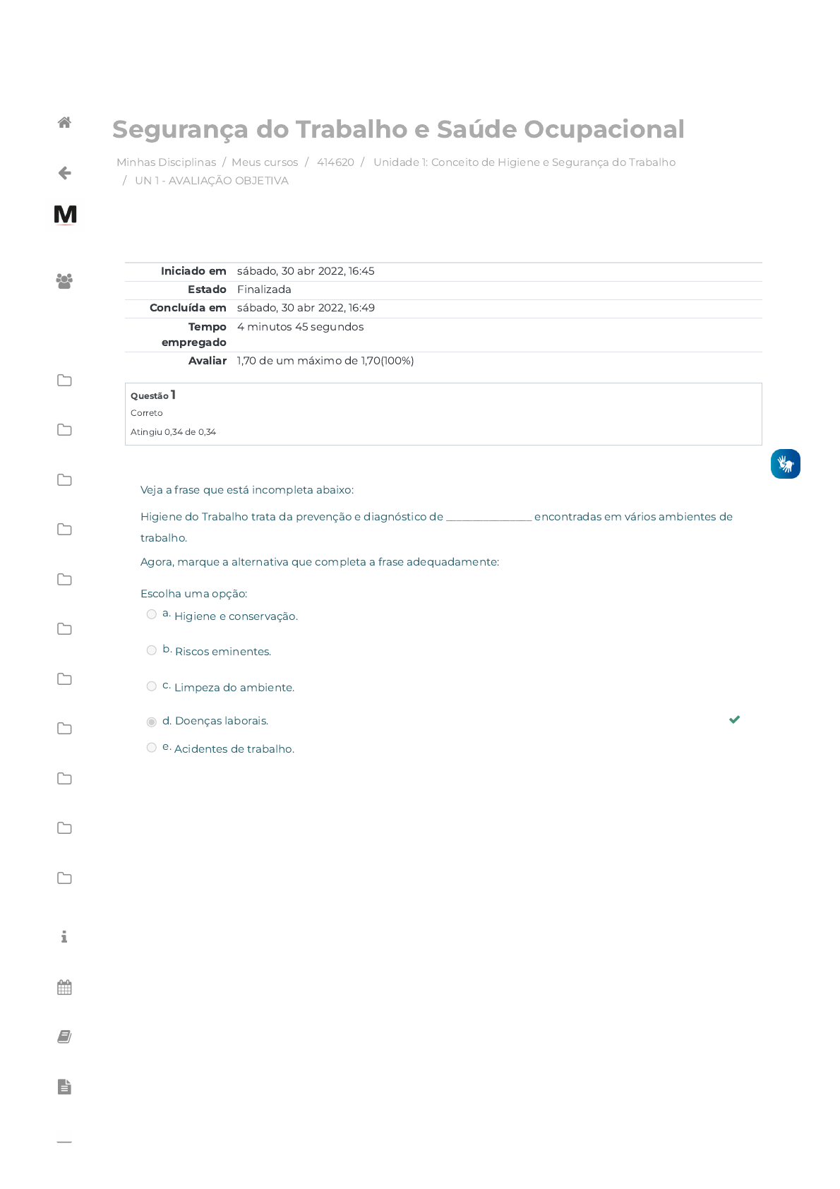 30/04/2022 16:56 UN 1 - AVALIAÇÃO OBJETIVA: Revisão da tentativa https://avap.multivix.edu.br/mod/quiz/review.php?attempt=1137936&cmid=1030343 1/4 Minhas Disciplinas / Meus cursos / 414620 / Unidade 1: Conceito de Higiene e Segurança do Trabalho / UN 1 - AVALIAÇÃO OBJETIVA Segurança do Trabalho e Saúde Ocupacional Iniciado em sábado, 30 abr 2022, 16:45 Estado Finalizada Concluída em sábado, 30 abr 2022, 16:49 Tempo empregado 4 minutos 45 segundos Avaliar 1,70 de um máximo de 1,70(100%) Questão 1 Correto Atingiu 0,34 de 0,34 Veja a frase que está incompleta abaixo: Higiene do Trabalho trata da prevenção e diagnóstico de ________________ encontradas em vários ambientes de trabalho. Agora, marque a alternativa que completa a frase adequadamente: Escolha uma opção: a. Higiene e conservação. b. Riscos eminentes. c. Limpeza do ambiente. d. Doenças laborais. e. Acidentes de trabalho. https://avap.multivix.edu.br/my/ https://avap.multivix.edu.br/course/view.php?id=13932 https://avap.multivix.edu.br/course/view.php?id=13932§ion=2 https://avap.multivix.edu.br/mod/quiz/view.php?id=1030343 https://avap.multivix.edu.br/my/ https://avap.multivix.edu.br/course/view.php?id=13932 https://avap.multivix.edu.br/user/index.php?id=13932 https://avap.multivix.edu.br/course/view.php?id=13932§ion=1 https://avap.multivix.edu.br/course/view.php?id=13932§ion=2 https://avap.multivix.edu.br/course/view.php?id=13932§ion=3 https://avap.multivix.edu.br/course/view.php?id=13932§ion=4 https://avap.multivix.edu.br/course/view.php?id=13932§ion=5 https://avap.multivix.edu.br/course/view.php?id=13932§ion=6 https://avap.multivix.edu.br/course/view.php?id=13932§ion=7 https://avap.multivix.edu.br/course/view.php?id=13932§ion=8 https://avap.multivix.edu.br/course/view.php?id=13932§ion=9 https://avap.multivix.edu.br/course/view.php?id=13932§ion=10 https://avap.multivix.edu.br/course/view.php?id=13932§ion=11 https://avap.multivix.edu.br/mod/page/view.php?id=1252%2F%22%20target%3D%22_blank https://avap.multivix.edu.br/calendar/view.php/ https://avap.multivix.edu.br/local/staticpage/view.php?page=biblioteca https://portalweb.multivix.edu.br/gabaritos/login.aspx https://multivix.edu.br/office-365/ https://avap.multivix.edu.br/ 30/04/2022 16:56 UN 1 - AVALIAÇÃO OBJETIVA: Revisão da tentativa https://avap.multivix.edu.br/mod/quiz/review.php?attempt=1137936&cmid=1030343 2/4 Questão 2 Correto Atingiu 0,34 de 0,34 Questão 3 Correto Atingiu 0,34 de 0,34 A Higiene do trabalho é a ciência que atua no campo da saúde ocupacional. A segurança do trabalho opera e interfere nas condições ambientais laborais baseadas nas Normas Regulamentadoras. A partir deste conhecimento construído, pode-se dizer que: Escolha uma opção: a. Conceitos indivisíveis e não são tratados como dois aspectos de um problema. b. Conceitos indivisíveis e são tratados como dois aspectos de um problema. c. Conceitos divisíveis e não são tratados como dois aspectos de um problema. d. Conceitos divisiveis e são tratados como um aspecto de um problema. e. Conceitos divisíveis e são tratados como dois aspectos de um problema. Veja a frase que está incompleta abaixo: As atividades ou operações que expõem os trabalhadores à níveis de ruído, contínuo ou intermitente, superiores aos limites determinados pelos órgãos competentes e sem proteção adequada, oferecerão risco _____________ grave e iminente. Agora, marque a alternativa que completa a frase adequadamente: Escolha uma opção: a. Mecânicos. b. Ergonômicos. c. Químicos. d. Físicos. e. Acidentes. https://avap.multivix.edu.br/my/ https://avap.multivix.edu.br/course/view.php?id=13932 https://avap.multivix.edu.br/user/index.php?id=13932 https://avap.multivix.edu.br/course/view.php?id=13932§ion=1 https://avap.multivix.edu.br/course/view.php?id=13932§ion=2 https://avap.multivix.edu.br/course/view.php?id=13932§ion=3 https://avap.multivix.edu.br/course/view.php?id=13932§ion=4 https://avap.multivix.edu.br/course/view.php?id=13932§ion=5 https://avap.multivix.edu.br/course/view.php?id=13932§ion=6 https://avap.multivix.edu.br/course/view.php?id=13932§ion=7 https://avap.multivix.edu.br/course/view.php?id=13932§ion=8 https://avap.multivix.edu.br/course/view.php?id=13932§ion=9 https://avap.multivix.edu.br/course/view.php?id=13932§ion=10 https://avap.multivix.edu.br/course/view.php?id=13932§ion=11 https://avap.multivix.edu.br/mod/page/view.php?id=1252%2F%22%20target%3D%22_blank https://avap.multivix.edu.br/calendar/view.php/ https://avap.multivix.edu.br/local/staticpage/view.php?page=biblioteca https://portalweb.multivix.edu.br/gabaritos/login.aspx https://multivix.edu.br/office-365/ https://avap.multivix.edu.br/ 30/04/2022 16:56 UN 1 - AVALIAÇÃO OBJETIVA: Revisão da tentativa https://avap.multivix.edu.br/mod/quiz/review.php?attempt=1137936&cmid=1030343 3/4 Questão 4 Correto Atingiu 0,34 de 0,34 Questão 5 Correto Atingiu 0,34 de 0,34 A Saúde e Segurança Ocupacional têm suas atribuições com os trabalhadores de forma geral no bem-estar e devem visar: I - Promover e realizar manutenção do mais alto grau de bem-estar físico, mental e social dos trabalhadores em todas as ocupações. II – Prevenir os trabalhadores dos efeitos adversos à saúde causados por suas condições de trabalho. III – Proteger os trabalhadores contra os riscos resultantes de fatores adversos à saúde. IV – Realizar manutenção corretiva das máquinas e nos trabalhadores em determinadas situações. Completam corretamente o enunciado acima apenas os itens: Escolha uma opção: a. I, II e III. b. I e III. c. I, III e IV. d. III e IV. e. II e III. Devido a evolução da tecnologia de informação, da globalização e o acirramento da competitividade, novos processos produtivos foram inseridos nos ambientes de trabalho, assim como novos materiais e equipamentos. A partir destas informações, marque a alternativa correta que apresenta a consequência desta crescente expos