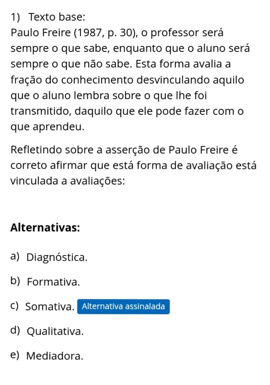 1) Texto base: Paulo Freire (1987, p. 30), o professor será sempre o que sabe, enquanto que o aluno será sempre o que não sabe. Esta forma avalia a fração do conhecimento desvinculando aquilo que o aluno lembra sobre o que Ihe foi transmitido, daquilo que ele pode fazer com o que aprendeu. Refletindo sobre a asserção de Paulo Freire é correto afirmar que está forma de avaliação está vinculada a avaliações: Alternativas: a) Diagnóstica. b) Formativa. c) Somativa. Alternativa assinalada d) Qualitativa. e) Mediadora. LTË 2) Texto base: A avaliação formativa tem como principal função ser um momento de aprendizagem, dentro do processo de construção do conhecimento, porque ela se preocupa com a apropriação dos saberes, por parte dos alunos, desta forma, sua principal função é ser um elemento chave de formação. Já a avaliação somativa é aquela focada no resultado da aprendizagem, via de regra ocorre ao final dos ciclos, materializada em provas mensais, bimestrais, semestrais ou outras com estas características. Seu aspecto mais relevante é auferir aspectos quantitativos, como a nota e/ou conceito. Analise as proposições anterior e assinale a alternativa correta sobre as avaliações apresentadas. Alternativas: A avaliação formativa tem a) como foco a Alternativa assinalada aprendizagem. A avaliação somativa tem como foco b) principal determinar dados qualitativos sobre a aprendizagem. A avaliação formativa tem como foco c) principal determinar dados quantitativos sobre a aprendizagem. A avaliação somativa busca avaliar o d) processo de construção do conhecimento por parte do aluno. 3) Texto base: As avaliações externas e em larga escala permitem, por intermédio de seus dados, fomentar políticas públicas na área da educação. Assim, é correto afirmar que as avaliações externas também exercem como função: Alternativas: Certificação, Seleç�o em a) universidades e Prestação Alternativa assinalada de Contas. Al Certificação, Seleção em universidades públicas e Prestação de Contas. ) e Certificação, Seleção em universidades privadas e Prestaç�o de Contas. Certificação, Seleç�o em universidades d) públicas e Prestação de Contas junto ao Poder Público. Certificação, Seleç�o em universidades e) privadas e Prestação de Contas junto ao Banco Mundial. 4) Texto base: A Lei de Diretrizes e Bases (Lei 9.394/96)- LDB- é a lei orgânica e geral da educação brasileira. Sua função consiste em normatizara educação, por intermédio de determinar as diretrizes e as bases da organização do sistema educacional. Assim, sobre a avaliação, a LDB explicita em seu artigo 24, inciso V, como deve ocorrer o processo avaliativo, bem como o que deve ser privilegiado em termos de seus resultados. Logo, é correto afirmar que a avaliação deve ser: Alternativas: Contínua e cumulativa, privilegiando aspectos qualitativos sobre os a) quantitativos e com foco nos resultados ao longo do período sobre eventuals Alternativa assinalada avaliações finais. Pontual e cumulativa, privilegiando aspectos 6) qualitativos sobre os quantitativos e com foco nos resultados ao longo do periodo sobre eventuais avaliações finais. Contínua e cumulativa, privilegiando aspectos quantitativos sobre os qualitativos e com foco nos resultados ao longo do período sobre eventuais avaliações finais. Continuae cumulativa, privilegiando aspectos qualitativos sobre os quantitativos d) LTE . T2.I 5) Texto base: Meu otimismo, contudo, não promete que a Internet resolverá, em um passe de mágica, todos os problemas culturais e sociais do planeta. Consiste apenas em reconhecer dois fatos. Em primeiro lugar, que o crescimento do ciberespaço resulta de um movimento internacional de jovens ávidos para experimentar, coletivamente, formas de comunicação diferentes daquelas que as midias clássicas nos propõem. Em segundo lugar, que estamos vivendo a abertura de um novo espaço de comunicação, e cabe apenas a nós explorar as potencialidades mais positivas deste espaço nos planos econômico, politico, cultural e humano. (LEVY, 1999, p. 11) A partir da afirmação de Lévy sobre o ciberespaço, é correto afirmar que a educação e a avaliação mediadas por novas tecnologias estão transformando os contextos de produção do conhecimento nos ambientes escolares. Assim, assinale a alternativa que corresponde a ferramentas relacionadas as novas tecnologias que podem ser utilizadas para a produção e avaliação da aprendizagem: Alternativas: a) Provas escritas. b) Portfólio. c) M-learning. Alternativa assinalada d) Flipped Class Room.