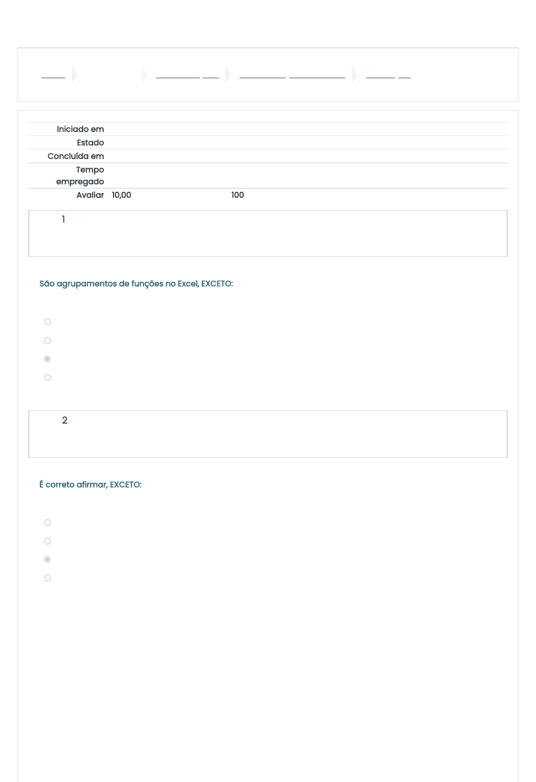 Painel Meus cursos Excel Avançado PROGRAMAÇÃO DO CURSO AVALIAÇÃO Iniciado em domingo, 4 set 2022, 14:31 Estado Finalizada Concluída em domingo, 4 set 2022, 14:45 Tempo empregado 14 minutos Avaliar 10,00 de um máximo de 10,00(100%) Questão 1 Correto Atingiu 1,00 de 1,00 Questão 2 Correto Atingiu 1,00 de 1,00 São agrupamentos de funções no Excel, EXCETO: Escolha uma: a. Matemática, Trigonométricas e Estatística. b. Matemática, Estatística e Lógicas. c. Data e Hora, Matemática e Textos. d. Lógicas, Financeiras e Trigonometria. É correto afirmar, EXCETO: Escolha uma: a. É possível alterar o tipo de gráfico após o gráfico ter sido criado. b. Os gráficos podem ser incluídos automaticamente na planilha após criados. c. É possível alterar somente a formatação após o gráfico ter sido criado. d. O Excel oferece vários tipos de gráficos. https://ead.tecpop.mg.gov.br/my/ https://ead.tecpop.mg.gov.br/course/view.php?id=38 https://ead.tecpop.mg.gov.br/course/view.php?id=38#section-1 https://ead.tecpop.mg.gov.br/mod/quiz/view.php?id=314 Questão 3 Correto Atingiu 1,00 de 1,00 Questão 4 Correto Atingiu 1,00 de 1,00 Questão 5 Correto Atingiu 1,00 de 1,00 A função MÁXIMO: Escolha uma: a. Retorna o maior valor de uma série. b. Todas as afirmativas estão incorretas. c. Retorna o menor valor de uma série. d. Mostra o resultado. São características das funções no Excel, EXCETO: Escolha uma: a. Elas são utilizadas para facilitar a montagem de fórmulas. b. Quando utilizadas no início da fórmula, apresentam variações no resultado. c. Existem funções para tratamento de data e hora, cálculos matemáticos, financeiros, estatísticos, textos e lógicas, dentre outras. d. Estas fórmulas envolvem cálculos mais complexos e com vários valores. As opções abaixo possibilitam incluir uma imagem que está disponível na biblioteca interna do Excel à planilha, EXCETO: Escolha uma: a. SmartArt. b. Clip-Art. c. Formas d. Instantâneo. Questão 6 Correto Atingiu 1,00 de 1,00 Questão 7 Correto Atingiu 1,00 de 1,00 Questão 8 Correto Atingiu 1,00 de 1,00 Leia a afirmação a seguir e marque a alternativa CORRETA: Os gráficos de ______ enfatizam a magnitude da mudança no decorrer do tempo e podem ser usados para chamar atenção para o valor total ao longo de uma tendência. Escolha uma: a. Linhas. b. Área. c. Barras. d. Coluna. Sua resposta está correta. As Afirmativas abaixo estão corretas, EXCETO: Escolha uma: a. Alguns resultados são melhor visualizados através de gráficos. b. Caso precise alterar o conteúdo de uma célula sem precisar redigitar tudo novamente, clique sobre ela e pressione F2. c. Todas as alternativas estão corretas. d. Sempre que uma célula tiver uma fórmula, a mesma aparecerá no alto da planilha, na barra de fórmulas. É correto afirmar: Escolha uma: a. Para inserir o clip-art clique no botão inserir. b. Para salvar arquivo, clique no botão layout da página. c. Para inserir imagem – clique na guia formatar d. O Excel não permite inserir ou copiar imagens e clip-arts Questão 9 Correto Atingiu 1,00 de 1,00 Questão 10 Correto Atingiu 1,00 de 1,00 É preciso proteger uma planilha? Marque a alternativa que responde corretamente essa pergunta. Escolha uma: a. É obrigatório que isso seja feito, já que o programa oferece essa opção. b. Nenhuma das alternativas anteriores. c. É aconselhável, pois é uma forma de impedir que, por acidente ou deliberadamente, alguém altere, mova ou exclua dados importantes de sua planilha. d. Não é necessário, porque os dados não podem ser alterados. É correto afirmar, EXCETO: Escolha uma: a. Caso seja necessário manter compatibilidade com as versões anteriores, é preciso alterar o tipo para Pasta de Trabalho do Excel 97 – 2003. b. Caso precise alterar o conteúdo de uma célula sem precisar redigitar, clique sobre ela e pressione F5. c. Para selecionar uma célula ou torná-la ativa, basta movimentar o retângulo cursor de seleção para a posição desejada. d. Clicamos com o botão direito do mouse em uma planilha existente e clicamos sobre a opção Selecionar Todas as Planilhas para manipular as demais. ATIVIDADE ANTERIOR ◄ CONTEÚDO PROGRAMÁTICO Seguir para... PRÓXIMA ATIVIDADE COMO EMITIR SEU CERTIFICADO? ► https://ead.tecpop.mg.gov.br/mod/page/view.php?id=333&forceview=1 https://ead.tecpop.mg.gov.br/mod/page/view.php?id=316&forceview=1
