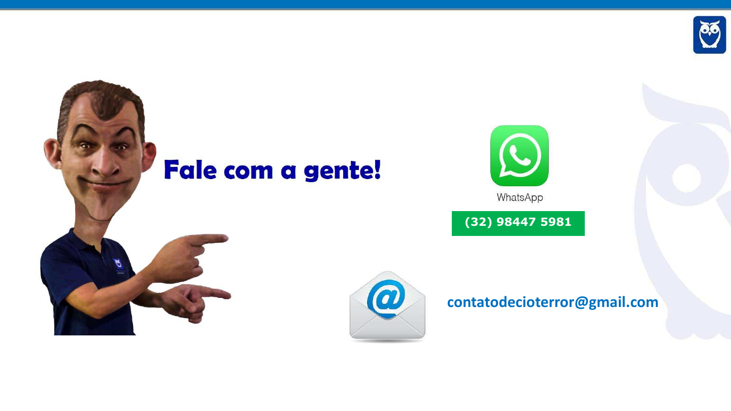 (32) 98447 5981 contatodecioterror@gmail.com 10553245937 - Mateus Maximiano @decioterror Décio Terror Décio Terror @profdecioterror www.professordecioterror.com.br 10553245937 - Mateus Maximiano Prof. Décio Terror João ama Ana. João gosta de Maria. João enviou cartas a Gumercinda. João sente saudades de Genoveva. João morreu. João era feliz. 10553245937 - Mateus Maximiano Termos essenciais: Sujeito e predicado (incluindo predicativo). Prof. Décio Terror 10553245937 - Mateus Maximiano Termos integrantes da oração: Objeto direto Objeto indireto Complemento nominal Agente da passiva. Prof. Décio Terror 10553245937 - Mateus Maximiano I - Objeto direto pleonástico: Normalmente, por uma questão de ênfase, antecipa-se o objeto, colocando-o no início da frase, e depois é repetido por meio de um pronome oblíquo átono. - O que você acha desta roupa? - Essa roupa, ninguém a quer. II - Objeto direto preposicionado: aquele cuja preposição não é exigência do verbo, que é transitivo direto, mas ocorre por ênfase, para se evitar ambiguidade ou por necessidade do próprio complemento. Amo a Deus. (ênfase) Cumpri com a minha palavra. (ênfase) Ele puxou da espada. (ênfase) Aos mais desfavorecidos atingem essas medidas. (para evitar ambiguidade) Ninguém entende a mim. ふミWIWゲゲキS;SW Sラ ヮヴラミラマW さmimざぶ Prof. Décio Terror 10553245937 - Mateus Maximiano III - Objeto direto interno (ou cognato): Quando normalmente o complemento tem o radical do verbo: Ele vive uma vida feliz. Dormi o sono dos justos. さOゲ sonhos mais lindos sonheiくくくくざ さE rir o meu risoくくくざ IV に Oゲ ヮヴラミラマWゲ ラHノケケ┌ラゲ =デラミラゲ さマWざが さデWざが さゲWざが さラざが さ;ざが さラゲざが さ;ゲざが さミラゲざが さ┗ラゲざ I┌マヮヴWマ a função sintática de objeto direto: Comprei um carro (comprei-o.). Prof. Décio Terror 10553245937 - Mateus Maximiano Termos integrantes da oração: Objeto direto Objeto indireto Complemento nominal Agente da passiva. Prof. Décio Terror 10553245937 - Mateus Maximiano Objeto indireto: complemento de um verbo transitivo indireto. Necessitamos de apoio. Pode ser pleonástico: Ao amigo, não lhe peça tal coisa. Os ヮヴラミラマWゲ ラHノケケ┌ラゲ =デラミラゲ さマWざが さデWざが さゲWざが さノエWざが さノエWゲざが さミラゲざが さ┗ラゲざ I┌マヮヴWマ ; a┌ミN?ラ sintática de objeto indireto: Obedeço ao chefe (Obedeço-lhe). Prof. Décio Terror 10553245937 - Mateus Maximiano Termos integrantes da oração: Objeto direto Objeto indireto Complemento nominal Agente da passiva. Prof. Décio Terror 10553245937 - Mateus Maximiano 1) complemento nominal de um substantivo: Você fez uma boa leitura do texto. Compare: Júlia aproveitou o momento. (objeto direto) Júlia tirou proveito do momento. (complemento nominal) 2) complemento nominal de um adjetivo: Você precisa ser fiel aos seus ideais. 3) Complemento nominal de advérbio: Você mora perto de Maria. Prof. Décio Terror 10553245937 - Mateus Maximiano Termos integrantes da oração: Objeto direto Objeto indireto Complemento nominal Agente da passiva. Prof. Décio Terror 10553245937 - Mateus Maximiano Voz ativa: A empresa exporta medicamentos. Voz passiva analítica: Medicamentos são exportados pela empresa. Prof. Décio Terror 10553245937 - Mateus Maximiano Questão 1: TRF - 2ª REGIÃO 2017 Analista Judiciário (banca Consulplan) さNessa guerra ou guerrilha usamos muitas armas...ざ (3º§) A forma verbal que apresenta a mesma transitividade da sublinhada na frase anterior está destacada em: a) さO preconceito nasce do medo, sua raiz cultural, psíquica, antropológicaぐざ (1º§) b) さAlgumas doenças precisam de remédios fortes: preconceito é uma delas.ざ (5º§) c) さNo país da impunidade, necessitamos de punição imediata, severa e radical.ざ (5º§) d) さ... palavras como けテ┌SW┌が turco, ;ノWマ?ラげ carregam, mais do que ignorância, um odioso preconceito.ざ (3º§) Prof. Décio Terror 10553245937 - Mateus Maximiano Questão 2: TRF - 2ª REGIÃO 2017 Técnico Judiciário (banca Consulplan) Analise os trechos a seguir. I. さ[...] adequarem-se às necessidades e vontades humanas.ざ (1º§) II. さContudo, o homem não mediu as possíveis consequências [...]ざ (1º§) III. さDesse modo, a preocupação com o meio ambiente é questionada, [...]ざ (2º§) IV. さ[...] por meio das novas mídias, as quais representam novos meios de comunicação, [...]ざ (2º§) Os verbos que, no contexto, exigem o mesmo tipo de complemento verbal, foram empregados em apenas a) I e II. b) I, III e IV. c) II e IV. d) II, III e IV. Prof. Décio Terror 10553245937 - Mateus Maximiano Questão 3: TJ SP 2017 Psicólogo (banca VUNESP) Evanildo Bechara, em sua Moderna Gramática Portuguesa, ensina que さラゲ verbos que apresentam significado lexical referente a realidades bem concretas não necessitam de outros signos léxicos. A tradição gramatical chama intransitivos a tais ┗WヴHラゲざ. O exposto pelo autor está corretamente exemplificado pelo verbo destacado em: (A) ... que lhe faltava dantes. (B) Ficou boa, mas desfigurada... (C) Fadinha [...] teve a existência por um fio. (D) Ainda vivem. (E) Só havia um obstáculo à minha felicidade... Prof. Décio Terror 10553245937 - Mateus Maximiano Questão 4: Prefeitura de Amontada-CE 2016 Ag Adm (banca UECE CEV) Assinale a opção que corresponde à frase em que há predicado nominal. a) さUマ Hキノエ?ラ W マWキラ SW エ;Hキデ;ミデWゲ SW IWミデヴラゲ ┌ヴH;ミラゲ Sラ マ┌ミSラ SWヮWミSWマ デラデ;ノマWミデW SWノ;ゲくくくざ b) さPラヴ WゲゲW IWミ=ヴキラが Wゲデ?ラ IヴWゲIWミSラ Wマ キマヮラヴデ>ミIキ; ラゲ ;ケ┌ケaWヴラゲくざ c) さO ;ケ┌ケaWヴラ G┌;ヴ;ミキ Y ラ ヮヴキミIキヮ;ノ 