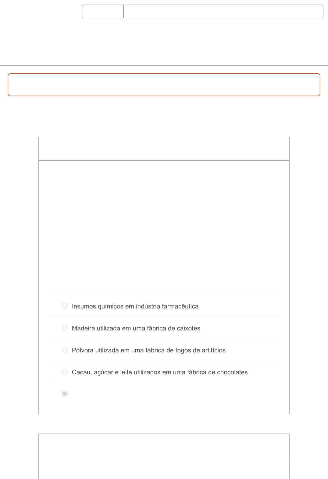 Seu Progresso: 17 % Prova Eletrônica Resultados para THIAGO MARTINS BRITO As respostas serão mostradas após a última tentativa Pontuação desta tentativa: 30 de 30 Enviado 25 jun em 15:25 Esta tentativa levou 12 minutos. 3 / 3 ptsPergunta 1 “Sabidamente, não existe custo ou despesa eternamente fixos: são, isso sim, fixos dentro de certos limites de oscilação da atividade a que se referem, sendo que, após tais limites, aumentam, mas não de forma exatamente proporcional, tendendo a subir em ‘degraus’”. (MOTA, et al. 2016, p. 44) Nesse contexto identifique somente o gasto que pode ser considerado fixo: Insumos químicos em indústria farmacêutica Madeira utilizada em uma fábrica de caixotes Pólvora utilizada em uma fábrica de fogos de artifícios Cacau, açúcar e leite utilizados em uma fábrica de chocolates Aluguel do prédio de uma clínica dentária 3 / 3 ptsPergunta 2 A empresa HM apresenta a seguinte projeção para o próximo semestre: - Disponível R$ 10.000; - Veículos R$ 40.000; - Estoque R$ 20.000; - Máquinas R$ 30.000; - Capital social R$ 100.000. Após a projeção do conjunto de bens, direitos e obrigações analise as seguintes afirmações: I – O valor total de investimentos projetados para o período é R$ 100.000; II – O valor total da origem de recursos é R$ 100.000; III – O valor total do ativo é R$ 100.000; Assinale a alternativa correta, conforme as afirmações acima. Apenas o item “I” é verdadeiro; Os itens “I” e “II” são verdadeiros; Apenas os itens “I”, “II” e III são falsos; Apenas o item “IV” é verdadeiro; Todos os itens são verdadeiros. 3 / 3 ptsPergunta 3 O posicionamento estratégico se refere à as ações que a organização adotará com intuito de alcançar seus objetivos. Sobre o tema posicionamento estratégico, julgue os itens abaixo como Verdadeiros (V) ou Falsos (F) e, em seguida, assinale a opção CORRETA. I. O planejamento tático envolve as atividades do dia a dia da empresa, realizadas com o propósito de atingir metas imediatas. II. O planejamento tático reúne todas as áreas da empresa. III. O planejamento tático trata-se de uma área da empresa. É correto o que se afirma em: I apenas II apenas II e III apenas III apenas I e II apenas 3 / 3 ptsPergunta 4 A implementação da Estratégia ocorre quando a empresa adota políticas e práticas organizacionais consistentes com sua estratégia. Sobre a implementação da estratégia julgue os itens abaixo como Verdadeiros (V) ou Falsos (F) e, em seguida, assinale a opção CORRETA. a) Os controles gerenciais e a política de remuneração de funcionários são elementos importantes para a implementação da estratégia. b) Os sistemas de controles informais não são reconhecidos pelas organizações c) Os controles formais e informais fazem parte das políticas de implementação da estratégia d) Um exemplo de controle informal são os sistemas de recompensa e) A política de remuneração de funcionários quando consistente com a estratégia reforçam a probabilidade de uma boa implementação da estratégia A sequência CORRETA é: F, V, F, V, V. V, F, V, F, V F, V, F, V, F. V, F, F, F, F. F, V, V, F, F 3 / 3 ptsPergunta 5 A empresa Y apresenta proposta de investimento para análise de retorno em um fluxo de caixa não uniforme. Ano Investimento inicial Investimento a recuperar Fluxo de caixa anual 1 (30.000) 30.000 15.000 2 15.000 15.000 3 0 15.000 4 20.000 5 20.000 Na situação apresentada, temos um investimento inicial R$ de 30.000,00, com entradas de fluxos de caixa não uniforme, em quanto tempo esse investimento poderá ser recuperado: no primeiro ano no segundo ano no quarto ano no quinto ano no terceiro ano 3 / 3 ptsPergunta 6 Para Horngreen, Datar e Foster (2004), o orçamento é uma ferramenta contábil comum que as empresas fazem uso para controlar e planejar suas atividades, proporcionam uma medida de resultado das ações planejadas, ao planejarem o futuro, os gerentes aprendem e antecipam potenciais problemas, e com isso podem mitigar esses, os autores complementam que o orçamento como medida de desempenho tem um aspecto quantitativo e também qualitativo, no sentido do cumprimento das metas estabelecidas pelos planos. Sobre o orçamento, julgue os itens abaixo como Verdadeiros (V) ou Falsos (F) e, em seguida, assinale a opção CORRETA. a) O orçamento geral expressa os planos operacionais e financeiros de uma organização b) Os orçamentos devem ser elaborados com um ano de antecedência. c) O processo orçamentário, compreende um aspecto comportamental, pois são estabelecidas metas individuais e de equipes. d) A elaboração dos orçamentos é tarefa exclusiva dos gestores de topo. e) Durante o processo orçamentário as opções são identificadas, bem como as oportunidades para redução de custos A sequência CORRETA é: F, V, F, V, F. F, V, V, F, F V, F, F, F, F. V, F, V, F, V F, V, F, V, V. 3 / 3 ptsPergunta 7 “A perda difere da despesa porque enquanto na despesa ocorre o consumo para obtenção de receita, a perda não está relacionada à geração de receita ” (MOTA, et al. 2016, p. 113) Assinale a alternativa que representa um exemplo de perda: roubo de mercadorias compra de matéria prima comissão de vendedores consumo de matéria prima aquisição de maquinário 3 / 3 ptsPergunta 8 Sobre a composição dos custos. Julgue os itens abaixo como Verdadeiros (V) ou Falsos (F) e, em seguida, assinale a opção CORRETA. I. Materiais indiretos são materiais auxiliares empregados no processo produtivo, podem ser aqueles que não integram fisicamente os produtos ou que não têm medição de consumo nos produtos. II. A identificação dos custos indiretos demanda conhecimento do processo produtivo para fazer a interpretação de qual critério de atribuição será o mais “justo” para cada situação. III. Custo indireto é definido como todo e qualquer outro custo ocorrido na fábrica e que não pos
