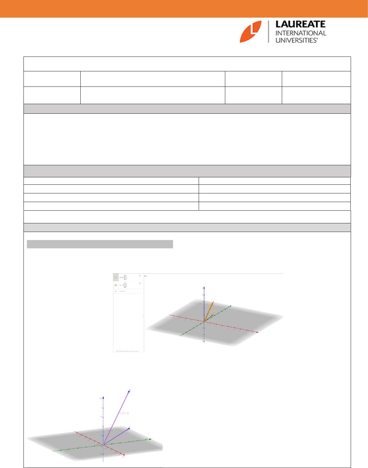 ROTEIRO DE PRÁTICA Tema Estudo do Produto Escalar e Produto Vetorial no GeoGebra Unidade 01 Disciplina (s) ▪ Álgebra Linear Computacional Data da última atualização 03/02/2020 I. Instruções e observações LEIA COM ATENÇÃO AS SEGUINTES INSTRUÇÕES E OBSERVAÇÕES 1. É importante o conhecimento prévio do conteúdo sobre vetores, produto escalar e produto vetorial. 2. É imprescindível ter o roteiro da prática em mãos. II. Materiais Descrição Quantidade Software GeoGebra 3D Online Roteiro da prática 1 Calculadora científica 1 V. Experimento ETAPA 1: determinação do ângulo entre dois vetores PASSO 1: Esboce, no GeoGebra 3D, os vetores �⃗� = (1,1,1) e 𝑣 = (1,1,3). O Geogebra reconhece os vetores a partir de letras minúsculas. PASSO 2: Ainda usando o GeoGebra, insira três pontos no espaço, sendo eles a origem do sistema de coordenadas cartesianas e as extremidades dos vetores já representados: 𝐴 = (0,0,0), 𝐵 = (1,1,1) e 𝐶(1,1,3). Esses pontos servirão para identificarmos o ângulo entre os vetores �⃗� e 𝑣 , conforme PASSO 3 abaixo. PASSO 3: Usando a ferramenta de medição ÂNGULO , clique sequencialmente nos pontos 𝐵→𝐴→𝐶. Qual o ângulo apresentado? Ângulo = 29,5° PASSO 4: Calcule, usando a fórmula abaixo, o ângulo entre os vetores �⃗� e 𝑣 e compare o resultado com o valor encontrado no PASSO 3. �⃗� ∙ 𝑣 = |�⃗� | |𝑣| cos (�⃗� , 𝑣 ) ETAPA 2: determinação do produto vetorial PASSO 5: Calcule, no espaço abaixo, o produto vetorial entre os vetores �⃗� e 𝑣 . PASSO 6: Usando o GeoGebra, represente o vetor �⃗⃗� = �⃗� × 𝑣 . Para isso, digite a função �⃗⃗� = �⃗� ⊗ 𝑣 . Compare o resultado com o vetor determinado no PASSO 5. Observação: o operador ⊗ pode ser encontrado a partir do seguinte procedimento: PASSO 7: Usando o mesmo procedimento realizado nos PASSOS 2 e 3, identifique o ângulo entre os pares de vetores (�⃗� , �⃗⃗� ) e (𝑣 , �⃗⃗� ). O resultado verificado era previsível? Por quê? ETAPA 3: determinação da área de um triângulo a partir do produto vetorial PASSO 8: Utilizando a ferramenta de esboço de polígonos , clique nos pontos 𝐴, 𝐵 e 𝐶 para representar o triângulo 𝐴𝐵�̂�. PASSO 9: Identifique a área do polígono 𝐴𝐵�̂�, clicando na ferramenta de medição de área e, em sequência, no polígono representado. Qual o valor da área encontrada? 1,41 cm^2 PASSO 10: Utilize produto vetorial para comprovar o resultado encontrado no PASSO 9. Lembrete: 𝐴 = 1 2 |�⃗� × 𝑣 |. VII. Referências ▪ PAULO WINTERLE. Vetores e geometria analítica, 2ed. Pearson 256 ISBN 9788543002392. ▪ SANTOS, Fabiano José dos. Geometria analítica. Porto Alegre ArtMed 2009 1 recurso online ISBN 9788577805037.