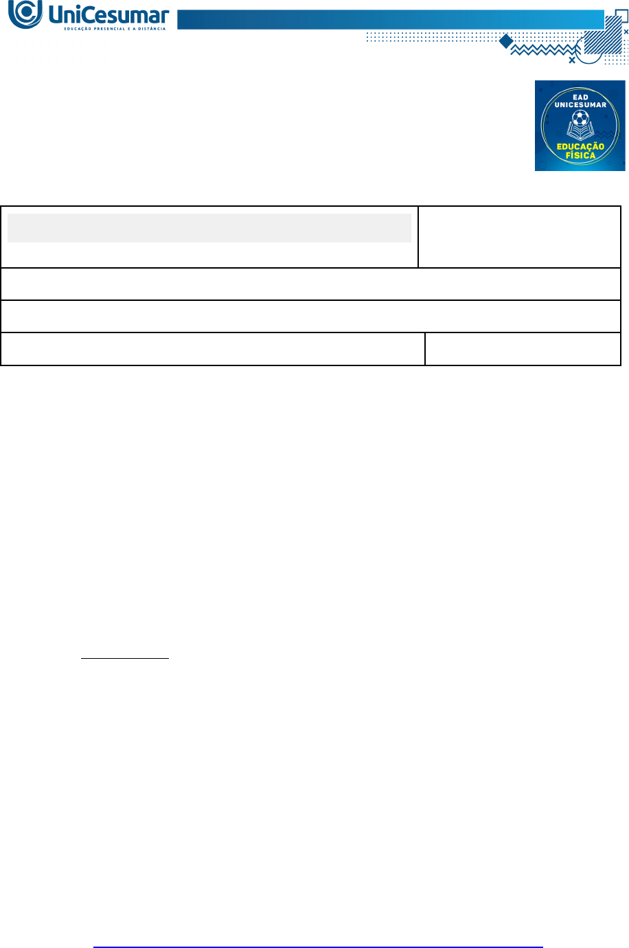 MAPA – Material de Avaliação Prática da Aprendizagem Acadêmico: R.A. Curso: EDUCAÇÃO FÍSICA Disciplina: ATIVIDADE FÍSICA E QUALIDADE DE VIDA Valor da atividade: 3,5 Prazo: 25/03/2022 Instruções para Realização da Atividade 1. Todos os campos acima deverão ser devidamente preenchidos; 2. É obrigatória a utilização deste formulário para a realização do MAPA; 3. Esta é uma atividade individual. Caso identificado cópia de colegas, o trabalho de ambos sofrerá decréscimo de nota; 4. Utilizando este formulário, realize sua atividade, salve em seu computador, renomeie e envie em forma de anexo; 5. Formatação exigida para esta atividade: documento Word, Fonte Arial ou Times New Roman tamanho 12, Espaçamento entre linhas 1,5, texto justificado; 6. Ao utilizar quaisquer materiais de pesquisa referencie conforme as normas da ABNT; 7. Na Sala do Café do ambiente virtual da disciplina você encontrará orientações importantes para elaboração desta atividade. Confira! 8. Critérios de avaliação: Utilização do template; Atendimento ao Tema; Constituição dos argumentos e organização das Ideias; Correção Gramatical e atendimento às normas ABNT. 9. Procure argumentar de forma clara e objetiva, de acordo com o conteúdo da disciplina. Em caso de dúvidas, entre em contato com seu Professor Mediador. Bons estudos! VÍDEO EXPLICATIVO DA ATIVIDADE MAPA https://www.youtube.com/watch?v=4sZvHfTlMFU Saber elaborar, planejar e prescrever um programa de exercícios físicos eficaz e seguro, é fundamental para que você seja um profissional de Educação Física de excelência. Assim, para que você consiga chegar aos objetivos que responderão a melhoria da aptidão física relacionada à saúde (aptidão cardiorrespiratória, força e resistência muscular, composição corporal e flexibilidade), você deverá se embasar em princípios e variáveis fisiológicas que englobam um programa de treinamento físico. SMIRMAU.B, P. C.; ESTEVES, J. V. D. C. Atividade física e saúde. UniCesumar: Maringá, 2021. Considerando a grande importância do profissional de Educação Física na elaboração de programas de exercícios que influenciarão a saúde da população, suponha que você está auxiliando um estagiário em algumas dúvidas sobre as orientações gerais para a prescrição de exercício físico. As perguntas do estagiário estão descritas abaixo e você necessita responde-las da forma mais correta possível. Portanto, inclua suas respostas para cada pergunta do estagiário, no retângulo indicado como “RESPOSTA”. a) “Professor, eu sei que existem alguns princípios que são fundamentais para elaborar um bom programa de treinamento físico. Eu me lembro que são cinco princípios, mas não me lembro o nome deles. Quais princípios são esses?” Princípio da individualidade biológica – o organismo reage aos estimulos do programa de exercicios de maneira unica. Princípio da especificidade – as respostas e adaptaçoes fisiologicas e metabolicas ao treinamento fisico são especificas para os grupos musculares envolvidos. Princípio da sobrecarga de treinamento – a sobrecarga é alcançada com aumentos na frenquancia, intensidade ou duração dos exercicios aerobicos. Princípio da progressão e da continuidade – o programa de treinamento deve estimula-lo de maneira progressiva e com regularidade. Princípio da reversibilidade ou princípio do uso e do desuso – quando os indivíduos descontinuam o exercício, a capacidade de exercício diminui e os benefícios/treinamento são perdidos. b) “Professor, eu gostaria de elaborar exercícios específicos para o tênis. Então, qual princípio eu devo levar em consideração?” O principio que deve ser levado em consideração é o da especificidade. c) “Professor, para que eu possa montar um programa de exercício físico que corresponda com os objetivos do meu aluno, além desses princípios eu sei que eu preciso seguir seis componentes que são essenciais. Eu sei que a sigla deles é FITT-VP, mas não me lembro o nome deles. Quais são esses componentes?” Frequência (o quão frequentemente); Intensidade (o quão forte/intenso); Tempo (duração); e Tipo (modo ou que tipo), além de Volume (quantidade) e Progressão (avanço) ou princípio. d) Você pediu para que o estagiário dividisse uma sessão de treino de um aluno iniciante em fases, constando a duração de cada uma delas. O estagiário dividiu a sessão sequencialmente, da seguinte forma: TREINO: - Aquecimento: 2 minutos - Fase de condicionamento: sem tempo determinado - Treino de flexibilidade: sem tempo determinado Portanto, responda: Qual(is) erro(s) o estagiário cometeu? Faltou uma fase da sessão, sendo a volta a calma com tempo de 5 a 10 minutos, o tempo da sessão de aquecimento está errado pois precisa ser de pelo menos 5 a 10 minutos. ORIENTAÇÕES PARA A REALIZAÇÃO DA ATIVIDADE - Faça o download do arquivo MODELO DE MAPA – ATIVIDADE FÍSICA E SAÚDE, que se encontra no Material da Disciplina; - Leia atentamente todas as informações e tire suas dúvidas com o professor mediador antes de entregar sua atividade; - Siga todas as orientações contidas no MODELO DE MAPA –ATIVIDADE FÍSICA E SAÚDE; - Utilize o livro da disciplina como principal fonte de apoio. - Antes de entregar a atividade, confira se o arquivo está correto (poderá ser entregue o arquivo em formato Word ou PDF). ORIENTAÇÕES GERAIS - Muito importante! Você deverá entregar essa atividade, apenas, por meio do MODELO DE MAPA – ATIVIDADE FÍSICA E SAÚDE. - Cópias parcial ou total serão zeradas. - Todas as atividades do curso são avaliadas conforme o que está sendo solicitado e as instruções fornecidas. Sendo assim, o descumprimento dessas orientações sempre acarreta algum desconto na nota. - Todas as informações necessárias sobre o mapa estão descritas e organizadas no MODELO DE MODELO DE MAPA – ATIVIDADE FÍSICA E SAÚDE.
