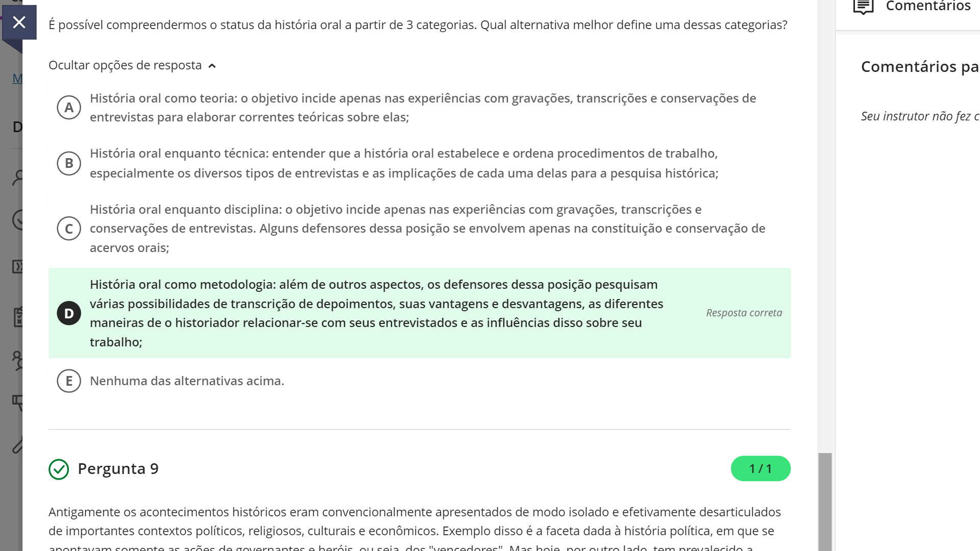 Comentários É possível compreendermos status da história oral a partir de 3 categorias. Qual alternativa melhor define uma dessas categorias? A - História oral como teoria: o objetivo incide apenas nas experiências com gravações, transcrições e conservações de entrevistas para elaborar correntes teóricas sobre elas; B - História oral enquanto técnica: entender que a história oral estabelece e ordena procedimentos de trabalho, especialmente os diversos tipos de entrevistas e as implicações de cada uma delas para a pesquisa histórica; C - História oral enquanto disciplina: o objetivo incide apenas nas experiências com gravações, transcrições e conservações de entrevistas. Alguns defensores dessa posição se envolvem apenas na constituição e conservação de acervos orais; D - História oral como metodologia: além de outros aspectos, os defensores dessa posição pesquisam várias possibilidades de transcrição de depoimentos, suas vantagens e desvantagens, as diferentes maneiras de o historiador relacionar-se com seus entrevistados e as influências disso sobre seu trabalho; E - Nenhuma das alternativas acima.