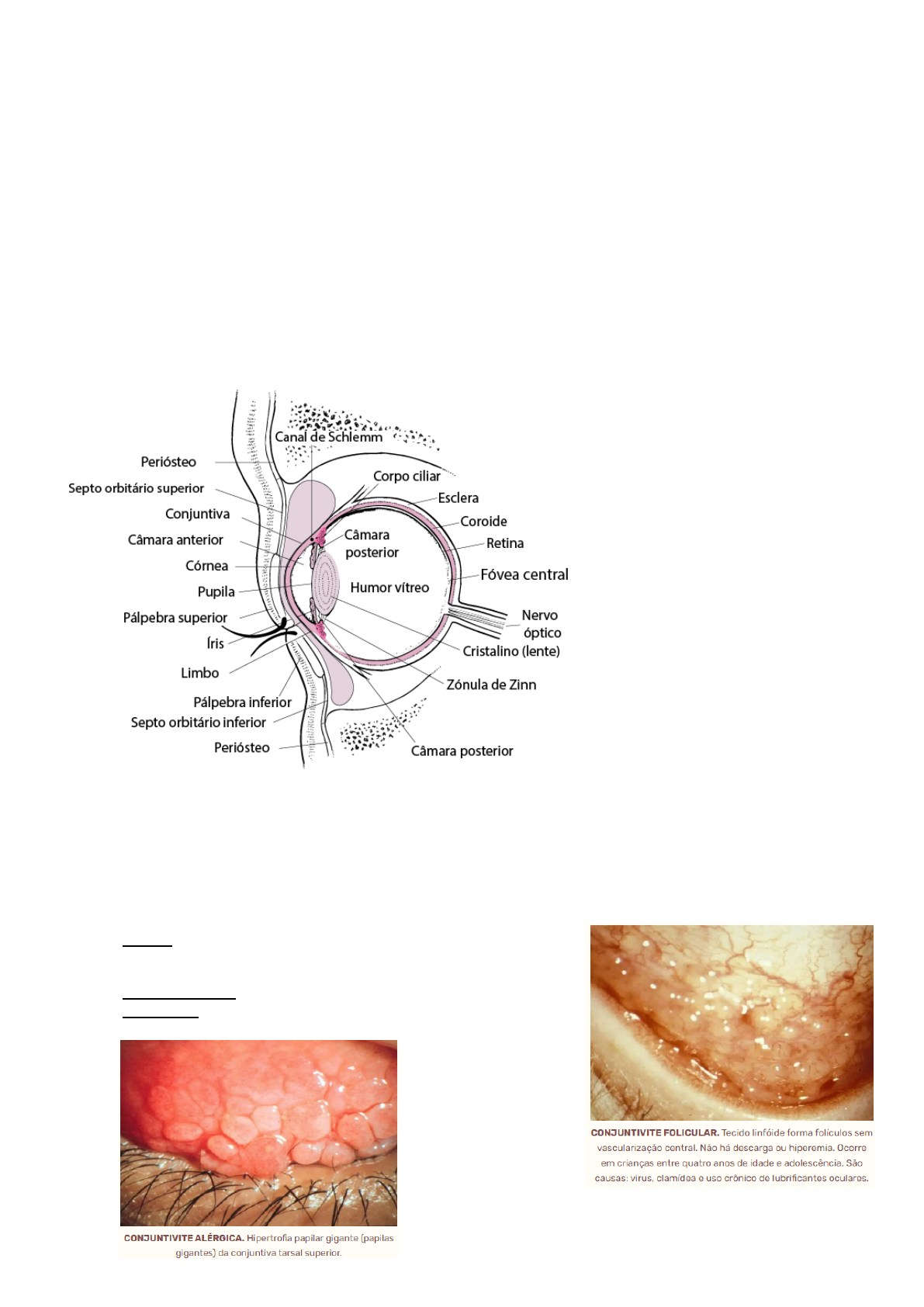 Conjuntivites > Introdução Conjuntivite = qualquer afecção inflamatória da conjuntiva, havendo um olho vermelho e secreção (padrão ouro das conjuntivites) - etiologias: infecciosa, alérgica, tóxica, cicatricial e granulomatosa - classificação: - hiperagudas: aparecimento < 12 horas - agudas: duração < 3 semanas - crônicas: duração > 3 semanas - transmissão: - contato direto - fômites - infecções adjacentes >> Anatomia da conjuntiva Se estende do limbo à junção mucocutânea da pálpebra Duas porções: palpebral (tarsal) e bulbar Na região medial: prega semilunar (dobra de conjuntiva) e carúncula (glândulas sebáceas e folículos pilosos) >> Flora conjuntival S. epidermidis, S. aureus, S. viridans, fungos Microbiota estável >> Fatores de proteção Piscar os olhos, fluxo lacrimal (lisozima, lactoferrina, Ig) São encontrados na conjuntiva normal: linfócitos, mastócitos, células plasmáticas e macrófagos > Resposta tecidual nas conjuntivites - Papilas: sinal inflamatório inespecífico, projeção de epitélio hipertrófico com centro fibrovascular, aspecto em mosaico por septos do tarso → associação com alergia - Papilas gigantes (> 1mm por ruptura dos septos) - Folículos: resposta linfocitária, sem vaso central, podem estar presentes na conjuntiva normal Imagens: Conjuntivite Epidemiologia Manifestações clínicas - sinais Manifestações clínicas - sintomas Diagnóstico Tratamento Conj. Infecciosas Jovens Inverno e primavera Alcoolismo Desnutrição Hiperemia Exsudação Quemose (edema) Papilas e folículos Membranas e pseudomembranas Cicatrizes Granulomas (tuberculose) Sensação de CE Ardência Fotofobia Lacrimejamento Prurido Irritação Clínico; Pesquisa laboratorial com coleta de swab quando o diagnóstico é duvidoso, quando ocorre um insucesso no tratamento ou quando temos uma conjuntivite neonatal; Citologia corada pelo GIEMSA, Citologia pelo papanicolau, Imunofluorescência quando há suspeita de clamídia ou adenovírus Conj. Hiperagudas Neonatos e jovens Neisseria gonorrhoeae ou N. meningitidis obs: profilaxia neonatal com colírio de nitrato de prata Severa conjuntivite com secreção purulenta abundante Quemose Hiperemia Edema palpebral Adenopatia pré-auricular Membranas Úlcera de córnea = internação (ceftriaxone 1g EV 12/12h por 3 a 7 dias + 1g VO de probenecida dose única antes + pesquisar DST no paciente) GRAM GIEMSA Cultura Sistêmico e tópico Ceftriaxone 1g IM DU ou Penicilina G procaína 4,8 milhões IM DU Tratar coinfecção por Chlamydia Profilaxia para contactantes: Rifampicina 600mg Higiene local com SF h/h, colírio de quinolona ou eritromicina 0,5% pomada h/h Conj. Bacteriana Aguda Agentes: GRAM + S. aureus: associação com blefarite (toxinas) S. pneumoniae: crianças, hemorragia subconjuntival e pseudomembrana Haemophilus: criança pequena, pode ter Secreção amarelada envolvimento sistêmico Conj. Viral Aguda Adenovírus (47 sorotipos) - altamente resistente e contagioso obs: outros agentes - coronavírus, varíola Ceratoconj. Epidêmica - sorotipos 8 e 19 - adultos - 7 a 10 dias Hiperemia Folículos Lacrimejamento Adenopatia pré-auricular Pseudomembranas Pode evoluir com infiltrados subepiteliais Sensação de CE Ceratite clássica: pontos esbranquiçados no epitélio que coram com fluorescência → podem confluir e resultar em baixa visual Sintomático Corticóides Febre faringoconjuntival - sorotipos 2, 4 e 7 - crianças Acometimento sistêmico Pouco acometimento corneano Sintomático Conj. Alérgicas Conj. Sazonal - Ag outdoor Conj. Perene - Ag indoor Edema palpebral Lacrimejamento Sem comprom. córnea Prurido Clínico Medidas ambientais, lágrimas artificiais, colírios antialérgicos, corticoesteróides Ceratoconj. Primaveril - crianças e adolescentes - autolimitada e sazonal Secreção mucosa Papilas Nódulo de Trantas = células epiteliais e eosinófilos Limbo gelatinoso Prurido intenso Lágrimas artificiais, compressas geladas, colírios antialérgicos, corticosteróides tópicos subconjuntivais Tacrolimus tópico colírio/pomada Ceratoconj. Atópica Conj. Papilar Gigante Ceratites > Introdução Ceratite = quadro inflamatório da córnea que pode gerar cicatrizes e sequelas visuais >> Anatomia da córnea > Ceratites Epiteliais Infiltrados: áreas focais de inflamação ativa composta pelo acúmulo de leucócitos e restos celulares Úlceras: necrose do tecido conjuntivo devido à liberação de enzimas da resposta inflamatória ou dos patógenos - Superficial: Lesões epiteliais mínimas que ficam brancas com fluoresceína e que podem ser causada por adenovírus, clamídia, hipersensibilidade estafilocócica, lente de contato, atrito, ressecamento - Profunda: Podem ulcerar a córnea; tem infiltrado inflamatório, acúmulo de leucócitos; há necrose tecidual com liberação de enzimas inflamatórias. Essas úlceras podem ser estéreis ou de origem infecciosa > Ceratite Bacteriana Fatores predisponentes: qualquer fator associado à diminuição da defesa corneana - lentes de contato - trauma corneano - alterações palpebrais - olho seco - conjuntivites Diagnóstico: cultura Tratamento: ATB tópico empírico até resultado da cultura > Ceratite Herpética Associada ao herpes tipo 1 (HSV 1) e ao primeiro contato durante a infância→ localizado em uma região inervada pelo trigêmeo Recorrente, pode gerar úlceras Manifestações: reação folicular com vermelhidão, lacrimejamento e dor; pode comprometer a córnea em diferentes camadas Ao exame: Tratamento: antiviral sob forma de pomadas oftálmicas ou sistêmico em caso de imuno-deprimidos > Ceratite fúngica Agentes: associação com trauma com material vegetal - fungos filamentosos: climas quentes, relacionado a trauma prévio - leveduras: doenças preexistentes, olho seco ou uso incorreto de corticoide Manifestações: inflamação “mais fria” e arrastada Ao exame: presença de lesões satélite, hipópio, anel imune, aspecto seco e úlcera 
