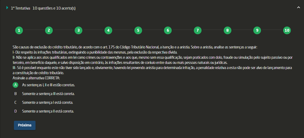 São causas de exclusão do crédito tributário, de acordo com art. 175 do Código Tributário Nacional, a isenção e a anistia. Sobre a anistia, analise as sentenças a seguir: Assinale a alternativa CORRETA: I- Diz respeito às infrações tributárias, extinguindo a punibilidade das mesmas, pela exclusão da respectiva dívida. II- Não se aplica aos atos qualificados em lei como crimes contravenções e aos que, mesmo sem essa qualificação sejam praticados com dolo, fraude ou simulação pelo sujeito passivo ou por terceiro, em benefício daquele, e salvo disposição em contrário, às infrações resultantes de conluio entre duas ou mais pessoas naturais ou jurídicas. III- Só é possível enquanto este não tiver sido lançado e, obviamente, havendo lei prevendo anistia para determinada infração, a penalidade relativa a esta não pode ser alvo de lançamento para de crédito tributário. A - As sentenças I e III estão corretas. B - Somente a sentença III está correta. C - Somente a sentença I está correta. D - Somente a sentença II está correta.