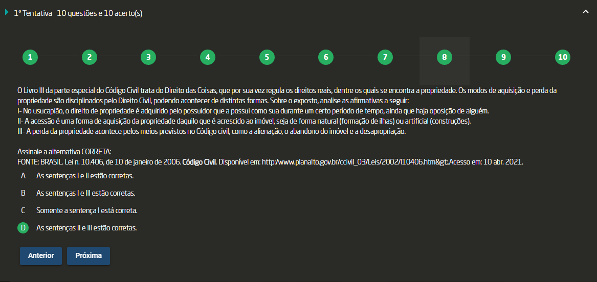 Livro III da parte especial do Código Civil trata do Direito das Coisas, que por sua vez regula os direitos reais, dentre os quais se encontra a propriedade. Os modos de aquisição e perda da propriedade são disciplinados pelo Direito Civil, podendo acontecer de distintas formas. Sobre o exposto, analise as afirmativas a seguir: I- No usucapião, direito de propriedade é adquirido pelo possuidor que a possui como sua durante um certo período de tempo, ainda que haja oposição de alguém. II- A acessão é uma forma de aquisição da propriedade daquilo que é acrescido ao imóvel, seja de forma natural (formação de ilhas) ou artificial (construções). III- A perda da propriedade acontece pelos meios previstos no Código civil, como a alienação, abandono do imóvel e a desapropriação. Assinale a alternativa CORRETA: I- No usucapião, direito de propriedade é adquirido pelo possuidor que a possui como sua durante um certo período de tempo, ainda que haja oposição de alguém. II- A acessão é uma forma de aquisição da propriedade daquilo que é acrescido ao imóvel, seja de forma natural (formação de ilhas) ou artificial (construções). III- A perda da propriedade acontece pelos meios previstos no Código civil, como a alienação, abandono do imóvel e a desapropriação. A As sentenças I e II estão corretas. B As sentenças II e III estão corretas. C Somente a sentença I está correta. D As sentenças III estão corretas.