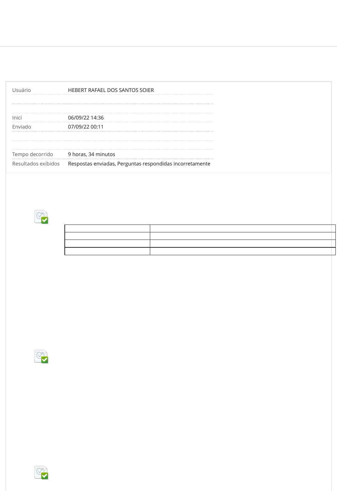 Revisar envio do teste: QUESTIONÁRIO UNIDADE I BIOESTATISTICA APLIC A BIOMED D37F_25801_R_20222 CONTEÚDO Usuário HEBERT RAFAEL DOS SANTOS SOIER Curso BIOESTATISTICA APLIC A BIOMED Teste QUESTIONÁRIO UNIDADE I Iniciado 06/09/22 14:36 Enviado 07/09/22 00:11 Status Completada Resultado da tentativa 5 em 5 pontos Tempo decorrido 9 horas, 34 minutos Resultados exibidos Respostas enviadas, Perguntas respondidas incorretamente Pergunta 1 Resposta Selecionada: c. Relacione as variáveis de uma pesquisa estatística, apresentadas à esquerda, com as características de uma população, analisada por um pesquisador, apresentadas à direita: 1. Qualitativa nominal (__) Comprimento de mudas de eucalipto (m) 2. Qualitativa ordinal (__) Número de plantas acima de 1,5 m 3. Quantitativa discreta (__) Aspecto das plantas (saudável, doente) 4. Quantitativa contínua (__) Escore de classificação da planta (ruim, regular ou ótimo) A sequência correta é: 4, 3, 1, 2. Pergunta 2 Resposta Selecionada: b. Em uma linha de produção, 2000 latas de tinta, de 0,9 L cada, são produzidas por hora. Um funcionário responsável pelo controle de qualidade necessita retirar uma amostra dessa população para avaliar se o volume das latas está dentro dos valores aceitáveis de erro. Assumindo que a amostra deverá ser composta por 40 latas e uma a cada k-ésima da produção deverá ser selecionada de forma sucessiva, até atingir o tamanho da amostra, essa amostragem pode ser considerada: Sistemática. Pergunta 3 Observe o seguinte trecho extraído de um aplicativo de celular: “Quer viajar mais e pagar menos? Envie descontos para seus amigos experimentarem a Uber. Você ganhará R$ 10,00 de desconto em cada uma de suas próximas 2 viagens quando eles começarem a UNIP BIBLIOTECAS MURAL DO ALUNOCONTEÚDOS ACADÊMICOS 0,5 em 0,5 pontos 0,5 em 0,5 pontos 0,5 em 0,5 pontos http://company.blackboard.com/ https://ava.ead.unip.br/webapps/blackboard/execute/courseMain?course_id=_238768_1 https://ava.ead.unip.br/webapps/blackboard/content/listContent.jsp?course_id=_238768_1&content_id=_2900978_1&mode=reset https://ava.ead.unip.br/webapps/portal/execute/tabs/tabAction?tab_tab_group_id=_49_1 https://ava.ead.unip.br/webapps/portal/execute/tabs/tabAction?tab_tab_group_id=_27_1 https://ava.ead.unip.br/webapps/portal/execute/tabs/tabAction?tab_tab_group_id=_47_1 https://ava.ead.unip.br/webapps/portal/execute/tabs/tabAction?tab_tab_group_id=_25_1 https://ava.ead.unip.br/webapps/login/?action=logout Resposta Selecionada: c. viajar.” Observa-se que, com esse estímulo, a Uber deseja ampliar sua base de clientes, identi�cando indivíduos da população e esses identi�cam outras observações que pertencem à mesma população, aumentando a amostragem de clientes da empresa. Tem-se, portanto, um exemplo de: Amostragem por bola de neve. Pergunta 4 Resposta Selecionada: b. Um pesquisador deseja estudar o comportamento dos preços do litro de leite em supermercados e, para tanto, desenvolve sua amostragem por meio de informações publicadas nos folhetins promocionais de quatro supermercados. Isso representa uma: Amostragem por conveniência. Pergunta 5 Resposta Selecionada: b. Em uma pesquisa deseja-se avaliar o per�l de distribuição de frequências para os resultados positivos de exames toxicológicos para renovação da Carteira Nacional de Habilitação, emitidos por um laboratório credenciado, destacando-se o tipo de substância detectada. A escolha do grá�co mais adequado para esse �m seria: Grá�co de barras. Pergunta 6 O grá�co sumariza os eventos observados para a variável “tempo de permanência” de ratos no braço aberto de um labirinto em cruz elevado. Os animais haviam sido tratados com uma droga X e esperava- se avaliar os efeitos ansiolíticos desse composto (quanto maior o efeito ansiolítico, mais tempo os animais permaneceriam nos braços abertos do labirinto). 0,5 em 0,5 pontos 0,5 em 0,5 pontos 0,5 em 0,5 pontos Resposta Selecionada: d. Fonte: acervo próprio É possível inferir, com base no grá�co, que a amplitude interquartílica dos dados foi de: 2,3. Pergunta 7 Resposta Selecionada: c. O dono de uma grande rede de cafés decidiu calcular como estavam as vendas do último mês, em uma amostra de 21 franquias da rede. Para medir a variância das vendas, ele obteve uma soma dos quadrados dos erros igual a 2.685,24 cafés2 para essa amostra. O desvio padrão de cafés vendidos nessa amostra é igual a: 11,59. Pergunta 8 Resposta Selecionada: d. O desempenho de um vendedor de sapatos foi registrado em determinada semana e o número de vendas concretizadas foi de 25, 12, 14, 16, 18, 20, 35, respectivamente, de domingo a sábado. A média e a mediana de sapatos vendidos foram de: 20 e 18. Pergunta 9 0,5 em 0,5 pontos 0,5 em 0,5 pontos 0,5 em 0,5 pontos Quarta-feira, 7 de Setembro de 2022 00h11min32s BRT Resposta Selecionada: d. Um pesquisador resolveu avaliar se um determinado tratamento seria efetivo na estimulação do sistema imune quanto à produção de glóbulos brancos. O pesquisador resolveu dividir seus animais em dois grupos: um grupo que não receberia o tratamento, denominado “controle”; e um grupo que o receberia, denominado “tratado”. Após tratar os animais por três dias, ele coletou uma amostra de sangue e realizou a contagem de glóbulos brancos para cada animal. Os resultados obtidos estão apresentados na �gura. Com base exclusivamente no que está disposto no grá�co, podemos inferir que: (Média ± Desvio padrão) Fonte: acervo próprio O desvio padrão do grupo tratado é maior do que o do grupo controle, indicando que a variabilidade interna daquele conjunto é maior do que desse. Pergunta 10 Resposta Selecionada: e. Nos quatro primeiros dias úteis de uma semana, um barbeiro atendeu 19, 15, 17 e 23 clientes. No quinto dia útil dessa semana, esse barbeiro atendeu N clientes. Se a média do número diário de clientes atendidos por esse barbeiro no