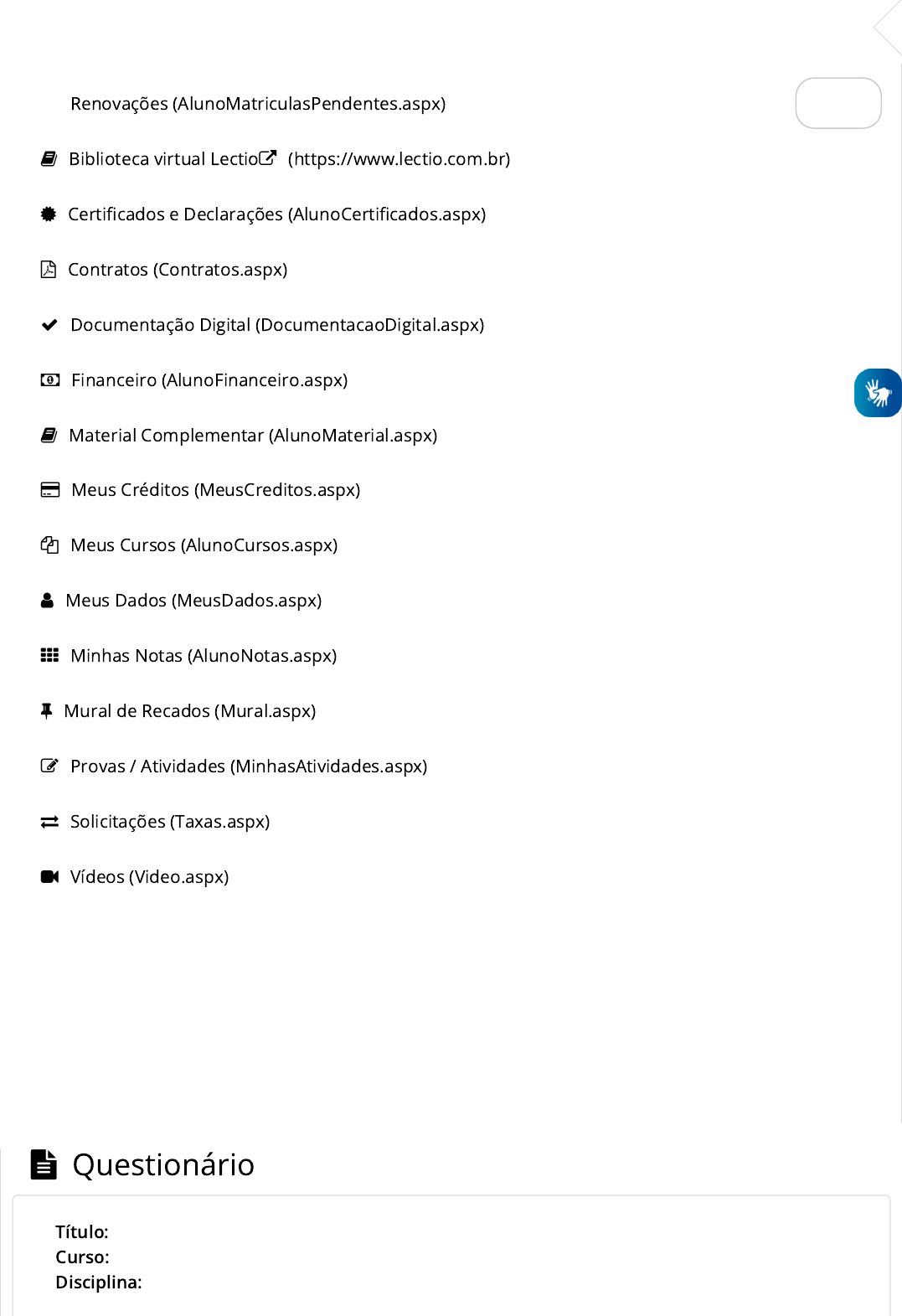 Dany Mendes e outras 6,9 mil pessoas curtiram isso. Curtir Renovações (AlunoMatriculasPendentes.aspx) Biblioteca virtual Lectio (https://www.lectio.com.br) Certi�cados e Declarações (AlunoCerti�cados.aspx) Contratos (Contratos.aspx) Documentação Digital (DocumentacaoDigital.aspx) Financeiro (AlunoFinanceiro.aspx) Material Complementar (AlunoMaterial.aspx) Meus Créditos (MeusCreditos.aspx) Meus Cursos (AlunoCursos.aspx) Meus Dados (MeusDados.aspx) Minhas Notas (AlunoNotas.aspx) Mural de Recados (Mural.aspx) Provas / Atividades (MinhasAtividades.aspx) Solicitações (Taxas.aspx) Vídeos (Video.aspx) Questionário Título: Curso: Disciplina: https://www.facebook.com/danielly.monyk https://cursor.unina.edu.br/Account/AlunoMatriculasPendentes.aspx https://www.lectio.com.br/ https://cursor.unina.edu.br/Account/AlunoCertificados.aspx https://cursor.unina.edu.br/Account/Contratos.aspx https://cursor.unina.edu.br/Account/DocumentacaoDigital.aspx https://cursor.unina.edu.br/Account/AlunoFinanceiro.aspx https://cursor.unina.edu.br/Account/AlunoMaterial.aspx https://cursor.unina.edu.br/Account/MeusCreditos.aspx https://cursor.unina.edu.br/Account/AlunoCursos.aspx https://cursor.unina.edu.br/Account/MeusDados.aspx https://cursor.unina.edu.br/Account/AlunoNotas.aspx https://cursor.unina.edu.br/Account/Mural.aspx https://cursor.unina.edu.br/Account/MinhasAtividades.aspx https://cursor.unina.edu.br/Account/Taxas.aspx https://cursor.unina.edu.br/Account/Video.aspx Em nossos estudos vimos como o bebê precisa do adulto para se desenvolver. É com a mãe a primeira ligação que o bebê tem antes mesmo do seu nascimento e após nascer à voz da mãe pode: Acalmar seus membros inferiores. Acalmar os membros superiores e inferiores; Agitar os membros inferiores; Acalmar seus membros superiores (próximo ao coração) Assinale a alternativa que corresponde a uma atividade realizada pelo ser humano antes de seu nascimento: Andar. Movimentar-se. Falar. Entender. Os pais podem e devem estimular os bebês desde o primeiro mês de vida. Após o nascimento, como os bebês costumam manter seus membros? Os braços e pernas do bebê costumam �car �exionados ao lado do corpo. As pernas costumam �car contraídas. As pernas e pés do bebê costumam �car esticados. Os braços e pernas do bebê costumam �car distantes do corpo. Módulo: Tipo: Atividade Avaliativa-Fundamentos Da Psicomotricidade – Prof.ª Elizabeth Nater +Psicomotricidade 400h Fundamentos da psicomotricidade Módulo 3 AA 1. 2. 3. Quais os movimentos que são expressos pelo bebê? Movimentos involuntários e intencionais. Movimentos direcionados e leves. Movimentos involuntários e irracionais. Movimentos involuntários e sem intenção. Durante o desenvolvimento a criança vai formando sua identidade, ela é um ser sociável. As experiências sociais da criança são manifestas: Através do afetivo, cognitivo e motor. Através do afetivo, recreativo e condutor. Através do interativo, indutivo e motor. Através do afetivo, cognitivo e indutor. Tônus muscular é um estado permanente de contração parcial, passiva e contínua dos músculos. Ainda sobre o tônus muscular é correto a�rmar que se relaciona diretamente à: Linguagem verbal. Conduta moral. Postura corporal. Desenvolvimento intelectual. Segundo a Associação Brasileira de Psicomotricidade, a Psicomotricidade é um termo empregado para a concepção de movimento: Estruturado e subdividido. Organizado e alternado. Organizado e integrado. Estruturado e separado. 4. 5. 6. 7. UNINA Copyright © 2011 - 2022. Todos direitos reservados. Segundo Gonçalves (1994), a visão de totalidade de Marx considera: Que não há dissociação entre o físico e o corpo. Que não há dissociação das partes do corpo. Que não há dissociação entre o conhecimento e o corpo. Que não há separação dos membros superiores com inferiores. Em que ano se nomeia pela primeira vez a Psicomotricidade? 1980 1880 1990 1870 Como a Psicomotricidade é designada por Vitor da Fonseca? Motricidade compartilhada. Motricidade adaptada. Motricidade humanizada. Motricidade condicionada. 8. 9. 10.
