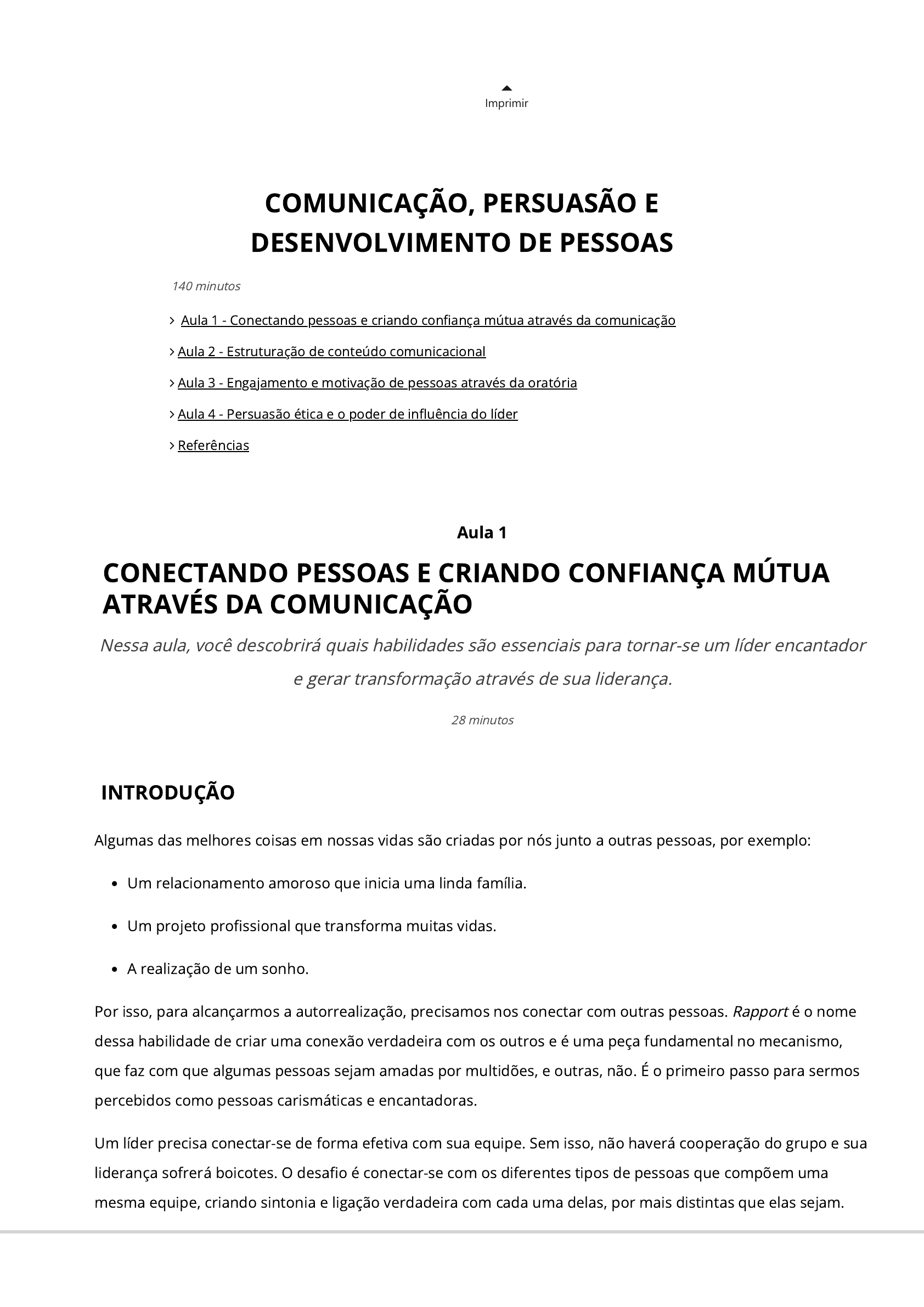 06/09/2022 13:25 wlldd_222_u2_lid_col https://www.avaeduc.com.br/mod/url/view.php?id=1101573 1/33 Imprimir INTRODUÇÃO Algumas das melhores coisas em nossas vidas são criadas por nós junto a outras pessoas, por exemplo: Um relacionamento amoroso que inicia uma linda família. Um projeto pro�ssional que transforma muitas vidas. A realização de um sonho. Por isso, para alcançarmos a autorrealização, precisamos nos conectar com outras pessoas. Rapport é o nome dessa habilidade de criar uma conexão verdadeira com os outros e é uma peça fundamental no mecanismo, que faz com que algumas pessoas sejam amadas por multidões, e outras, não. É o primeiro passo para sermos percebidos como pessoas carismáticas e encantadoras. Um líder precisa conectar-se de forma efetiva com sua equipe. Sem isso, não haverá cooperação do grupo e sua liderança sofrerá boicotes. O desa�o é conectar-se com os diferentes tipos de pessoas que compõem uma mesma equipe, criando sintonia e ligação verdadeira com cada uma delas, por mais distintas que elas sejam. Aula 1 CONECTANDO PESSOAS E CRIANDO CONFIANÇA MÚTUA ATRAVÉS DA COMUNICAÇÃO Nessa aula, você descobrirá quais habilidades são essenciais para tornar-se um líder encantador e gerar transformação através de sua liderança. 28 minutos COMUNICAÇÃO, PERSUASÃO E DESENVOLVIMENTO DE PESSOAS Aula 1 - Conectando pessoas e criando con�ança mútua através da comunicação Aula 2 - Estruturação de conteúdo comunicacional Aula 3 - Engajamento e motivação de pessoas através da oratória Aula 4 - Persuasão ética e o poder de in�uência do líder Referências 140 minutos 06/09/2022 13:25 wlldd_222_u2_lid_col https://www.avaeduc.com.br/mod/url/view.php?id=1101573 2/33 Fazendo isso, o líder acelera a construção de con�ança e estimula as pessoas a sentirem-se seguras ao seu lado. Então, surge um novo desa�o: integrar as pessoas umas às outras. Nessa aula, você descobrirá quais habilidades são essenciais para tornar-se um líder encantador e gerar transformação através de sua liderança. CONEXÃO: O PRIMEIRO PASSO PARA LIDERAR Conexão entre o líder e a equipe O chefe é um mandante, autorizado a dar ordens e comandar. O líder tem a prerrogativa do comando, mas sua função é "orquestrar" sua equipe, engajar as pessoas, alinhá-las, inspirá-las e fomentar um �uxo de trabalho cooperativo entre elas. Para conseguir essa adesão, não basta che�ar: o líder precisa conectar-se com a equipe e angariar a simpatia dos colaboradores, que permitirão que ele exerça sua liderança junto a eles. Criando conexão entre os integrantes de uma equipe Uma equipe é apenas um coletivo de indivíduos que executam funções complementares em conjunto, em prol de um resultado. Cabe ao líder apoiar a criação de um senso de pertencimento e integração das pessoas, para construir uma inteligência de grupo e performance conjunta. Comunicação e Rapport O Rapport é uma das mais importantes habilidades de relacionamento interpessoal. O conceito vem do francês: Re (reciprocidade) + Apporter (trazer consigo). Numa tradução livre, poderíamos dizer que Rapport signi�ca aproximação recíproca entre duas ou mais pessoas, conexão verdadeiramente entre pessoas, criando harmonia, cooperação e uma interação humana de alta qualidade. O Rapport é um fenômeno natural, que ocorre quando pessoas percebem pontos de aproximação e concordância com as outras. Apesar de acontecer naturalmente e depender de reciprocidade, é possível estimulá-lo unilateralmente através de ações simples, com a intenção de criar e manter compreensão mútua e harmoniosa. Para se estabelecer o Rapport, deve-se construir, em um relacionamento, harmonia, con�ança e cooperação. Assim, precisamos estar dispostos a renunciar às nossas características idiossincráticas, �exibilizar nosso comportamento, aproximarmo-nos do outro, criando sintonia e trazendo-o para perto de nós. Bandler e Grinder modelaram habilidades de Rapport demonstradas por Milton H. Erickson, MD, em 1975, criando um modelo de competências que pode ser aprendido e praticado por quaisquer pessoas que queiram se tornar excelentes comunicadores, líderes, professores, pais etc. Esse modelo foi apresentado pela primeira vez nos livros Patterns of the Hypnotic Techniques of Milton Erickson, MD. Vol. I and Vol. II. Figura 1 | Reciprocidade no Rapport 06/09/2022 13:25 wlldd_222_u2_lid_col https://www.avaeduc.com.br/mod/url/view.php?id=1101573 3/33 Fonte: Shutterstock. Critérios essenciais para criar Rapport Aceitar e respeitar diferenças de comportamentos, pensamentos, crenças, valores, habilidades, personalidade, linguagem etc. Abertura para ouvir opiniões e ideias diferentes, sem precisar discordar ou rebater. Receptividade em relação ao outro. Valorizar o outro, independentemente de posição social, gênero, cor, orientação sexual, religião, título, idade, nacionalidade etc. Presença e atenção plena ao outro. Interesse real e curiosidade genuína sobre o outro. Suspensão de julgamentos. Flexibilidade comportamental para adaptarmos nossos comportamentos ao outro. Atenção Não confunda Rapport com: Manipulação: a manipulação é a tentativa de controlar as escolhas e decisões de outra pessoa para benefício próprio. No Rapport, ambos se in�uenciam, crescem e aprendem um com o outro. 06/09/2022 13:25 wlldd_222_u2_lid_col https://www.avaeduc.com.br/mod/url/view.php?id=1101573 4/33 Amizade: é possível criar Rapport em relações cooperativas entre pessoas diferentes, sem intenção de amizade. Concordância: é possível discordar respeitosamente de alguém e manter o Rapport. Con�ança: o Rapport pode ser construído quase que imediatamente entre duas pessoas, con�ança leva mais tempo, mas o Rapport pode acelerar a con�ança. Empatia: empatia é sensibilizar-se em relação à experiência do outro. Rapport é simpatia, sintonia, harmonia e