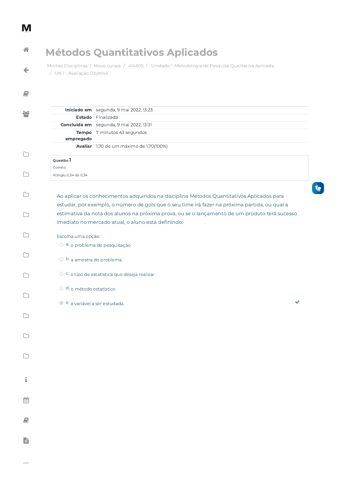 09/05/2022 13:31 UN 1 - Avaliação Objetiva: Revisão da tentativa https://avap.multivix.edu.br/mod/quiz/review.php?attempt=1247278&cmid=1032132 1/4 Minhas Disciplinas / Meus cursos / 414605 / Unidade 1: Metodologia de Pesquisa Qualitativa Aplicada / UN 1 - Avaliação Objetiva Métodos Quantitativos Aplicados Iniciado em segunda, 9 mai 2022, 13:23 Estado Finalizada Concluída em segunda, 9 mai 2022, 13:31 Tempo empregado 7 minutos 43 segundos Avaliar 1,70 de um máximo de 1,70(100%) Questão 1 Correto Atingiu 0,34 de 0,34 Ao aplicar os conhecimentos adquiridos na disciplina Métodos Quantitativos Aplicados para estudar, por exemplo, o número de gols que o seu time irá fazer na próxima partida, ou qual a estimativa da nota dos alunos na próxima prova, ou se o lançamento de um produto terá sucesso imediato no mercado atual, o aluno está de�nindo: Escolha uma opção: a. o problema de pesquisação b. a amostra do problema c. o tipo de estatística que deseja realizar d. o método estatístico e. a variável a ser estudada. https://avap.multivix.edu.br/my/ https://avap.multivix.edu.br/course/view.php?id=13928 https://avap.multivix.edu.br/course/view.php?id=13928§ion=2 https://avap.multivix.edu.br/mod/quiz/view.php?id=1032132 https://avap.multivix.edu.br/my/ https://avap.multivix.edu.br/course/view.php?id=13928 https://avap.multivix.edu.br/user/index.php?id=13928 https://avap.multivix.edu.br/course/view.php?id=13928§ion=1 https://avap.multivix.edu.br/course/view.php?id=13928§ion=2 https://avap.multivix.edu.br/course/view.php?id=13928§ion=3 https://avap.multivix.edu.br/course/view.php?id=13928§ion=4 https://avap.multivix.edu.br/course/view.php?id=13928§ion=5 https://avap.multivix.edu.br/course/view.php?id=13928§ion=6 https://avap.multivix.edu.br/course/view.php?id=13928§ion=7 https://avap.multivix.edu.br/course/view.php?id=13928§ion=8 https://avap.multivix.edu.br/course/view.php?id=13928§ion=9 https://avap.multivix.edu.br/course/view.php?id=13928§ion=10 https://avap.multivix.edu.br/course/view.php?id=13928§ion=11 https://avap.multivix.edu.br/mod/page/view.php?id=1252%2F%22%20target%3D%22_blank https://avap.multivix.edu.br/calendar/view.php/ https://avap.multivix.edu.br/local/staticpage/view.php?page=biblioteca https://portalweb.multivix.edu.br/gabaritos/login.aspx https://multivix.edu.br/office-365/ https://avap.multivix.edu.br/ 09/05/2022 13:31 UN 1 - Avaliação Objetiva: Revisão da tentativa https://avap.multivix.edu.br/mod/quiz/review.php?attempt=1247278&cmid=1032132 2/4 Questão 2 Correto Atingiu 0,34 de 0,34 Questão 3 Correto Atingiu 0,34 de 0,34 Para ingressar em uma faculdade, o estudante deve ter concluído o ensino médio, além de ter escolhido um curso que o auxilie a exercer a pro�ssão que ele deseja, ressaltando a importância de analisar a área de atuação e o acolhimento do mercado atual para formandos da área almejada. Para escolher assertivamente a faculdade o aluno pode fazer vários tipos de amostragem. Analise os conceitos de amostragem abaixo: I. A Amostragem Sistemática é realizada quando os elementos da população já estão ordenados, não havendo a necessidade de construir um sistema de referência. II. A Amostragem Aleatória Simples é realizada quando os elementos da população já estão ordenados, não havendo a necessidade de construir um sistema de referência. III. A Amostragem Estrati�cada é aquela na qual a população base da pesquisação é subdividida em estratos. IV. A Amostragem Aleatória Simples é aquela na qual todos os elementos da população têm a mesma chance de compor a amostra. É CORRETO o que se a�rma em: Escolha uma opção: a. I, III e IV. b. I e III. c. Apenas IV. d. II, III e IV. e. Apenas III. Para adquirir um novo aparelho de TV, Cláudio vai em várias lojas para fazer uma pesquisa de preço, evitando pagar um valor acima do cobrado em alguma loja. Ele fez um roteiro para passar em todas as lojas de todos os shoppings da cidade no período de 8 dias. Podemos a�rmar que o Cláudio realizou uma: Escolha uma opção: a. Amostra dos valores do aparelho de TV de determinada marca em sua região. b. Parte de Métodos Quantitativos dos valores do aparelho de TV de determinada marca em sua região. c. Estatística dos valores do aparelho de TV de determinada marca em sua região. d. Variável Quantitativa dos valores do aparelho de TV de determinada marca em sua região. e. População dos valores do aparelho de TV de determinada marca em sua região. https://avap.multivix.edu.br/my/ https://avap.multivix.edu.br/course/view.php?id=13928 https://avap.multivix.edu.br/user/index.php?id=13928 https://avap.multivix.edu.br/course/view.php?id=13928§ion=1 https://avap.multivix.edu.br/course/view.php?id=13928§ion=2 https://avap.multivix.edu.br/course/view.php?id=13928§ion=3 https://avap.multivix.edu.br/course/view.php?id=13928§ion=4 https://avap.multivix.edu.br/course/view.php?id=13928§ion=5 https://avap.multivix.edu.br/course/view.php?id=13928§ion=6 https://avap.multivix.edu.br/course/view.php?id=13928§ion=7 https://avap.multivix.edu.br/course/view.php?id=13928§ion=8 https://avap.multivix.edu.br/course/view.php?id=13928§ion=9 https://avap.multivix.edu.br/course/view.php?id=13928§ion=10 https://avap.multivix.edu.br/course/view.php?id=13928§ion=11 https://avap.multivix.edu.br/mod/page/view.php?id=1252%2F%22%20target%3D%22_blank https://avap.multivix.edu.br/calendar/view.php/ https://avap.multivix.edu.br/local/staticpage/view.php?page=biblioteca https://portalweb.multivix.edu.br/gabaritos/login.aspx https://multivix.edu.br/office-365/ https://avap.multivix.edu.br/ 09/05/2022 13:31 UN 1 - Avaliação Objetiva: Revisão da tentativa https://avap.multivix.edu.br/mod/quiz/review.php?attempt=1247278&cmid=1032132 3/4 Questão 4 Correto Atingiu 0,34 de 0,34 Questão 5 Correto Atingiu 0,34 de 0,34 Recentemente a população Brasileira teve a oportunidade de acompanhar de perto a realização de uma Copa do
