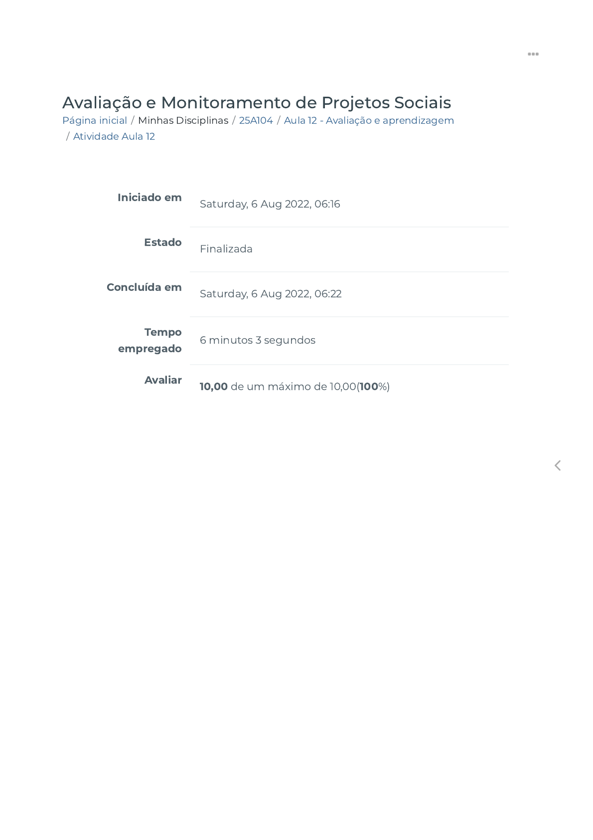 06/08/2022 06:22 Atividade Aula 12 https://ava.politecnicabr.com.br/mod/quiz/review.php?attempt=3453765 1/6 Página inicial / Minhas Disciplinas / 25A104 / Aula 12 - Avaliação e aprendizagem / Atividade Aula 12 Avaliação e Monitoramento de Projetos Sociais Iniciado em Saturday, 6 Aug 2022, 06:16 Estado Finalizada Concluída em Saturday, 6 Aug 2022, 06:22 Tempo empregado 6 minutos 3 segundos Avaliar 10,00 de um máximo de 10,00(100%) https://ava.politecnicabr.com.br/ https://ava.politecnicabr.com.br/course/view.php?id=987 https://ava.politecnicabr.com.br/course/view.php?id=987#section-13 https://ava.politecnicabr.com.br/mod/quiz/view.php?id=30516 https://ava.politecnicabr.com.br/ 06/08/2022 06:22 Atividade Aula 12 https://ava.politecnicabr.com.br/mod/quiz/review.php?attempt=3453765 2/6 Questão 1 Correto Atingiu 2,50 de 2,50 Com relação a aAvaliação e aprendizagem, Marque Verdadeiro ou Falso: O objetivo maior de toda avaliação pode ser compreendido como fornecer juízos argumentados de valor sobre os objetos avaliados a �m de desencadear processos de aprendizagem organizacional e social (BOULLOSA, 2007). Todavia, pesquisas demonstram que raramente as avaliações conseguem responder a esse propósito maior. Ou seja, raramente as avaliações são usadas como instrumentos de discussão e de aprendizagem, assim como raramente conseguem provocar mudanças substanciais em seus objetos de estudo. Em outras palavras, as avaliações deveriam, sempre que possível, alimentar os objetos sociais que avaliam, desencadeando processos de aprendizagem. Esse processo chama-se retroalimentação. Uma das grandes evidências da lacuna de retroalimentação proporcionada por avaliações é a pouca utilidade que estas gozam junto às reformas do setor público. Mas esse não é um problema exclusivo do Brasil. O professor Jean-Claude Thoenig é enfático ao a�rmar que: [...] um exame cuidado dos fatos demonstra que, na maior parte dos países, a avaliação, até o momento, foi utilizada de maneira limitada e esporádica, e que muitas vezes mostrou ser ine�caz. Existem razões para crer que a relutância em usar a avaliação amplamente não se deve necessariamente à ignorância ou à má-vontade. Como resultado, muitas vezes, os governos a�rmam publicamente a necessidade de avaliação, porém falham em praticar o que pregam. (THOENIG, 2000, p. 54-55 ) Não obstante tantos problemas, sabemos também que muitas avaliações conseguem fugir da regra e alimentar processos signi�cativos de melhorias em seus objetos de estudo, quando não estendem tais benefícios a outros âmbitos organizacionais e sociais. Neste capítulo, vamos conhecer as bases teóricas para a compreensão das relações entre avaliação e aprendizagem, assim como discutir algumas das condições que parecem mostrar-se mais adequadas aos propósitos de transformação que todo processo de avaliação poderia desencadear. Escolha uma opção: https://ava.politecnicabr.com.br/mod/resource/view.php?id=30514 https://ava.politecnicabr.com.br/ 06/08/2022 06:22 Atividade Aula 12 https://ava.politecnicabr.com.br/mod/quiz/review.php?attempt=3453765 3/6 Questão 2 Correto Atingiu 2,50 de 2,50 O terceiro caminho possível para a aprendizagem pode ser ainda mais fecundo: buscar construir espaços de avaliação que tentem mesclar positivamente o melhor do que as avaliações internas e externas podem oferecer. No caso das internas, vale a pena citar, acompanhando Boullosa (2008). Exceto: Escolha uma opção: Verdadeiro Falso a. criatividade de eventuais ou potenciais comunidades de prática. b. o profundo conhecimento das rotinas organizacionais por parte das equipes que implementam os programas e projetos sociais. c. podem tornar essas mudanças duradouras. d. redes de contato relativamente consolidadas. e. competência para avaliar a governabilidade das ações de transformação. https://ava.politecnicabr.com.br/ 06/08/2022 06:22 Atividade Aula 12 https://ava.politecnicabr.com.br/mod/quiz/review.php?attempt=3453765 4/6 Questão 3 Correto Atingiu 2,50 de 2,50 Entre muitos autores, vale a pena citar Thoenig (2000), que sintetizou algumas das principais causas das di�culdades de retroalimentação das avaliações para com os seus objetos de estudo. São elas: Escolha uma opção: a. o intervalo de tempo exigido pelas avaliações é frequentemente diferente do ritmo da gestão dos objetos avaliados, sobretudo pela natural urgência na tomada de decisões. b. a resistência dos formuladores de políticas em serem submetidos a um olhar externo de especialistas. c. a irresistível tendência dos avaliadores em traçarem as metas e o conteúdo das reformas como resultados dos seus trabalhos de avaliação, mesmo sem conhecer su�cientemente a estrutura organizacional e política que deveria colocar tais reformas em prática. d. receio de que os resultados das avaliações tenham usos políticos pela mídia ou pela oposição. e. todas as alternativas corretas. https://ava.politecnicabr.com.br/ 06/08/2022 06:22 Atividade Aula 12 https://ava.politecnicabr.com.br/mod/quiz/review.php?attempt=3453765 5/6 Questão 4 Correto Atingiu 2,50 de 2,50 As principais di�culdades de retroalimentação, marque Verdadeiro ou Falso: ( ) A avaliação é um campo relativamente novo, em constante reformulação, e parte das suas novidades metodológicas nascem de uma forte crítica a metodologias já existentes e não mais satisfatórias (por exemplo, as avaliações quase-experimentais nasceram de críticas às limitações das avaliações experimentais e assim por diante), que acabam a�rmando a inutilidade de tais modelos. ( ) A teórica Karen Marie Mokate utiliza ludicamente a expressão “monstro” para sintetizar o sentimento que muitos gestores e implementadores de políticas e de seus instrumentos possuiriam diante da obrigação de colaborar, ou mesmo realizar, avaliações que não teriam “utilidade direta em seus processos gerenc