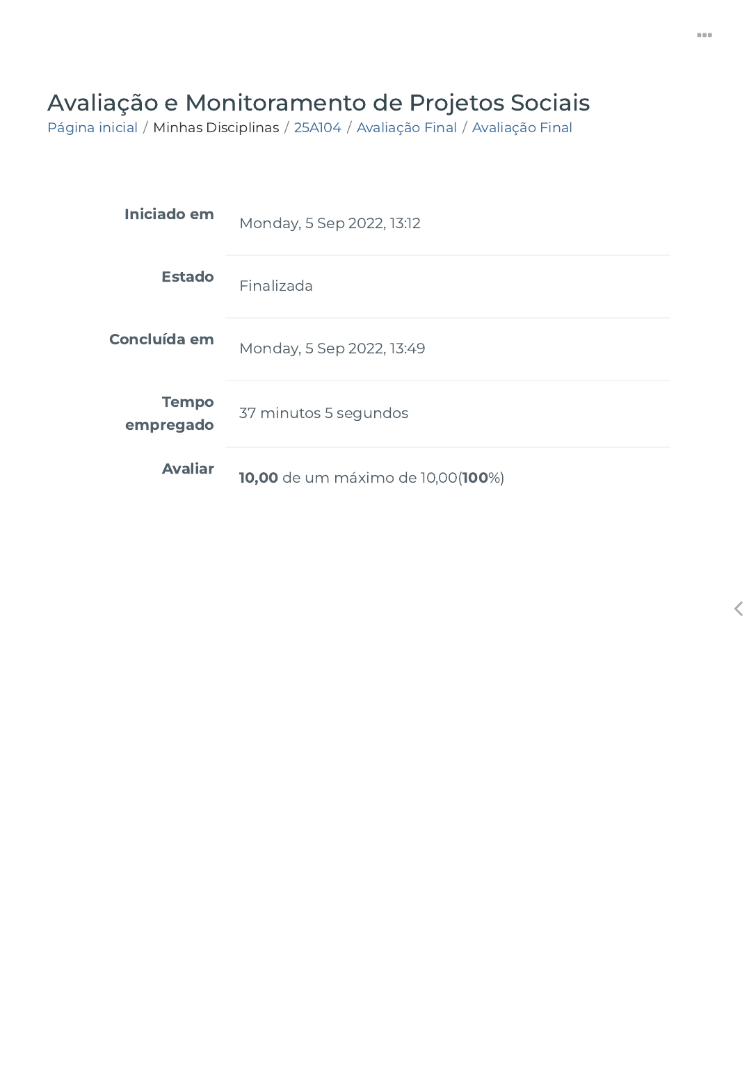Página inicial / Minhas Disciplinas / 25A104 / Avaliação Final / Avaliação Final Avaliação e Monitoramento de Projetos Sociais Iniciado em Monday, 5 Sep 2022, 13:12 Estado Finalizada Concluída em Monday, 5 Sep 2022, 13:49 Tempo empregado 37 minutos 5 segundos Avaliar 10,00 de um máximo de 10,00(100%) https://ava.politecnicabr.com.br/ https://ava.politecnicabr.com.br/course/view.php?id=987 https://ava.politecnicabr.com.br/course/view.php?id=987#section-15 https://ava.politecnicabr.com.br/mod/quiz/view.php?id=30518 https://ava.politecnicabr.com.br/ Questão 1 Correto Atingiu 1,00 de 1,00 Marque Verdadeiro ou Falso, quanto ao nível metodológico- operativo: Estão presentes a re�exão sobre o grau de conhecimento do objeto a ser avaliado (evaluando), as precondições necessárias para o desenvolvimento (e aceitação) da atividade de avaliação, assim como os possíveis usos da pesquisa. Ainda nesse nível, são de�nidos os conjuntos de atores que se relacionaram ao processo de avaliação, incluindo o esboço dos seus possíveis papéis. O desenho da pesquisa avaliatória, coração da avaliação, também é esboçado nesse estágio, pois a mesma já é em grande parte de�nida em função da construção do problema ou da questão central que a avaliação pretende fornecer um juízo. E justamente por isso é que esse nível pode ser chamado de metodológico, pois diz respeito ao conhecimento que queremos ter do objeto que será avaliado, além de estar intrinsecamente relacionado ao pré-conhecimento que já temos sobre o programa, implicando os valores e crenças dos envolvidos com o desejo ou necessidade de se avaliar uma determinada política, plano, programa, projeto ou ação social. Escolha uma opção: Verdadeiro Falso https://ava.politecnicabr.com.br/mod/resource/view.php?id=30493 https://ava.politecnicabr.com.br/ Questão 2 Correto Atingiu 1,00 de 1,00 Sugestões de Bourdieu para a realização de entrevistas cientí�cas, Marque Verdadeiro ou Falso: ( ) Bourdieu (1999) aponta algumas sugestões para com a transcrição da entrevista que é parte integrante da metodologia do trabalho de pesquisa. ( ) Goldenberg (1997) aconselha, na medida do possível, falar a mesma língua do pesquisado, ou seja, o pesquisador deve descer do pedestal cultural e deixar de lado momentaneamente seu capital cultural para que ambos, pesquisador e pesquisado possam se entender. ( ) Bourdieu (1997) assinala que para se realizar uma entrevista bem-sucedida é necessário criar uma atmosfera amistosa e de con�ança, não discordar das opiniões do entrevistado, tentar ser o mais neutro possível. ( ) Bourdieu (1999) indica que a escolha do método não deve ser rígida mas sim rigorosa, ou seja, o pesquisador não necessita seguir um método só com rigidez, mas qualquer método ou conjunto de métodos que forem utilizados devem ser aplicados com rigor. Escolha uma opção: a. V, V, F, V. b. V, F, F, F. c. F, F, V, V. d. V, F, F, V. e. F, V, V, F. https://ava.politecnicabr.com.br/ Questão 3 Correto Atingiu 1,00 de 1,00 literatura especializada em avaliação elencou muitos motivos para que tal saturação ocorresse, dando origem a buscas por novas alternativas de avaliação. Entre os motivos, destacamos alguns: Escolha uma opção: a. excesso de otimismo em acreditar que as avaliações poderiam gerar decisões perfeitas. b. di�culdade em descobrir se os efeitos eram realmente causados pelo projeto avaliado ou não, diante da impossibilidade de se construir grupos de controle idênticos aos grupos de bene�ciários. c. perplexidade e desencanto com a ine�cácia das próprias intervenções avaliadas. d. impaciência dos gestores com os tempos exigidos por esse tipo de avaliação, pois cada processo de avaliação deveria acompanhar os resultados e efeitos de cada projeto sobre um grupo de bene�ciários e um grupo de não bene�ciários (grupo de controle). e. todas as alternativas estão corretas https://ava.politecnicabr.com.br/ Questão 4 Correto Atingiu 1,00 de 1,00 Associe corretamente algumas de�nições sobre avaliação conforme o autor: “A avaliação é a coleta sistemática de informações sobre atividades, características e resultados para a formulação de juízos sobre programas, de modo a melhorar a sua e�cácia ou direcionar decisões sobre a sua programação futura.” “Julgamento do valor ou o mérito de uma ‘entidade’.” “Conjunto de atividades úteis para exprimir um juízo direcionado a um �m – juízo argumentado através de procedimentos de pesquisa avaliativa. Tal pesquisa constitui-se como o elemento essencial e imprescindível para dar con�ança aos procedimentos e para garantir a �delidade das informações utilizadas para exprimir aquele juízo”. “Avaliação é a identi�cação, esclarecimento e aplicação de critérios defensáveis para determinar o valor (ou mérito), a qualidade, a utilidade, a e�cácia ou a importância do objeto avaliado em relação a estes critérios.” “Análise sistemática do processo e ou do resultado de um programa ou de uma política, comparado a um conjunto de valores (standard) implícito ou explícito, a �m de contribuir para o melhoramento do programa ou da política”. Patt Scriv Bezz Wor Caro https://ava.politecnicabr.com.br/ Questão 5 Correto Atingiu 1,00 de 1,00 Pode-se classi�car os indicadores de avaliação como (BUVINICH, 1999; RAPOSO, 2000): Mensuram as atividades implementadas no dia a dia do projeto/programa para a implementação dos recursos e outros processos na tomada de decisão. São intermediários, traduzem em medidas quantitativas o esforço operacional de alocação de recursos para obtenção de melhorias efetivas. Mensuram a quantidade e qualidade dos recursos fornecidos para um programa ou projeto. Correspondem às medidas associadas à disponibilidade de recursos. Mensuram a quantidade e qualidade dos bens e serviços criados ou fornecidos atra
