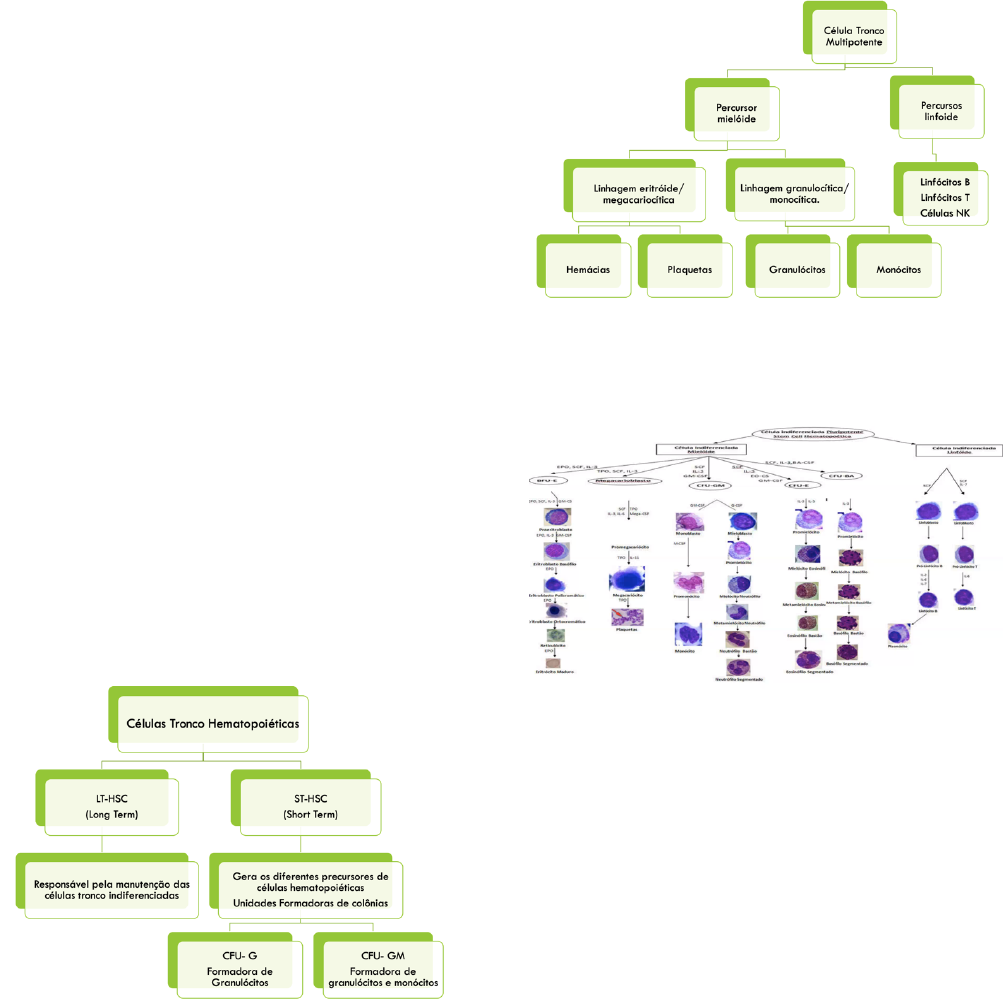 Geovana Sanches, TXXIV INTRODUÇÃO A SERIE BRANCA HEMATOPOIESE Hemetopoise ou hematopoese é o processo de formação das células sanguíneas (ou elementos figurados do sangue) a partir de uma célula tronco. Célula tronco Existem diferentes classificações para as células tronco, a saber: • Célula tronco totipotente: podem formar tecidos e células extra e intra embrionários. • Célula tronco pluripotente: podem formar tecidos e células intra embrionárias (ectoderma, mesoderma e endoderma) • Célula tronco multipotente: diferenciam em alguns tipos celulares (já tem comprometimento de linhagem) As células tronco hematopoiéticas presentes na medula óssea são multipotentes, ou seja, são capazes de originar as diversas linhagens celulares sanguíneas. Elas são divididas em long term e short term, de acordo com o tipo de estímulo que receber. • Long Term (LT-HSC): replicam-se em uma célula tronco igual a de origem, ou seja, são responsáveis pela manutenção (reserva) das células tronco indiferenciadas. • Short Term (ST-HSC): gera os diferentes precursores de células hematopoiéticas, funcionando como unidades formadoras de colônias. A partir das células tronco multipotentes serão formados os precursores mieloide e linfoide: • Precursor linfoide: formação de linfócitos B, linfócitos T e células NK • Precursor mieloide: o Linhagem eritroide / megacariocítica § Hemácias (eritrócitos) § Plaquetas o Linhagem granulocítica / moncítica § Granulócitos • Basófilos • Eosinófilos • Neutrófilos § Monócitos Células presentes na medula óssea Na medula óssea são encontradas diversas células precursoras, sendo que a maioria delas só está fisiologicamente presente nesse local. Células presentes no sangue periférico No sangue periférico (elemento analisado no hemograma) temos principalmente células maduras, tais quais: hemácias, basófilos (formato de brigadeiro), eosinófilos (núcleo bilobulado), monócitos (célula mononuclear sem grânulos no interior do citoplasma), neutrófilos, linfócitos e plaquetas (não é uma célula). A exceção às células maduras é a família dos neutrófilos pois, sendo as células brancas mais abundantes entre os leucócitos, pode ser visto algum grau de divisão celular. Quando aos linfóticos, não é possível a diferenciação entre linfócito B ou T. Classificamo- nos como linfócitos típicos (sem atividade) ou atípicos (em plena atividade, como ocorre na mononucleose, podendo assemelhar-se a outra célula que não um linfócito). Geovana Sanches, TXXIV LEUCÓCITOS São produzidos cerca de 1,5 bilhão de leucócitos por dia. Eles podem ser divididos em granulócitos, monócitos e linfócitos, sendo que cada uma delas tem uma função, visando gerar o complexo sistema de defesa do organismo. No sangue periférico, são encontrados: • Granulócitos ou polimorfonucleares o Neutrófilos ou segmentados o Basófilos o Eosinófilos • Mononucleares o Monócitos o Linfócitos Granulopoiese Os neutrófilos são as células mais prevalentes no sangue periférico e, portanto, as que mais aparecem no hemograma. Fisiologicamente, é possível identificar além do neutrófilo (segmentado), os bastonetes. Em algumas condições patológicas, é possível identificar todos as células envolvidas no desenvolvimento nos neutrófilos (família dos neutrófilos), tais quais: mieloblasto, promielócito, mielócito, metamielócito, bastonete e neutrófilo. Leucograma Item Referência Valor absoluto Leucócitos: 4.000 – 10.000 Blastos 0% 0 Promielócitos 0% 0 Mielócitos 0% 0 Metamielócitos 0% 0 Bastonetes 0 – 8% 0 – 700 Segmentados ou Neutrófilos 40 – 70% 1.500 – 7.000 Eosinófilos 1 – 5% 0 – 450 Basófilos 0 – 3% 0 – 200 Linfócitos 20 – 50% 1.000 – 4.500 Monócitos 2 – 10% 100 – 1.000 Ao analisarmos o leucograma, habitualmente apenas o total de leucócitos é apresentado em número absoluto, sendo o restante visto em porcentagem. Em um leucograma normal, vemos normalmente bastonetes, neutrófilos, eosinófilos, basófilos, linfócitos e monócitos, sendo que quando as demais células aparecem, é necessário a pesquisa de condição patológica. Blastos, promielócitos, mielócitos, metamielócitos, bastonetes e neutrófilos constituem a escala de maturação dos neutrófilos, ou seja, a “família dos neutrófilos”. Eosinófilos, basófilos e linfócitos, apesar de também serem granulócitos, não fazem parte da família. Os blastos encontrados no hemograma podem ser tanto precursores mieloides, quanto linfoides, de forma que para termos certeza que a célula pertence a família dos neutrófilos, iniciamos a pesquisa nos promielócitos. Sempre que presentes, indicam doença na medula. Leucocitose X Leucopenia Leucocitose e leucopenia se referem ao aumento ou diminuição de células brancas, respectivamente (VR: 5.000 a 10.000 millhões/ mm3). Nesse conceito, não há referência à célula responsável por esse fenômeno. Toda vez que encontramos leucocitose ou leucopenia, é de extrema importância avaliar o diferencial de células, verificando quem está sendo responsável por esse aumento ou diminuição. A análise deve ocorrer levando em conta os valores absolutos, e não as porcentagens. Como os neutrófilos são as células de maior prevalência, é comum que a família dos neutrófilos seja o grupo acometido, todavia isso não é uma regra. Reação leucemóide O sufixo “oide” se refere a algo que parece, mas não é. Assim, temos que reação leucemoide, é uma condição que simula uma leucemia. Para sua constatação, considera-se uma leucometria (total de leucócitos) acima de 25.000 a 30.000 células. Ela pode ser mieloide (mais comum, geralmente associada a desvio a esquerda) ou linfoide. Além disso, a fosfatase alcalina leucocitária é alta (importante não confundir com a fosfatase alcalina marcadora do sistema biliar). Atualmente esse exame não é t